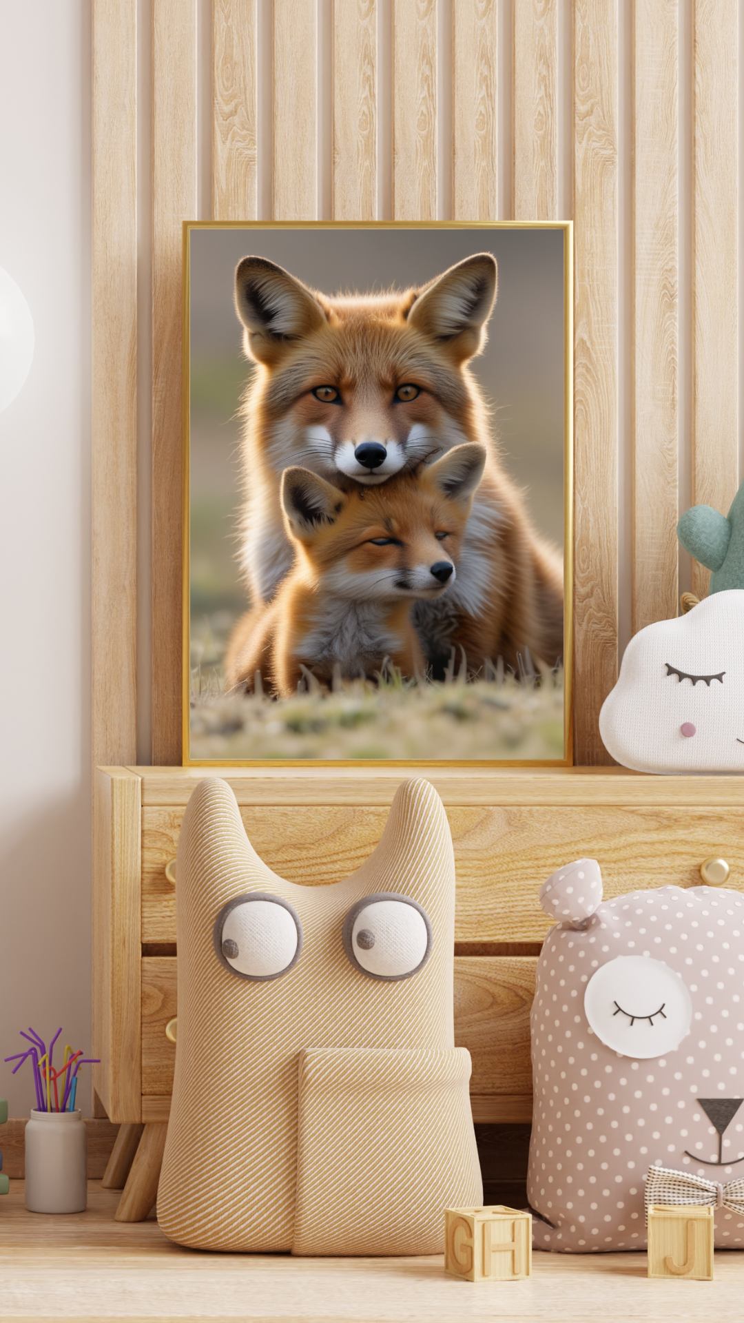 The framed fox portrait brings warmth, tenderness, and a touch of the outdoors into your space without feeling rustic or loud. With its soft, natural tones and gentle subject—a parent fox nestled close to its young—it adds an instant sense of comfort and connection. It works beautifully in a bedroom as a calming, cozy focal point, or in a living room where it can soften the space and spark conversation. Styled on a shelf or dresser, it pairs effortlessly with light wood, neutral palettes, and minimalist decor, making the room feel more inviting and lived-in without trying too hard.
