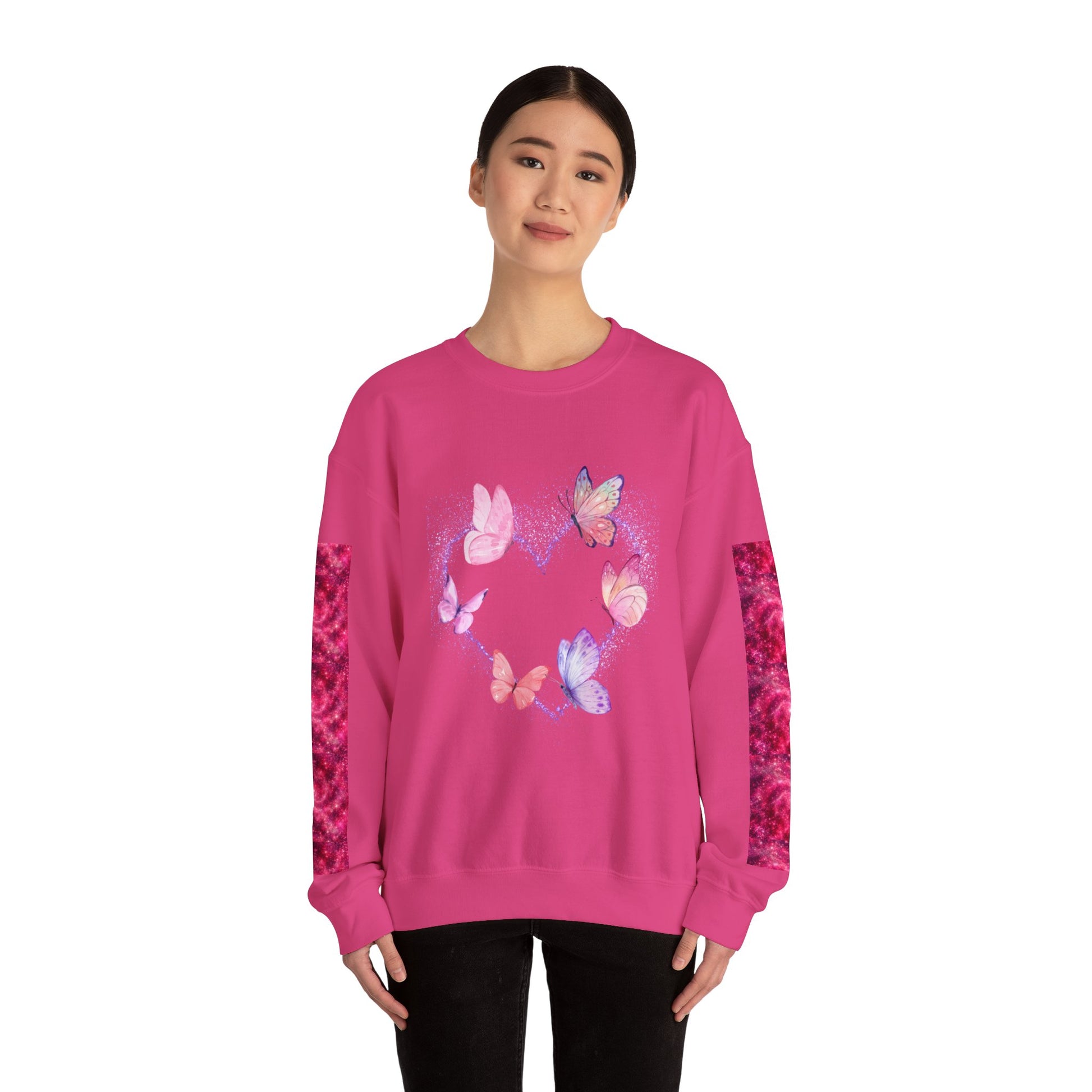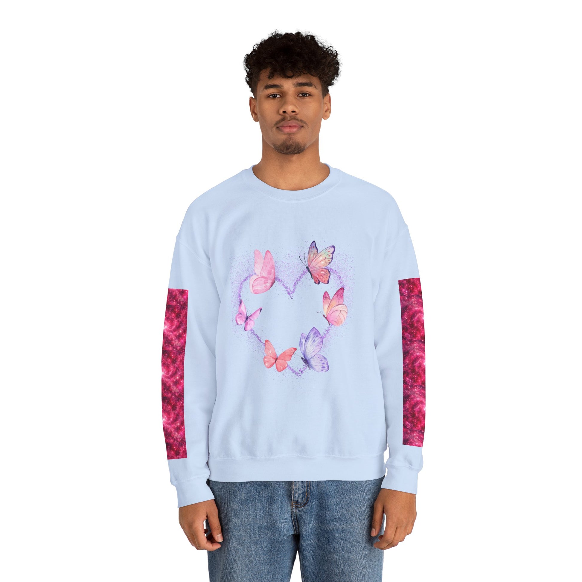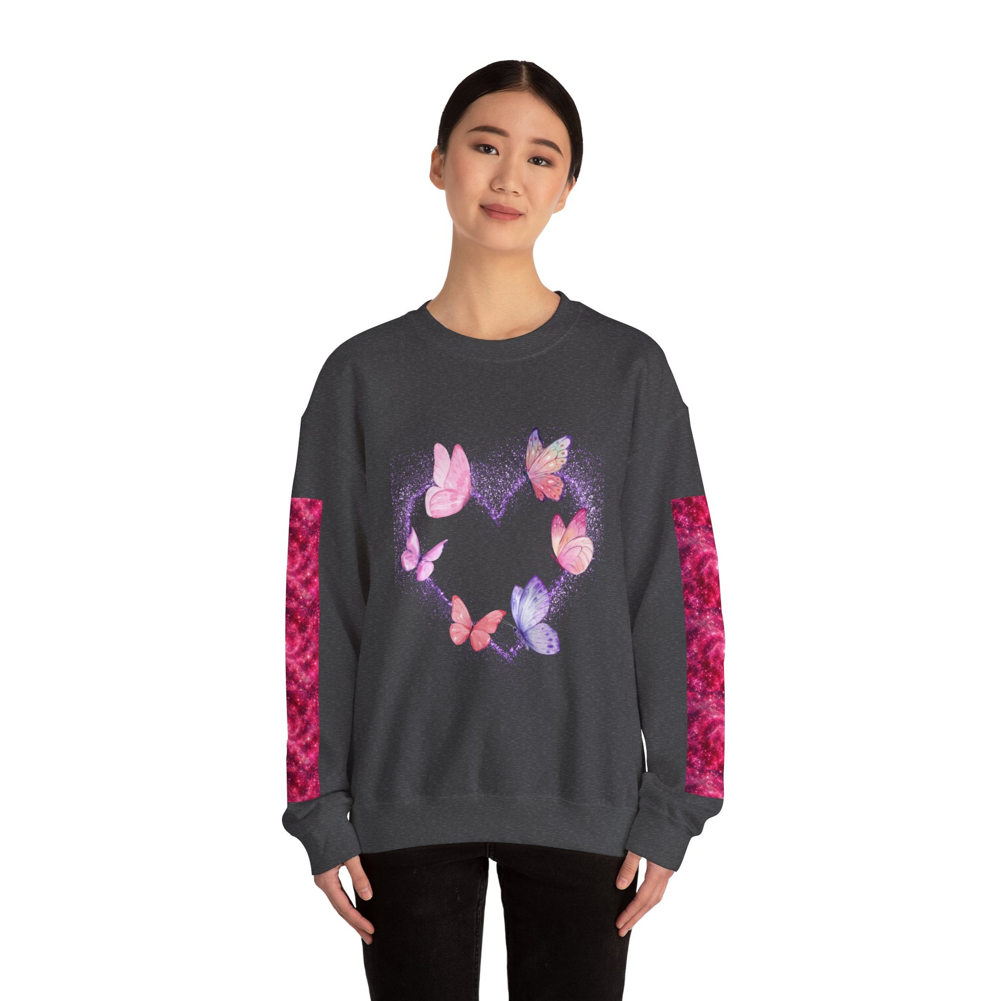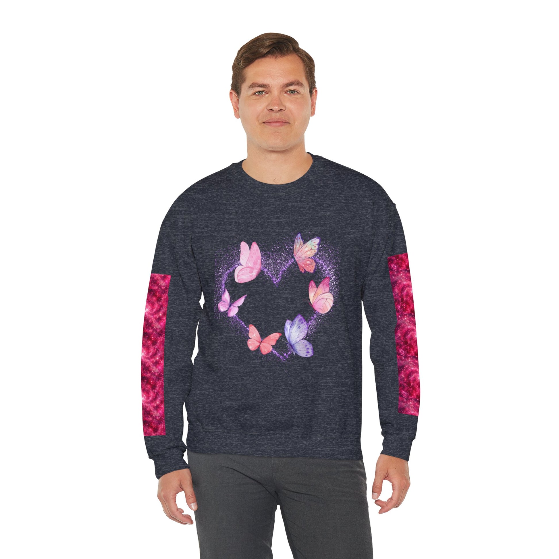 A cozy and stylish unisex crewneck sweatshirt featuring a butterfly heart design perfect for Valentine's Day. Made with a medium-heavy fabric blend of 50% cotton and 50% polyester for a comfy wearing experience. Suitable for adults, this sweatshirt is perfect for those colder months and adds a touch of love to your wardrobe. Ideal for Valentine's Day celebrations.