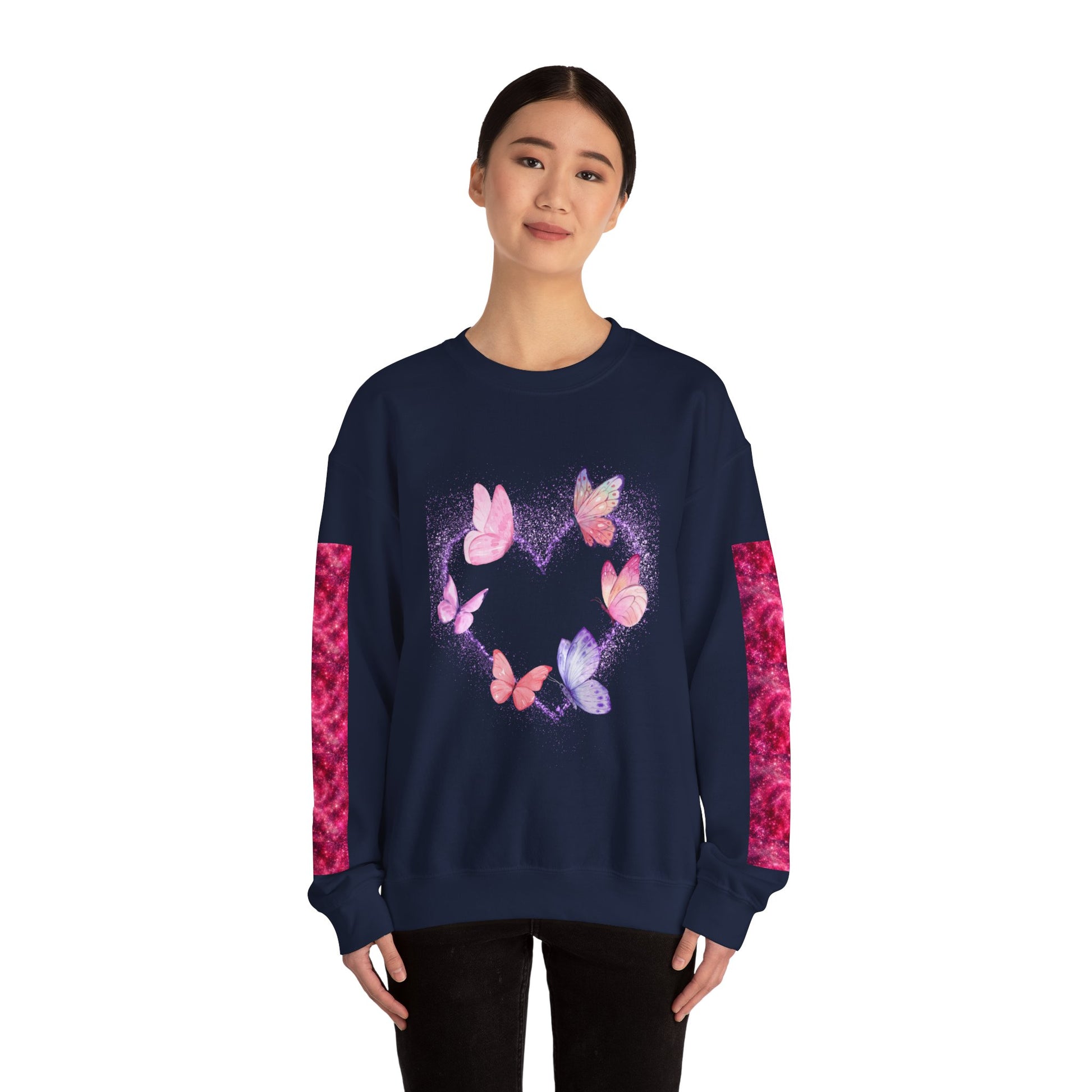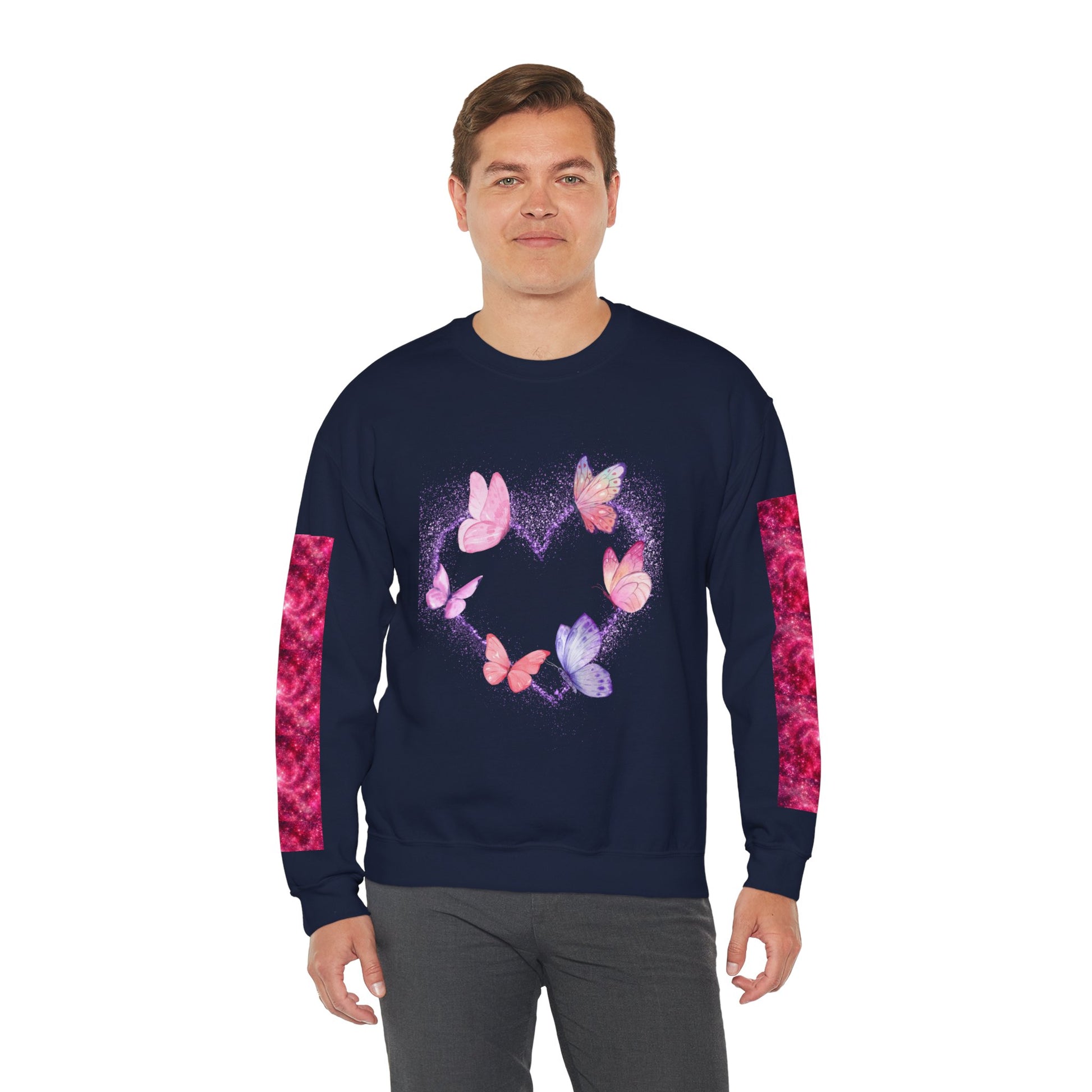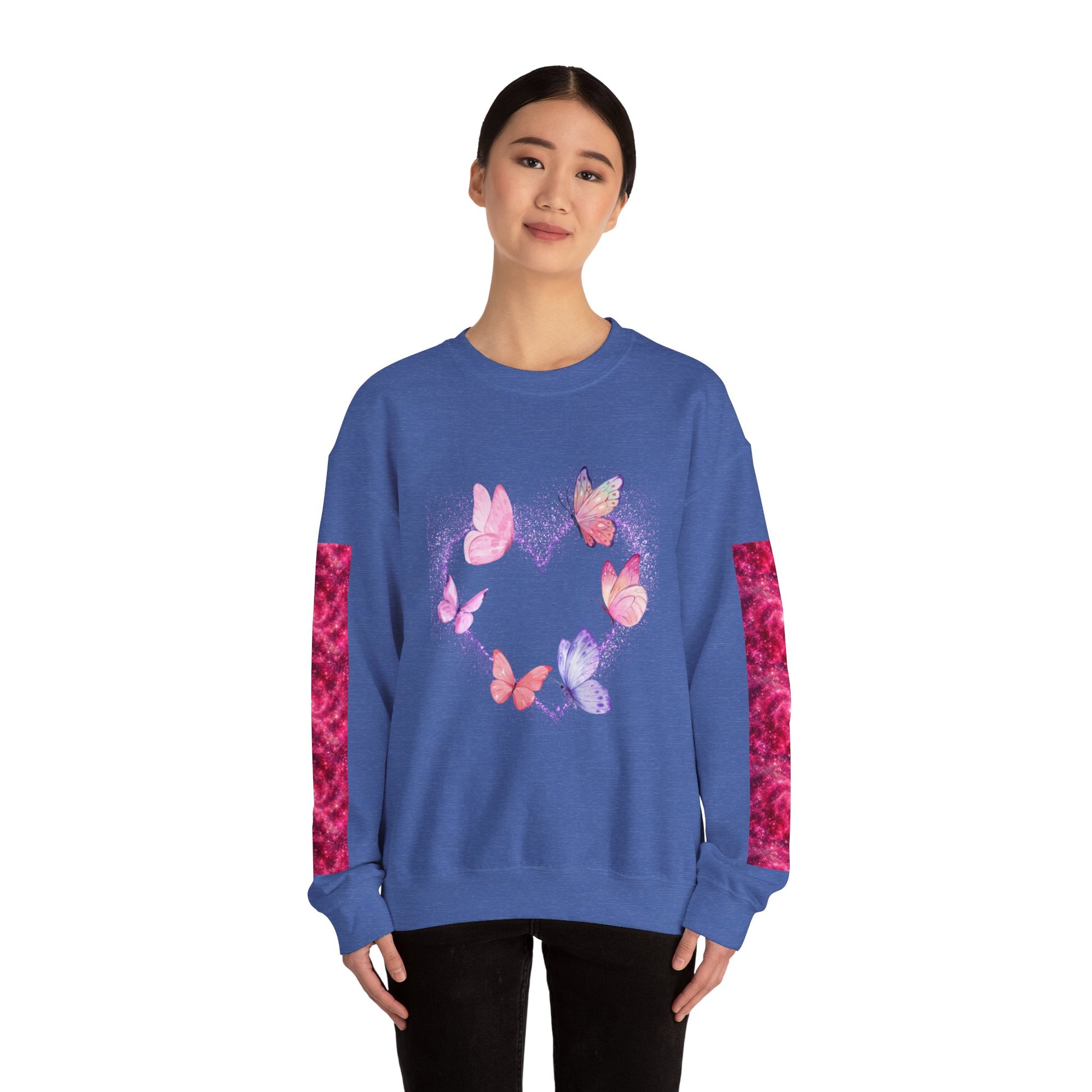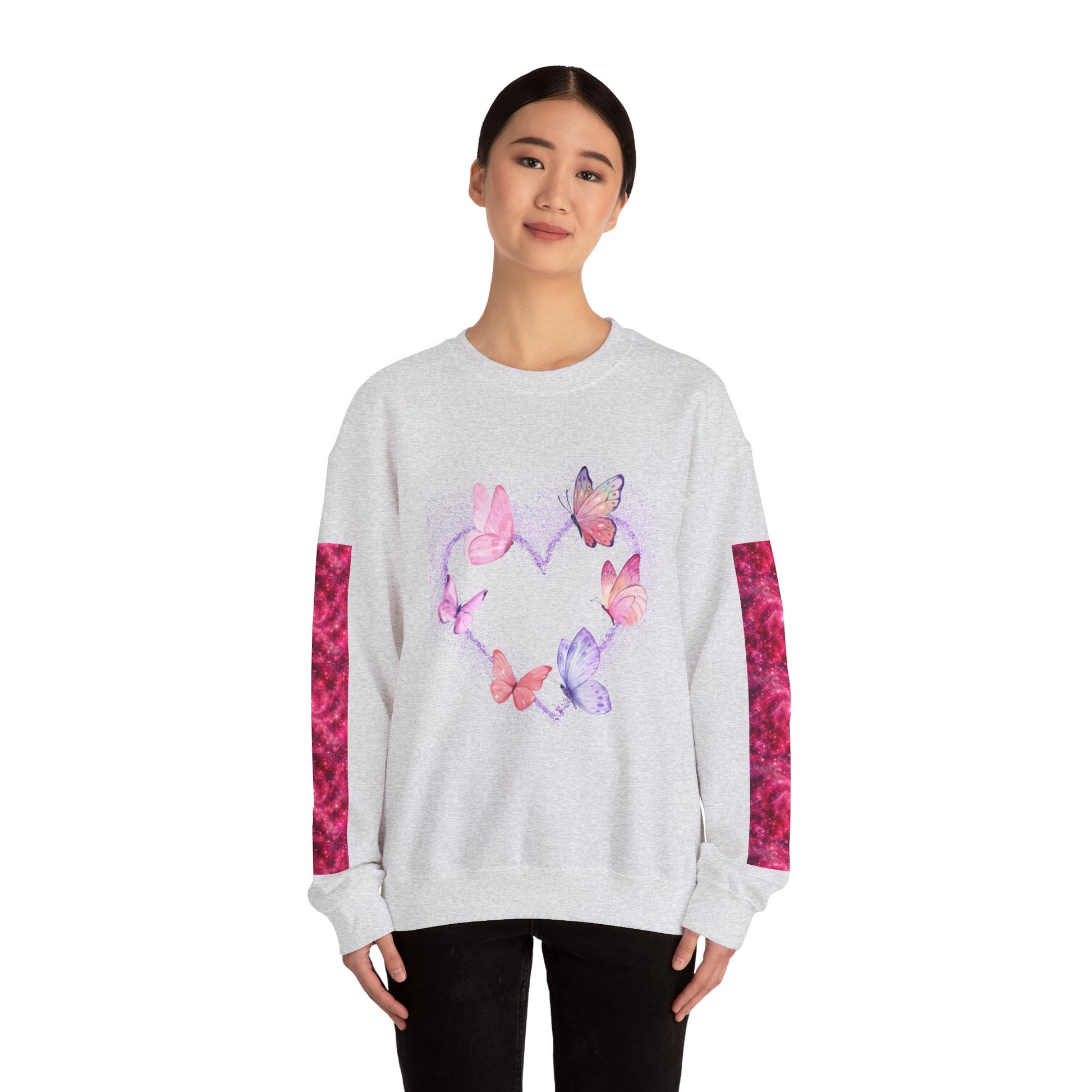 A cozy and stylish unisex crewneck sweatshirt featuring a butterfly heart design perfect for Valentine's Day. Made with a medium-heavy fabric blend of 50% cotton and 50% polyester for a comfy wearing experience. Suitable for adults, this sweatshirt is perfect for those colder months and adds a touch of love to your wardrobe. Ideal for Valentine's Day celebrations.