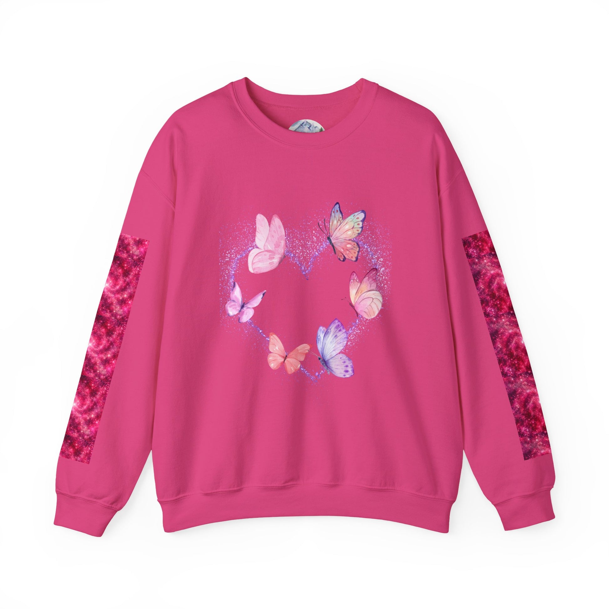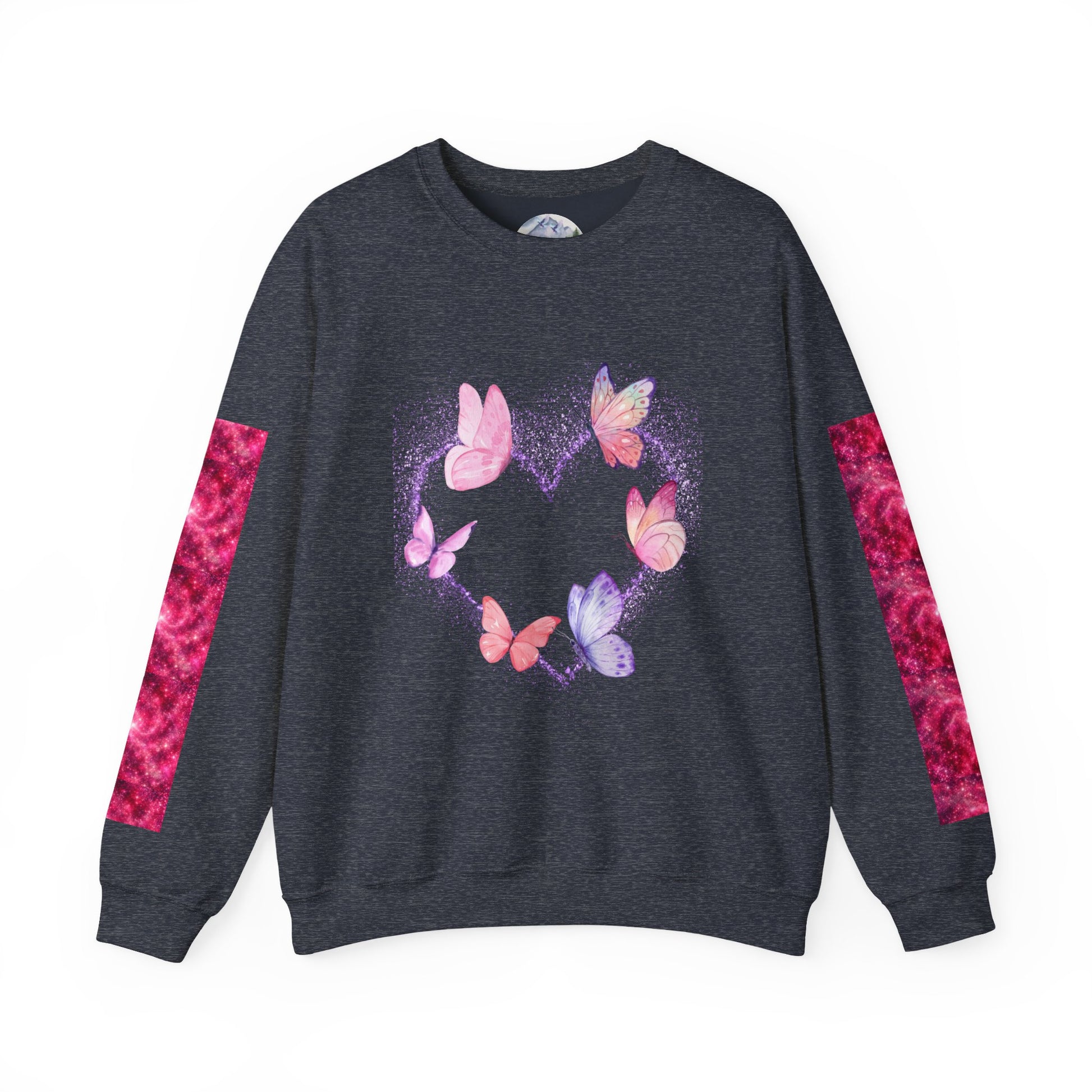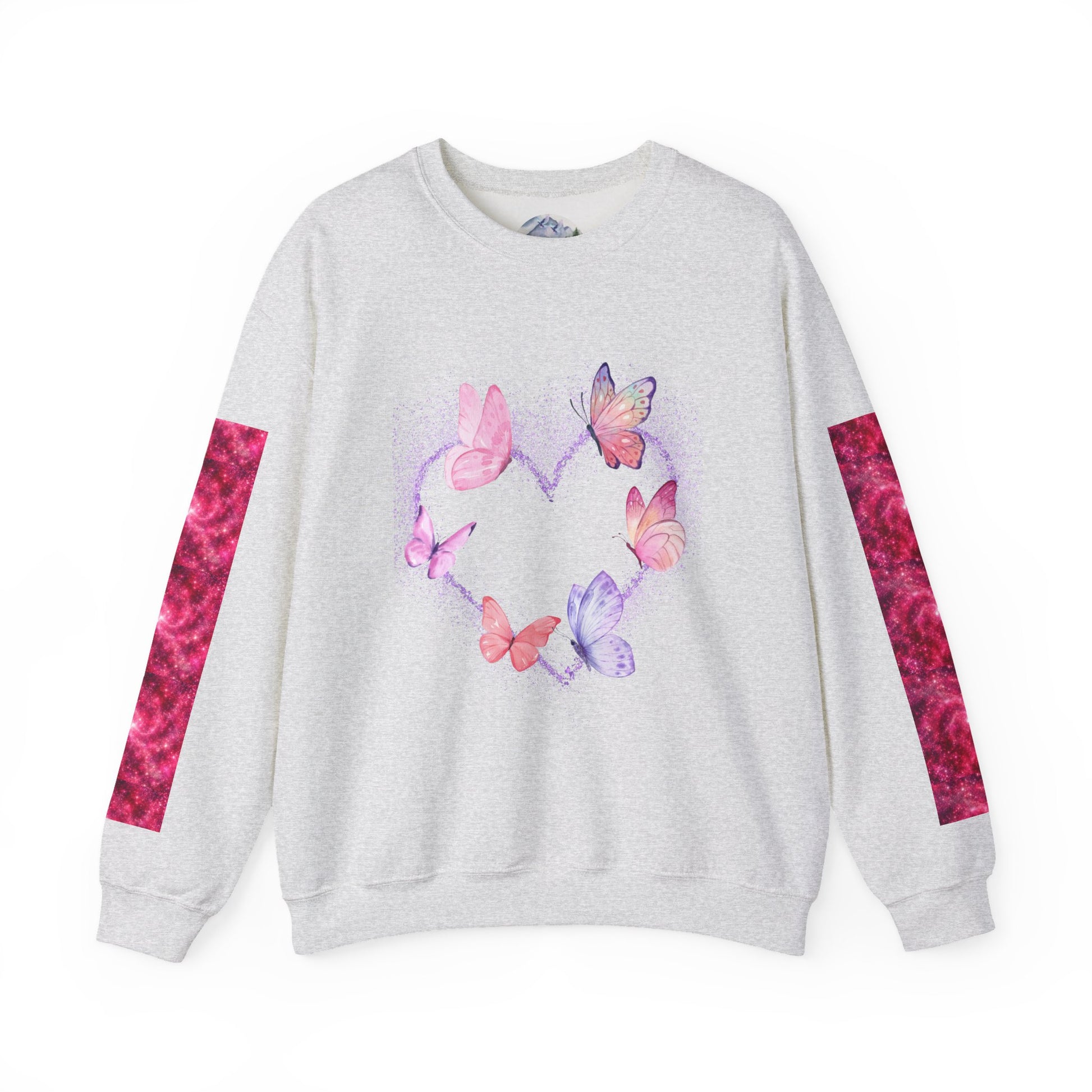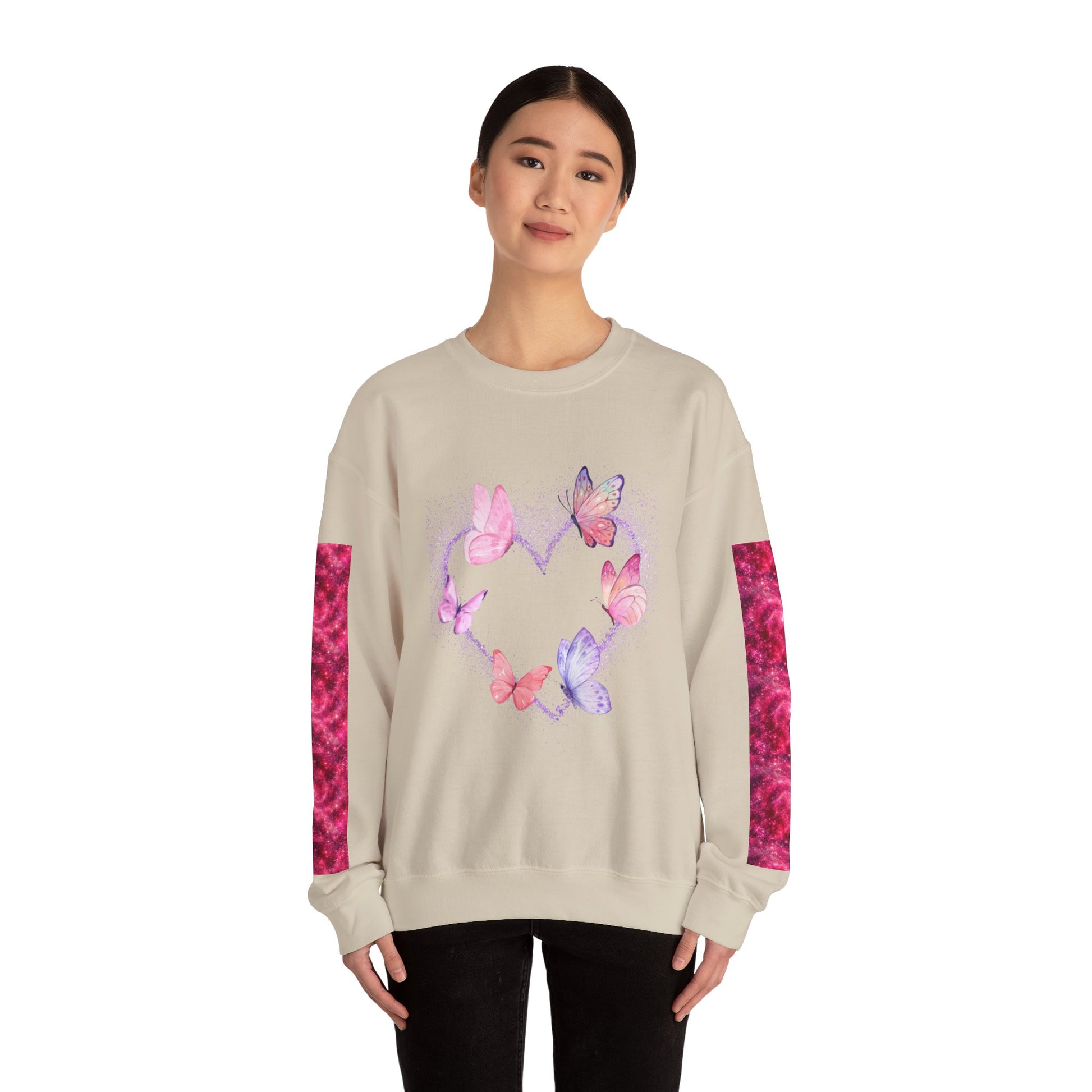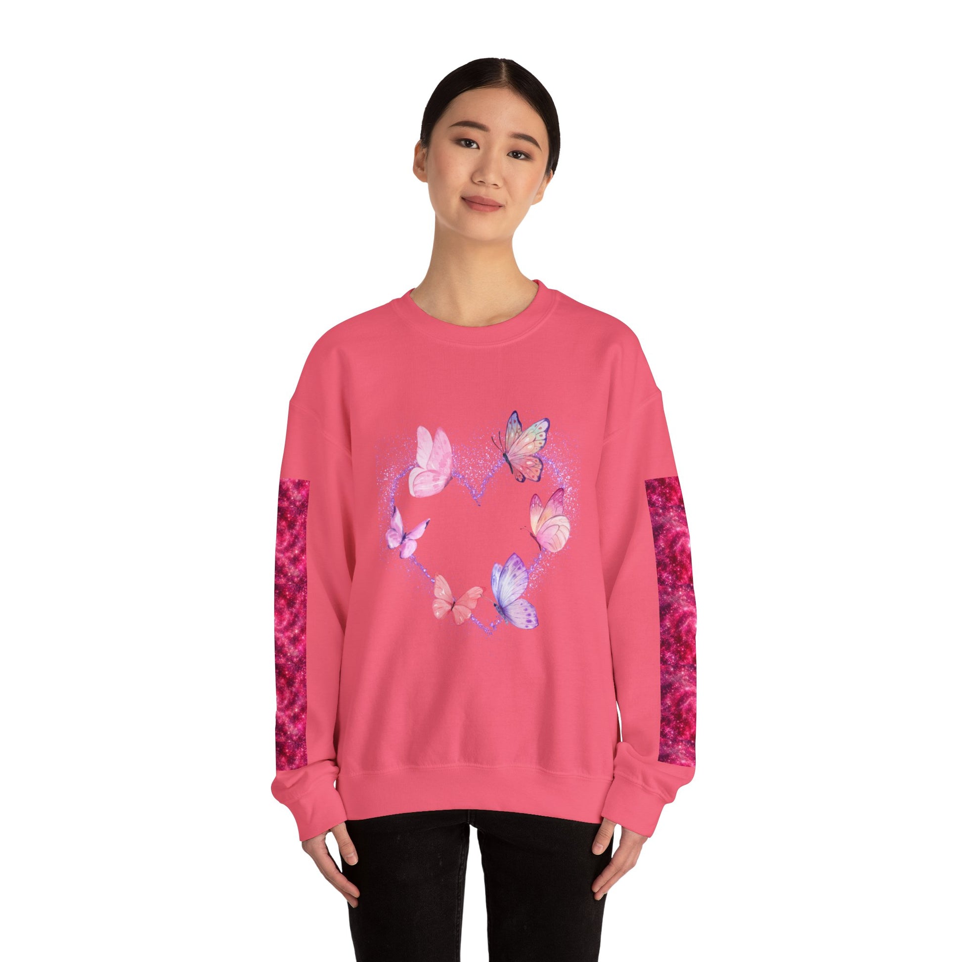 A cozy and stylish unisex crewneck sweatshirt featuring a butterfly heart design perfect for Valentine's Day. Made with a medium-heavy fabric blend of 50% cotton and 50% polyester for a comfy wearing experience. Suitable for adults, this sweatshirt is perfect for those colder months and adds a touch of love to your wardrobe. Ideal for Valentine's Day celebrations.
