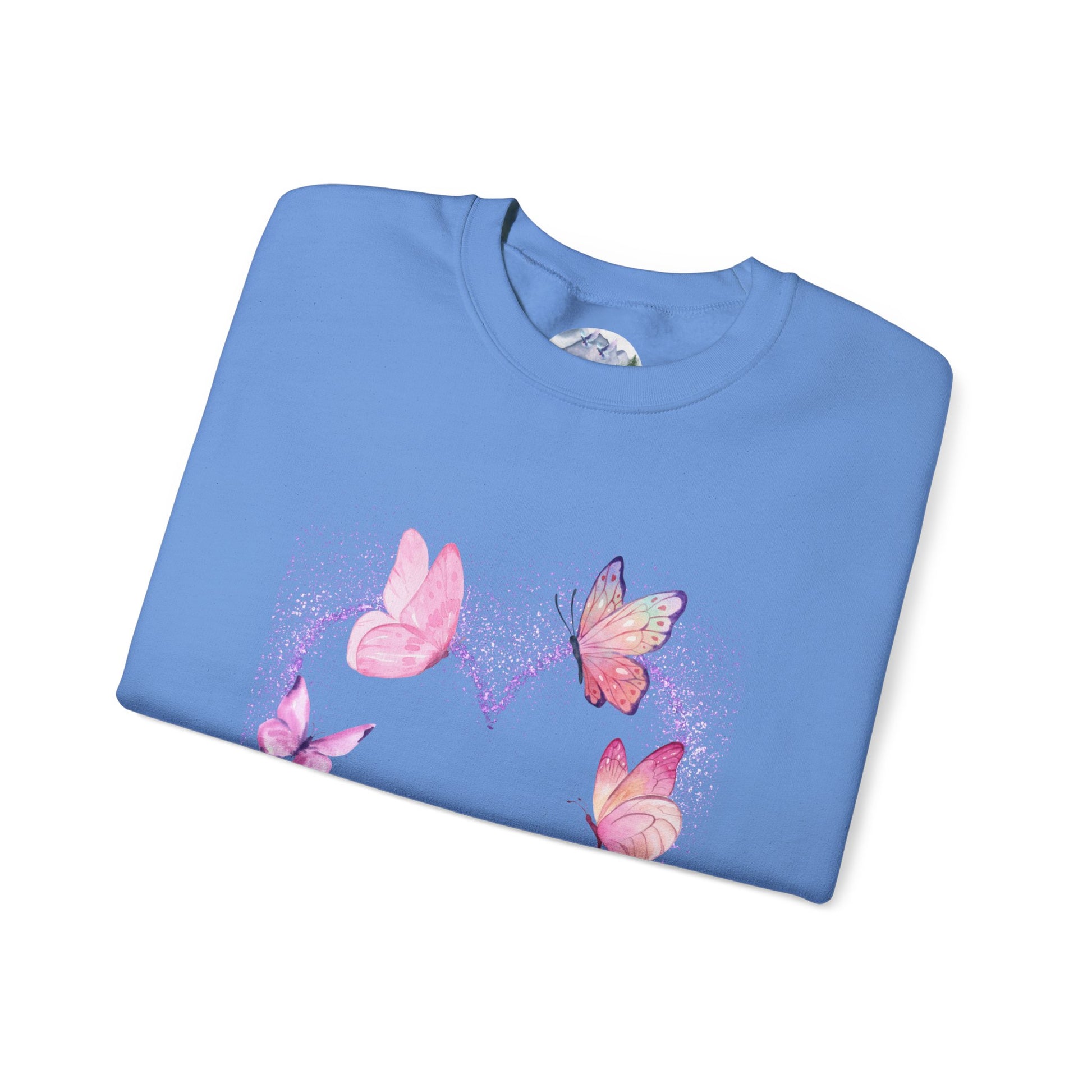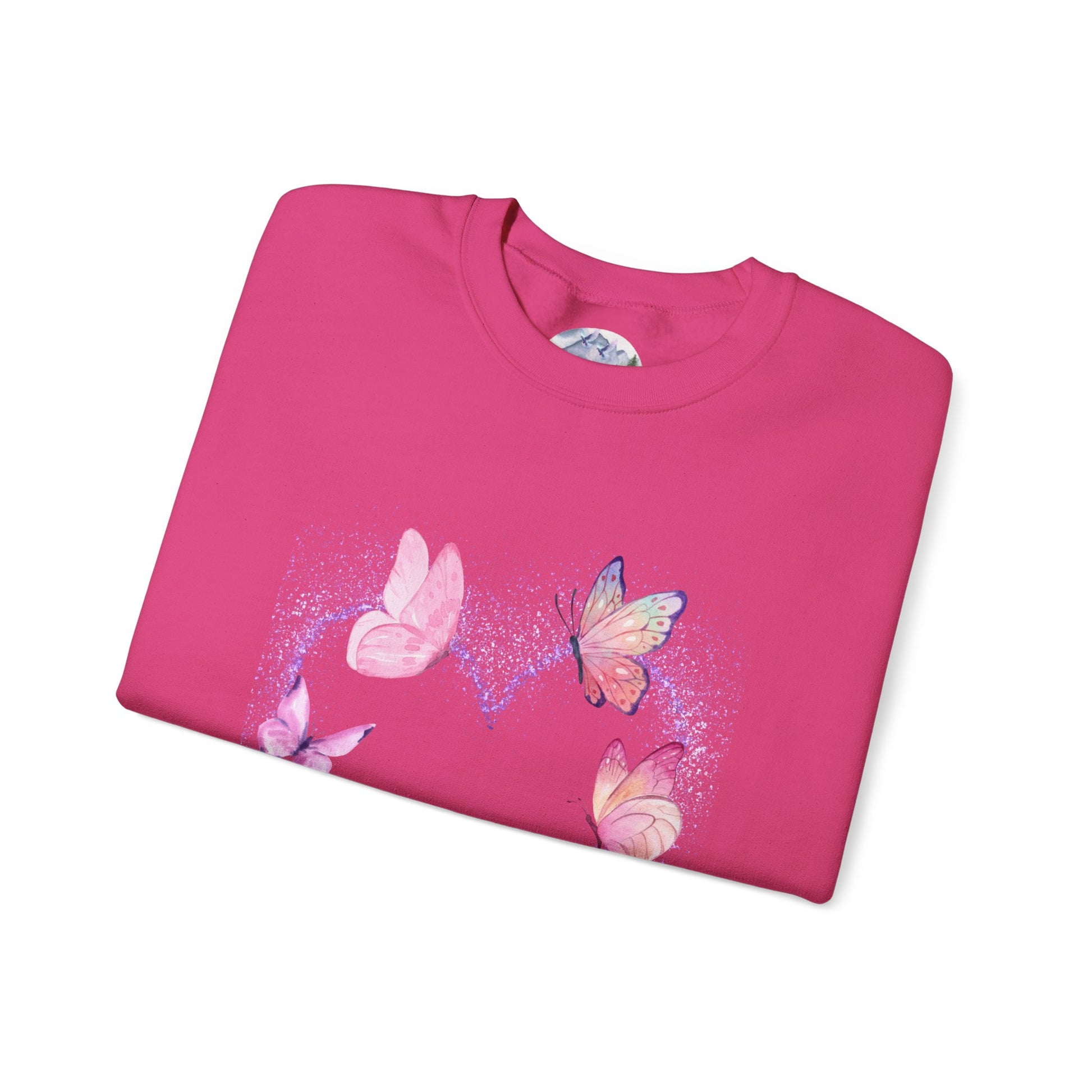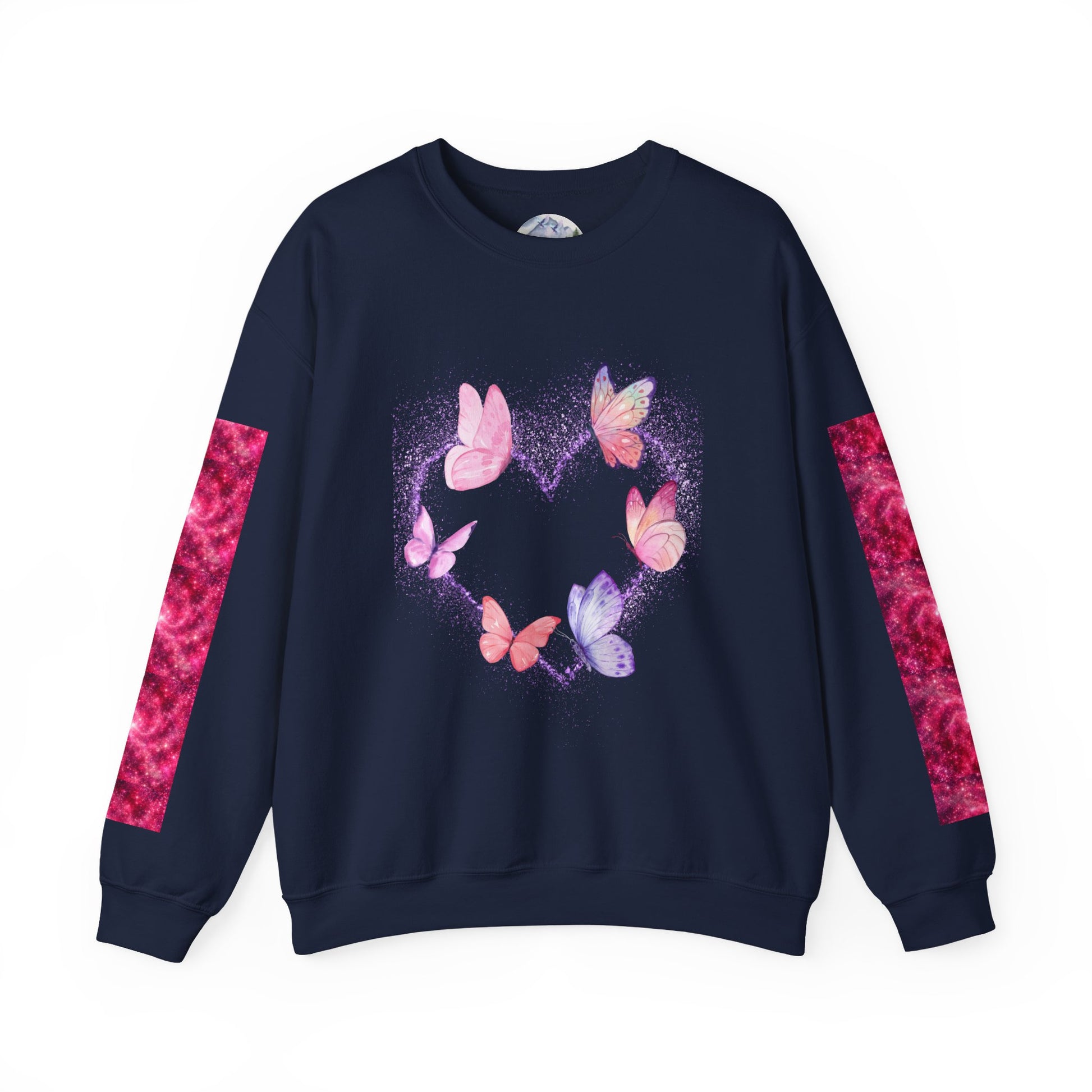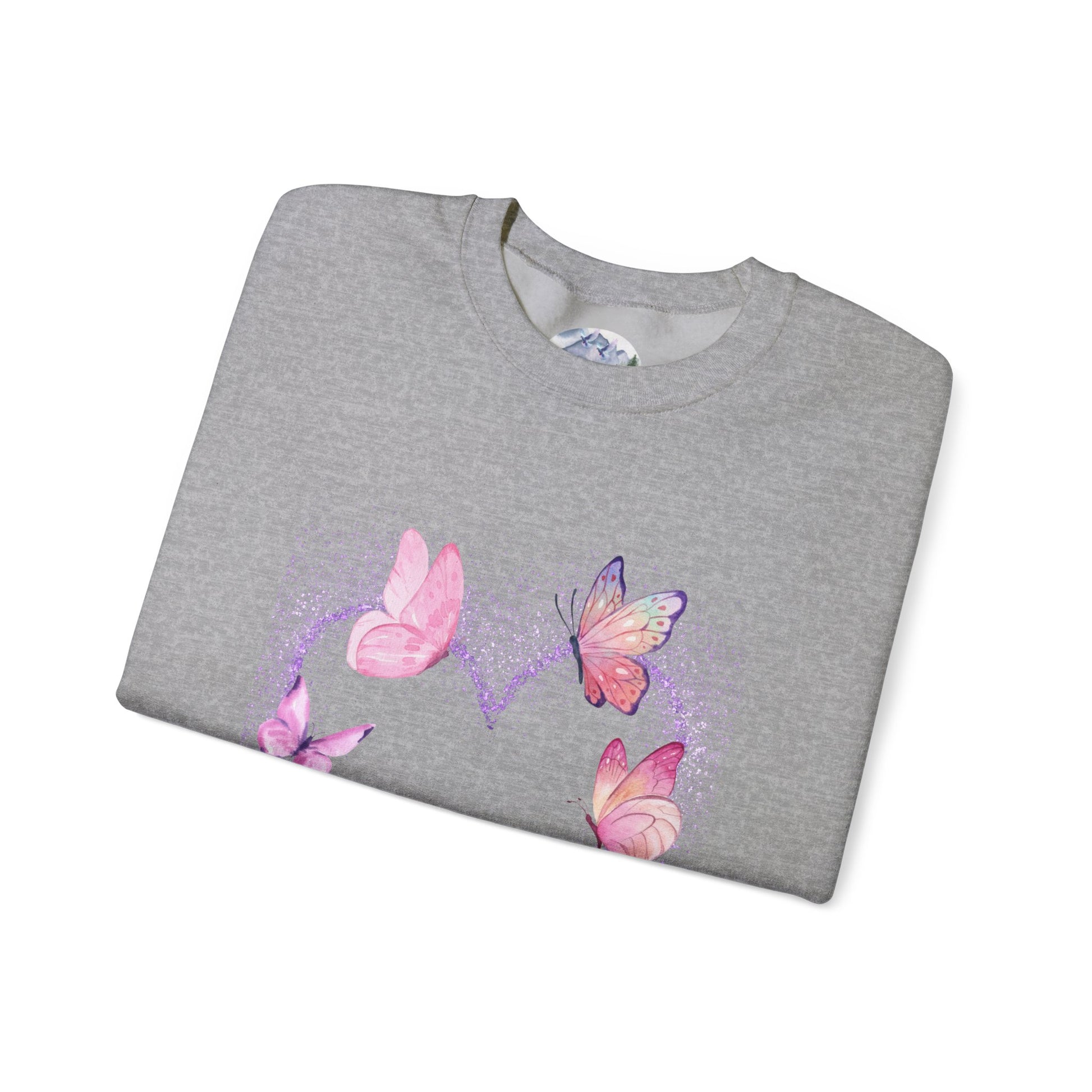 A cozy and stylish unisex crewneck sweatshirt featuring a butterfly heart design perfect for Valentine's Day. Made with a medium-heavy fabric blend of 50% cotton and 50% polyester for a comfy wearing experience. Suitable for adults, this sweatshirt is perfect for those colder months and adds a touch of love to your wardrobe. Ideal for Valentine's Day celebrations.