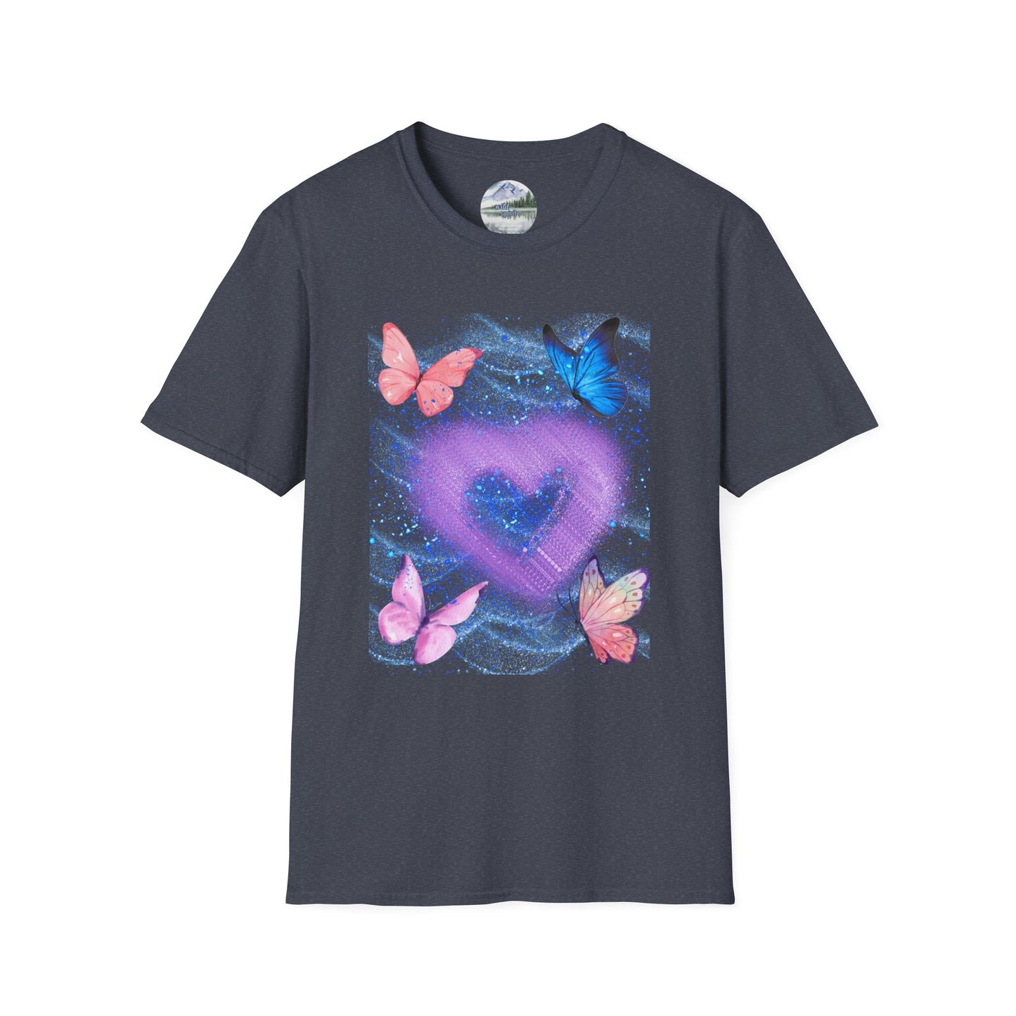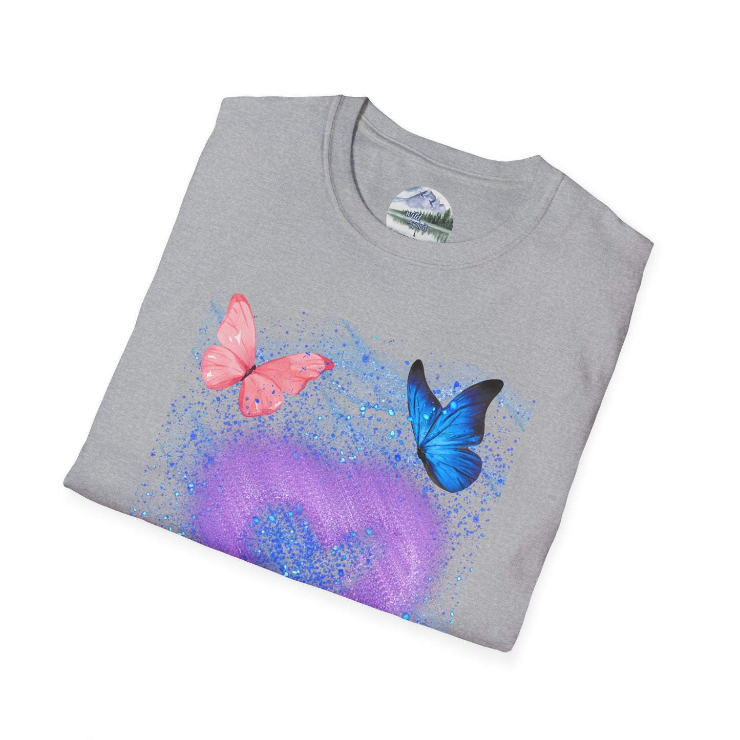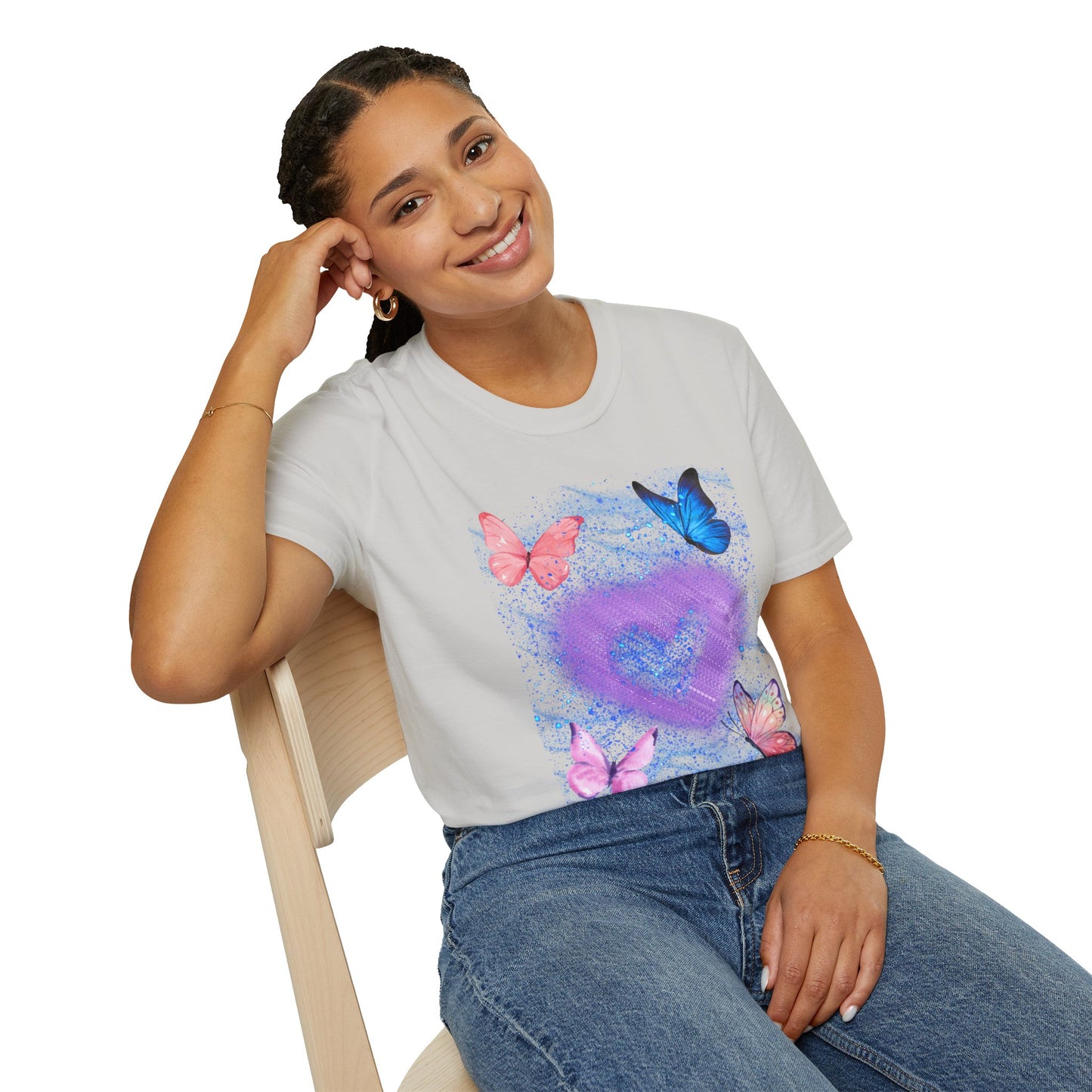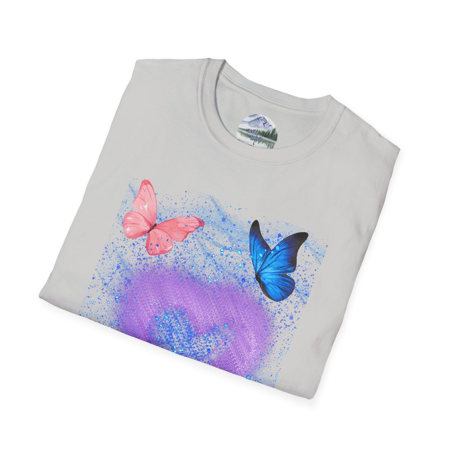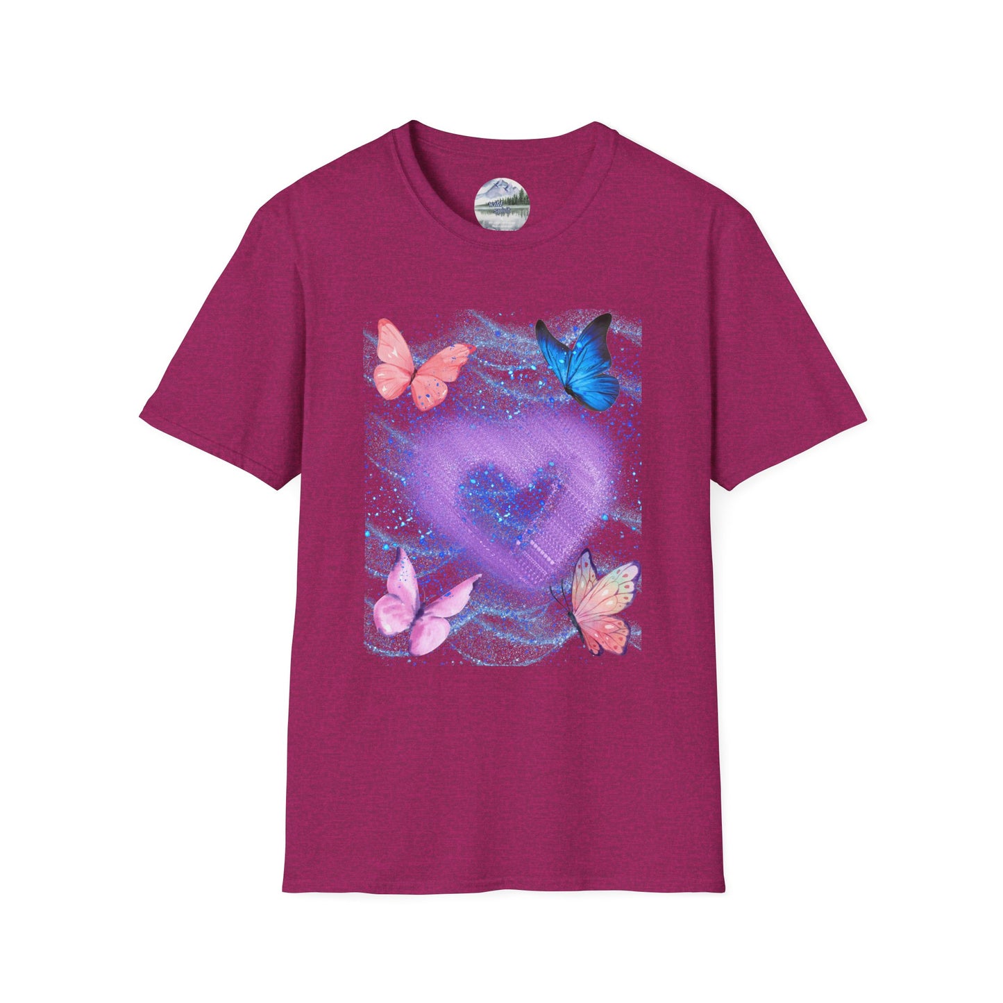 This unisex soft style T-Shirt features a Valentine's Day butterfly design. It exudes a romantic and whimsical vibe, perfect for celebrating Valentine's Day or as a thoughtful gift for a loved one. With its comfortable fabric and classic fit, this T-Shirt is suitable for adults looking for a versatile wardrobe staple.
