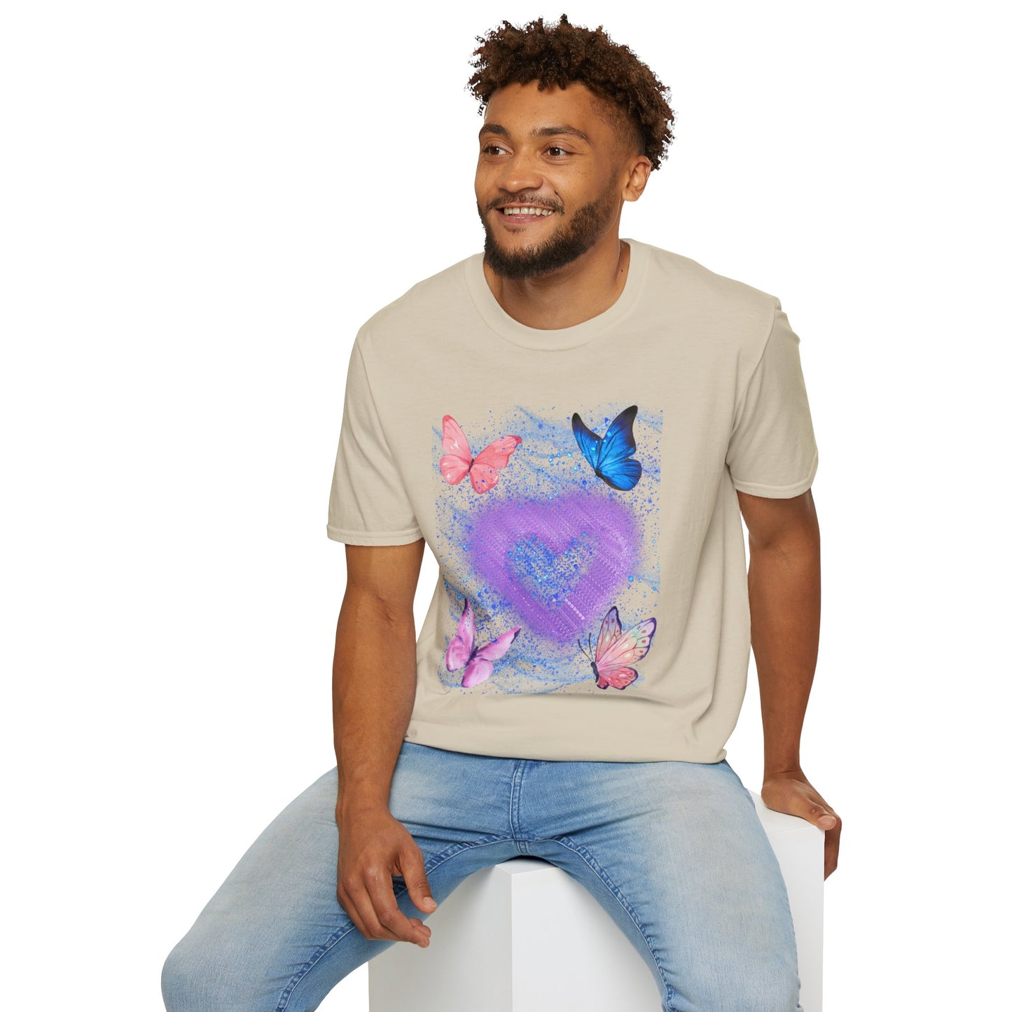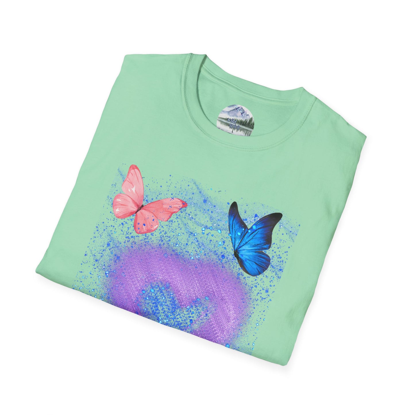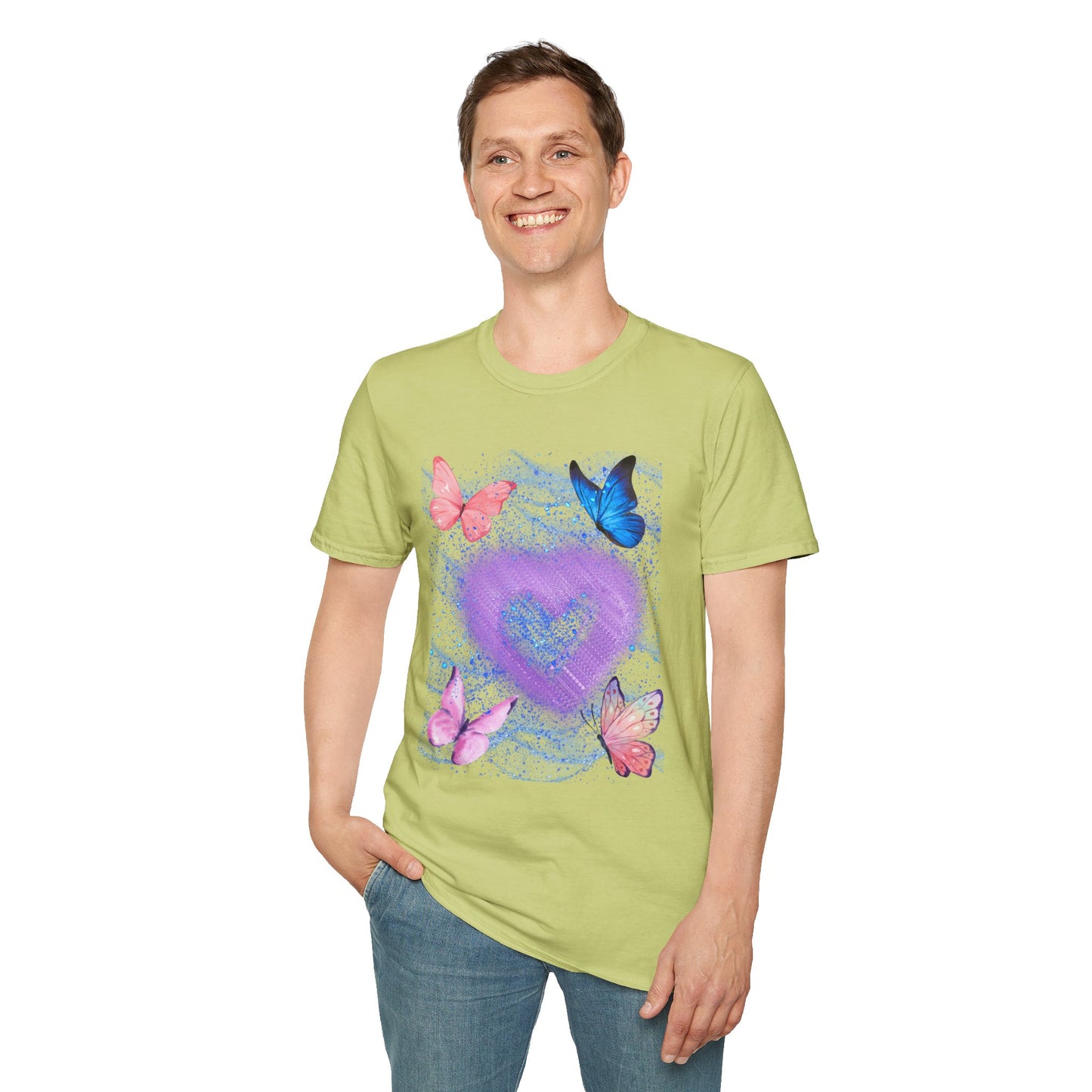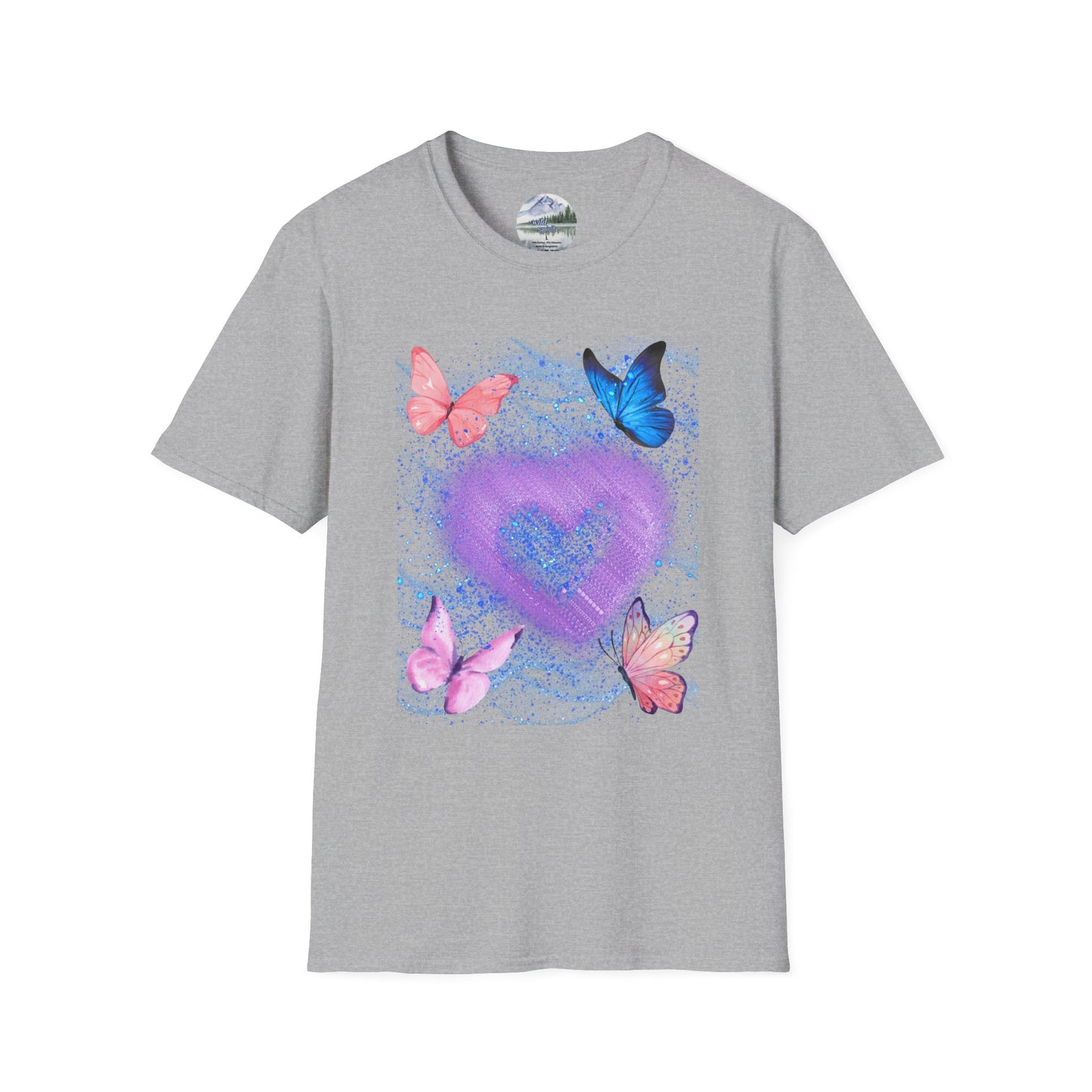 This unisex soft style T-Shirt features a Valentine's Day butterfly design. It exudes a romantic and whimsical vibe, perfect for celebrating Valentine's Day or as a thoughtful gift for a loved one. With its comfortable fabric and classic fit, this T-Shirt is suitable for adults looking for a versatile wardrobe staple.