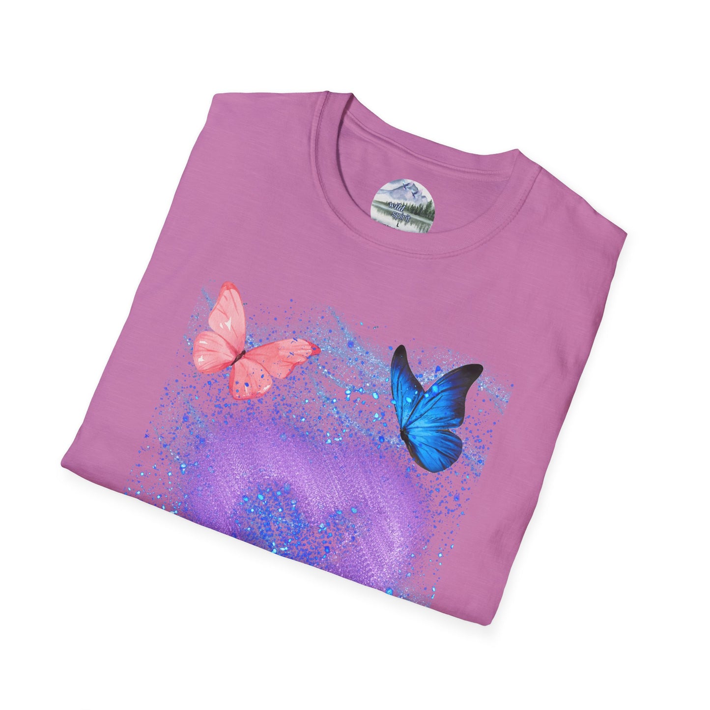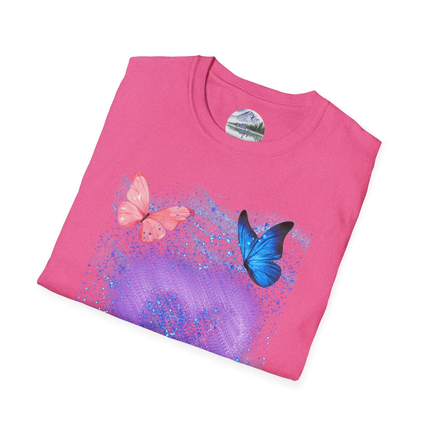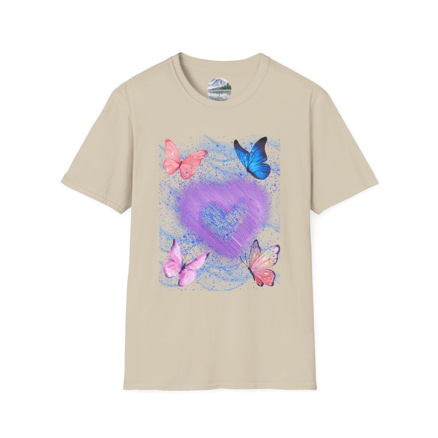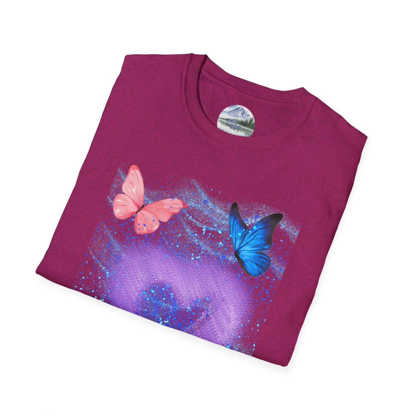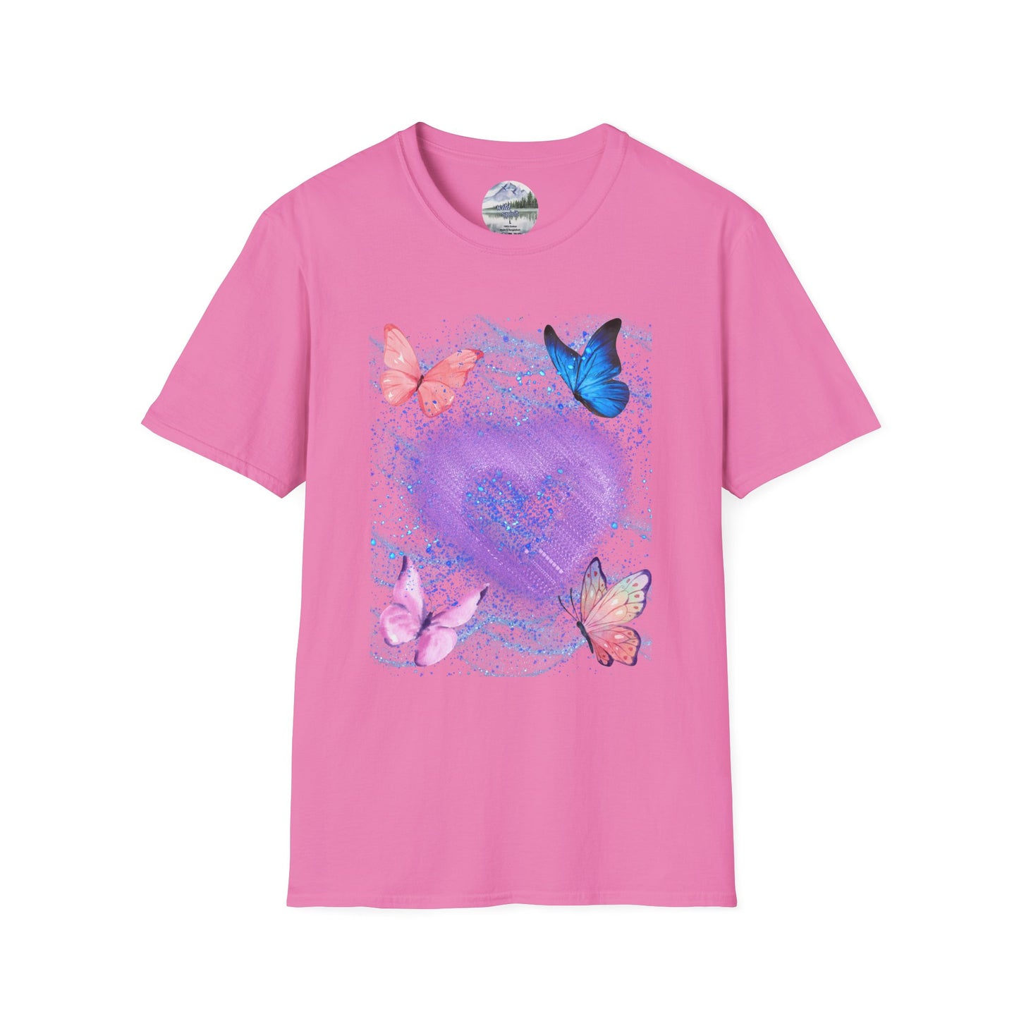 This unisex soft style T-Shirt features a Valentine's Day butterfly design. It exudes a romantic and whimsical vibe, perfect for celebrating Valentine's Day or as a thoughtful gift for a loved one. With its comfortable fabric and classic fit, this T-Shirt is suitable for adults looking for a versatile wardrobe staple.