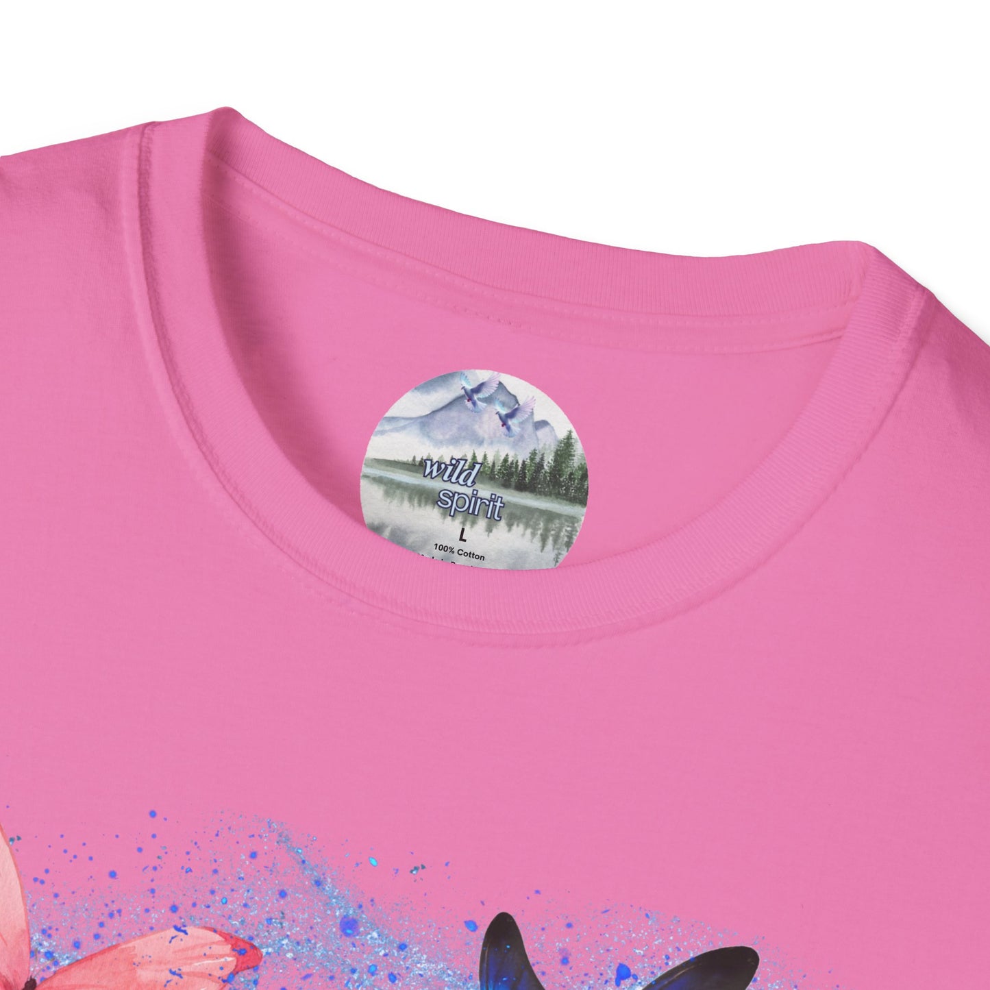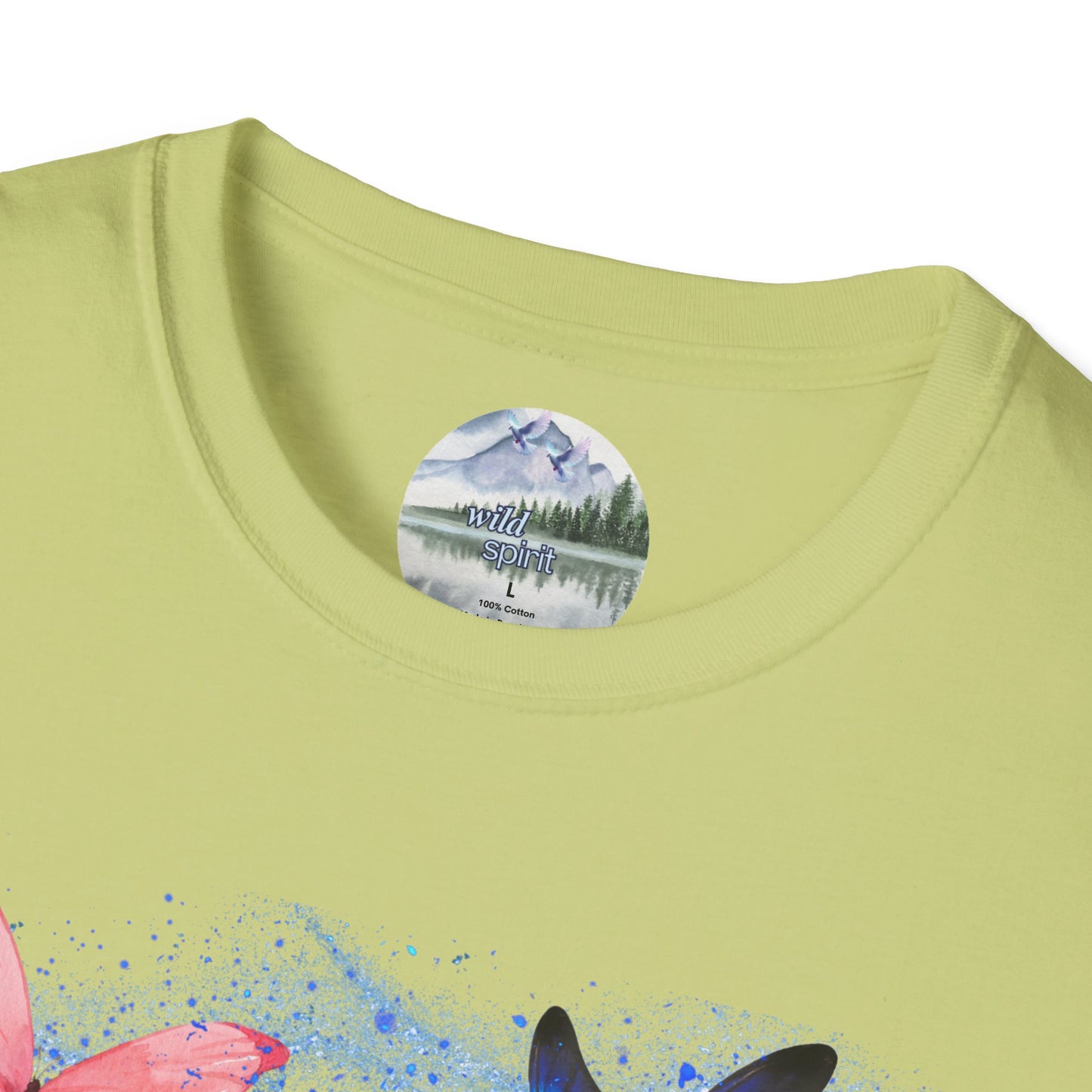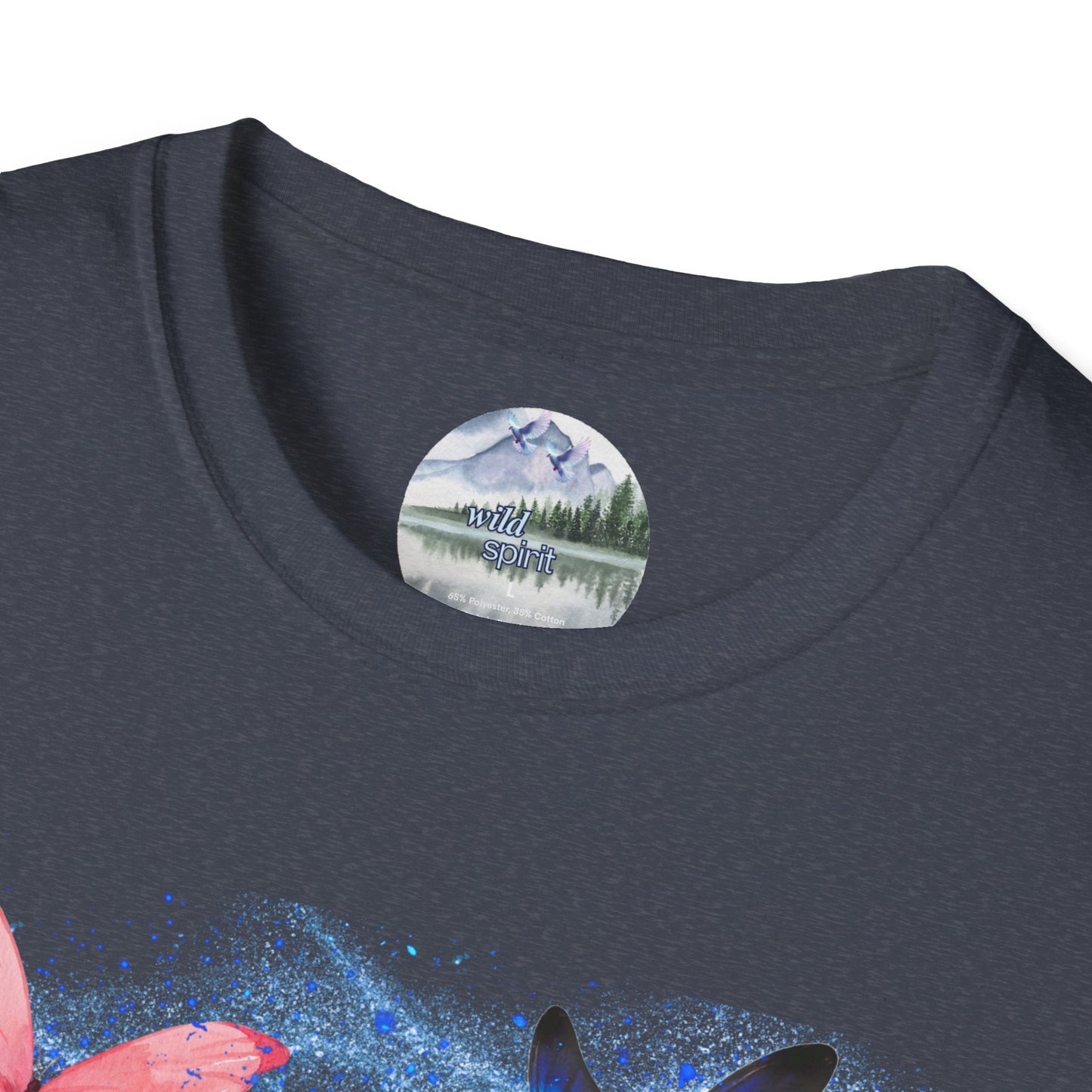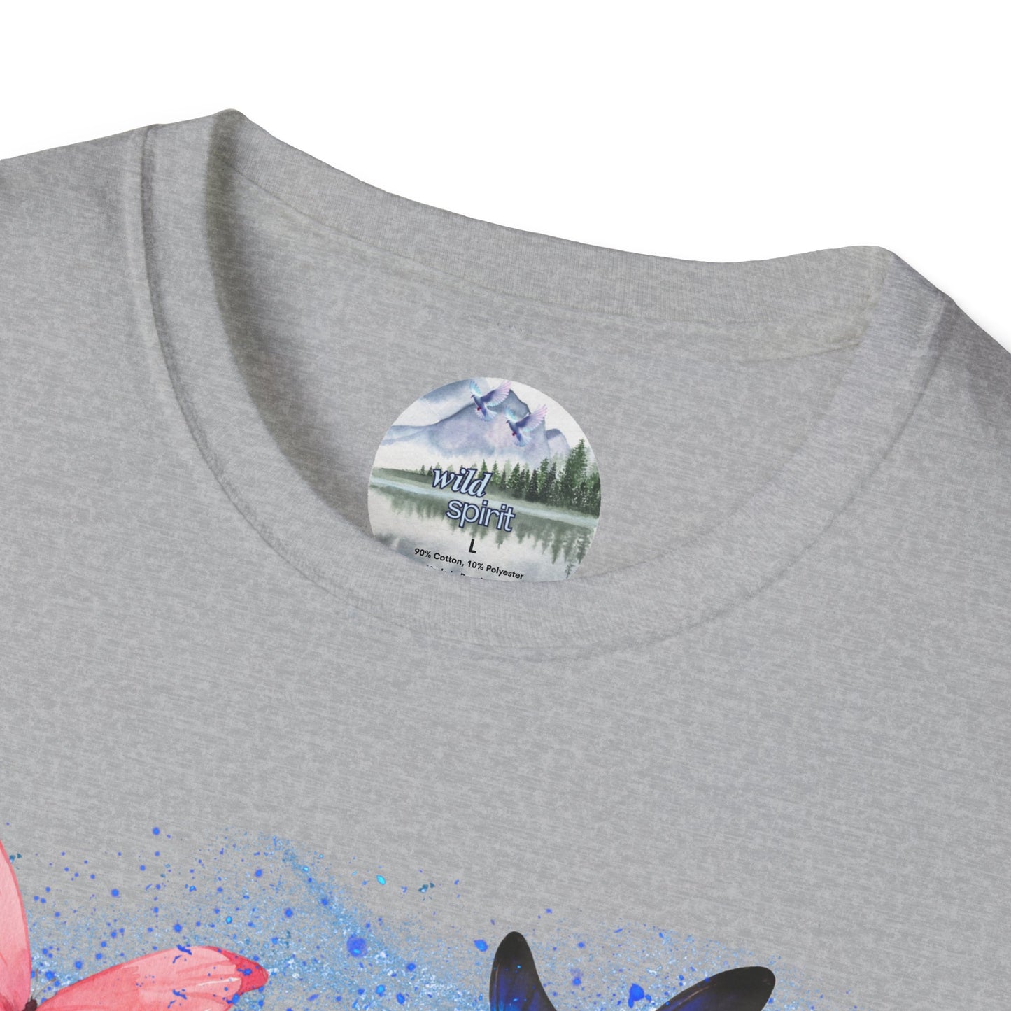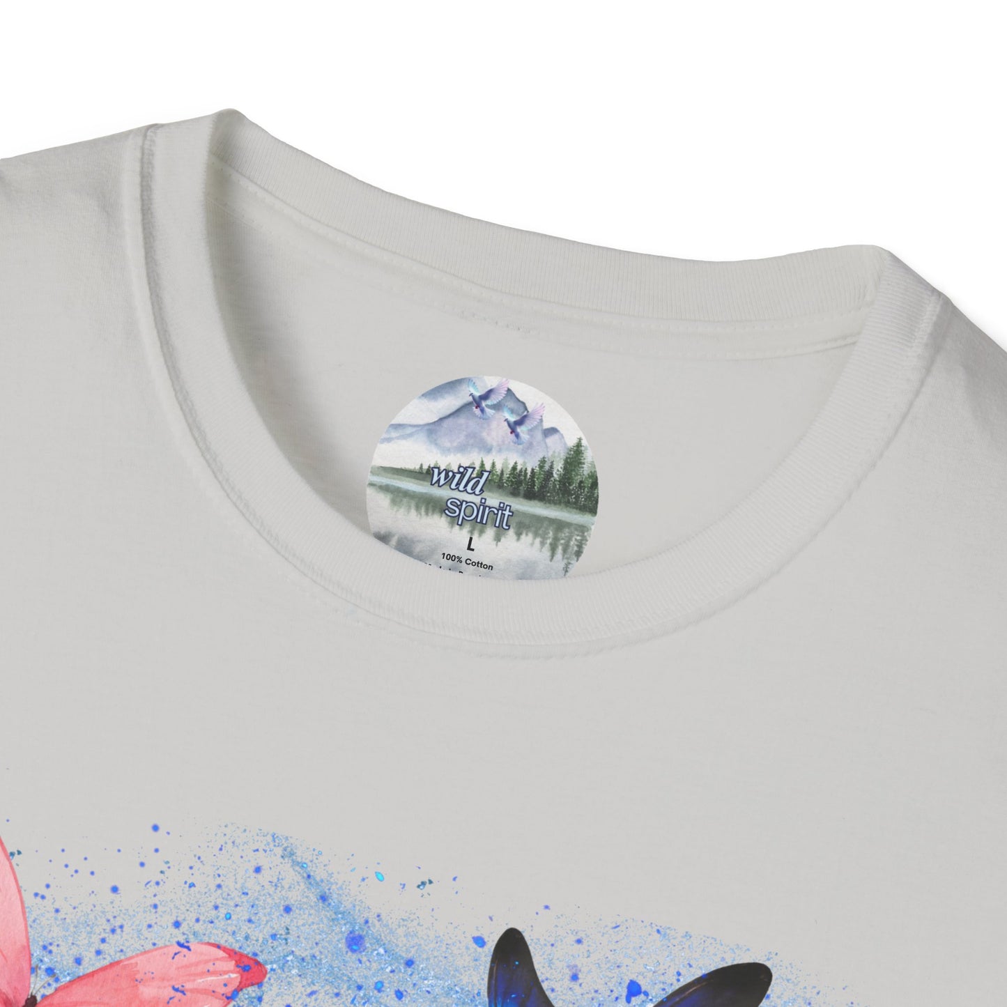 This unisex soft style T-Shirt features a Valentine's Day butterfly design. It exudes a romantic and whimsical vibe, perfect for celebrating Valentine's Day or as a thoughtful gift for a loved one. With its comfortable fabric and classic fit, this T-Shirt is suitable for adults looking for a versatile wardrobe staple.