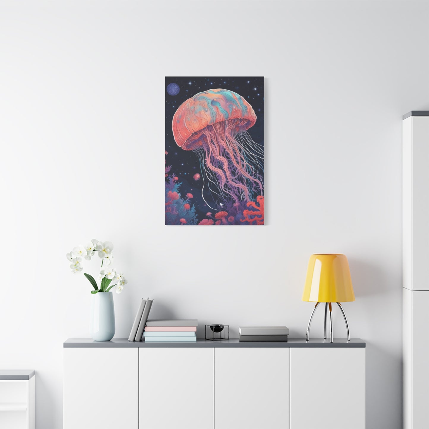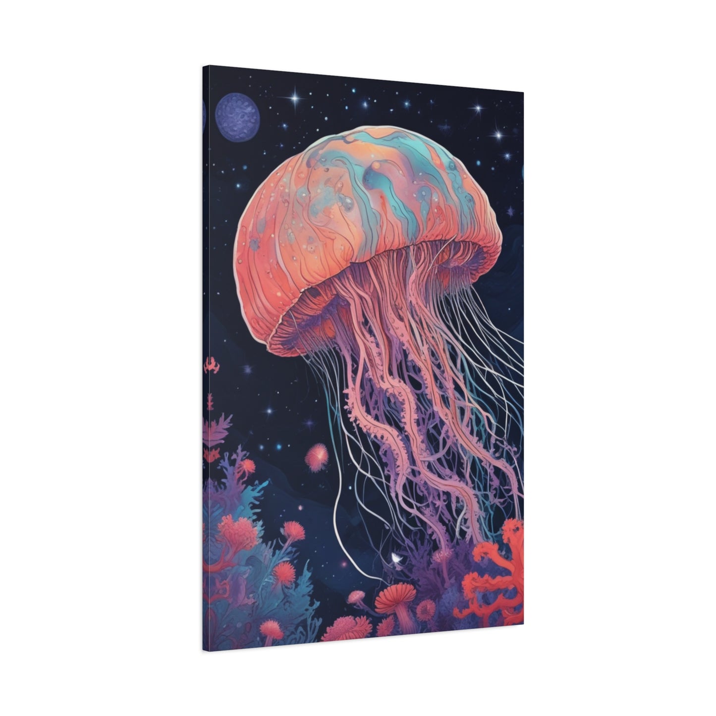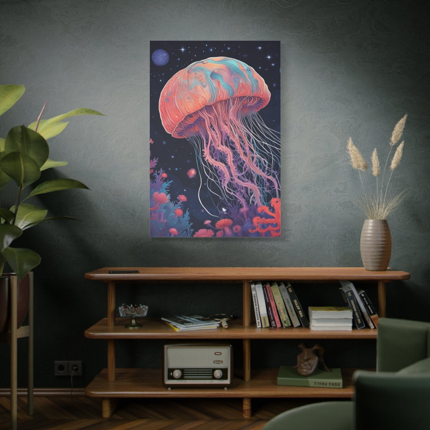 A stunning night sky jellyfish painting on a matte canvas, perfect for adding a touch of whimsy and creativity to any room. This unique artwork is relevant for art enthusiasts, nature lovers, and individuals looking to elevate their home decor. Ideal for gifting on birthdays, housewarmings, and holidays.