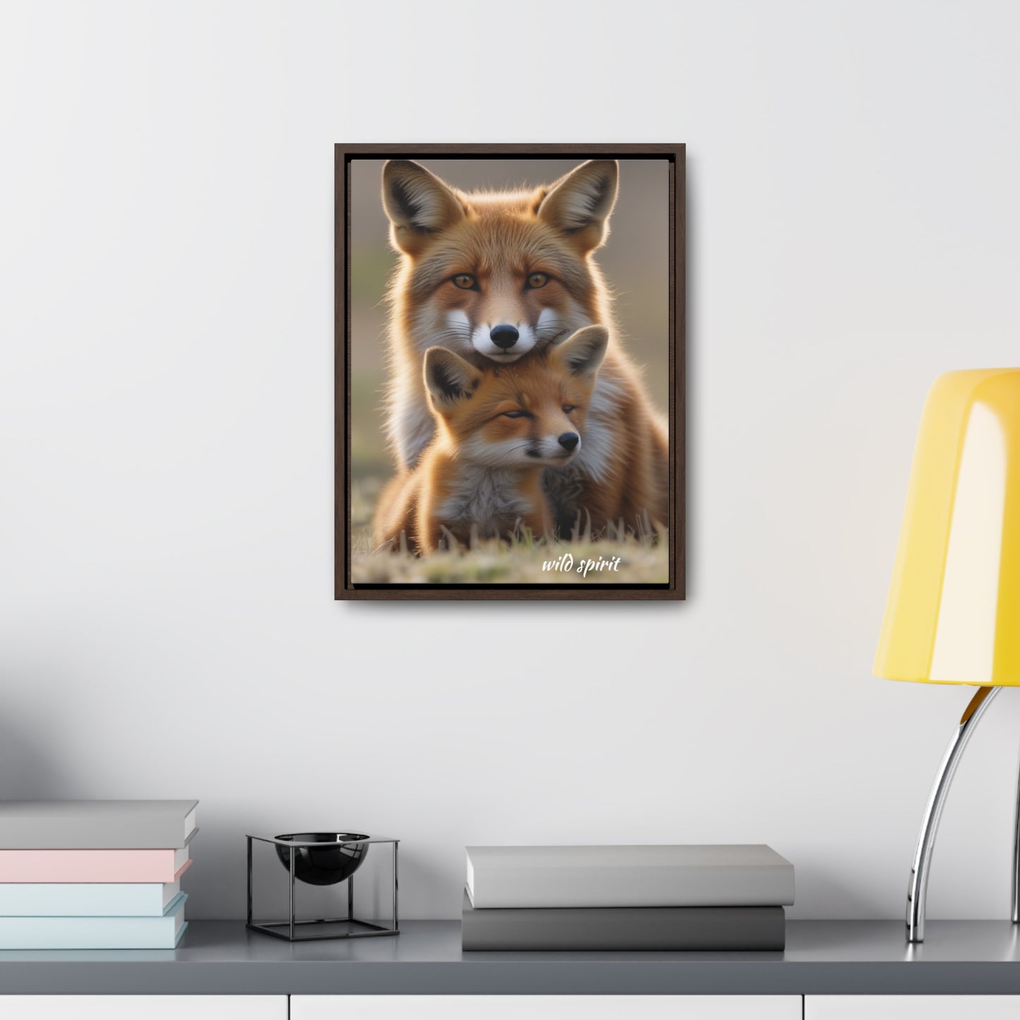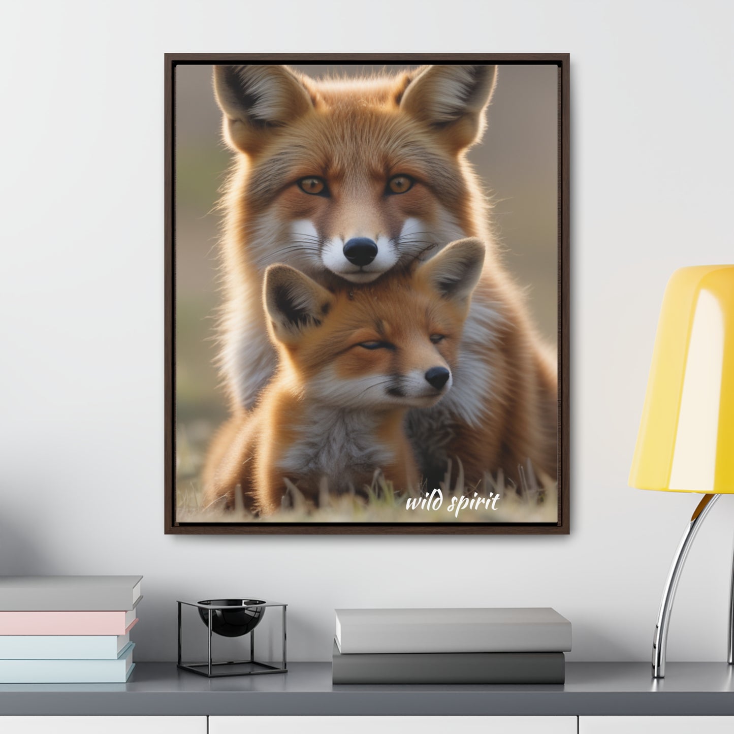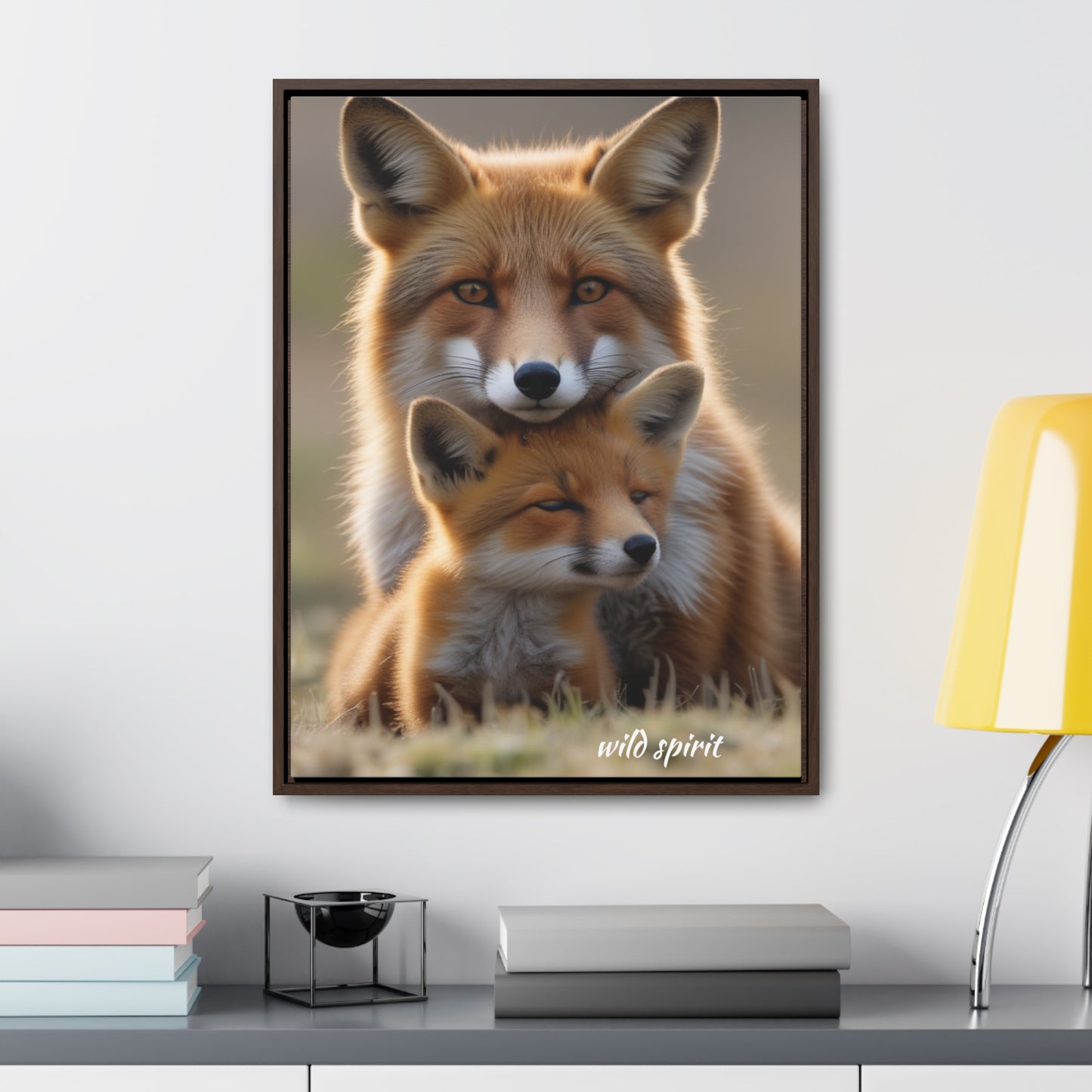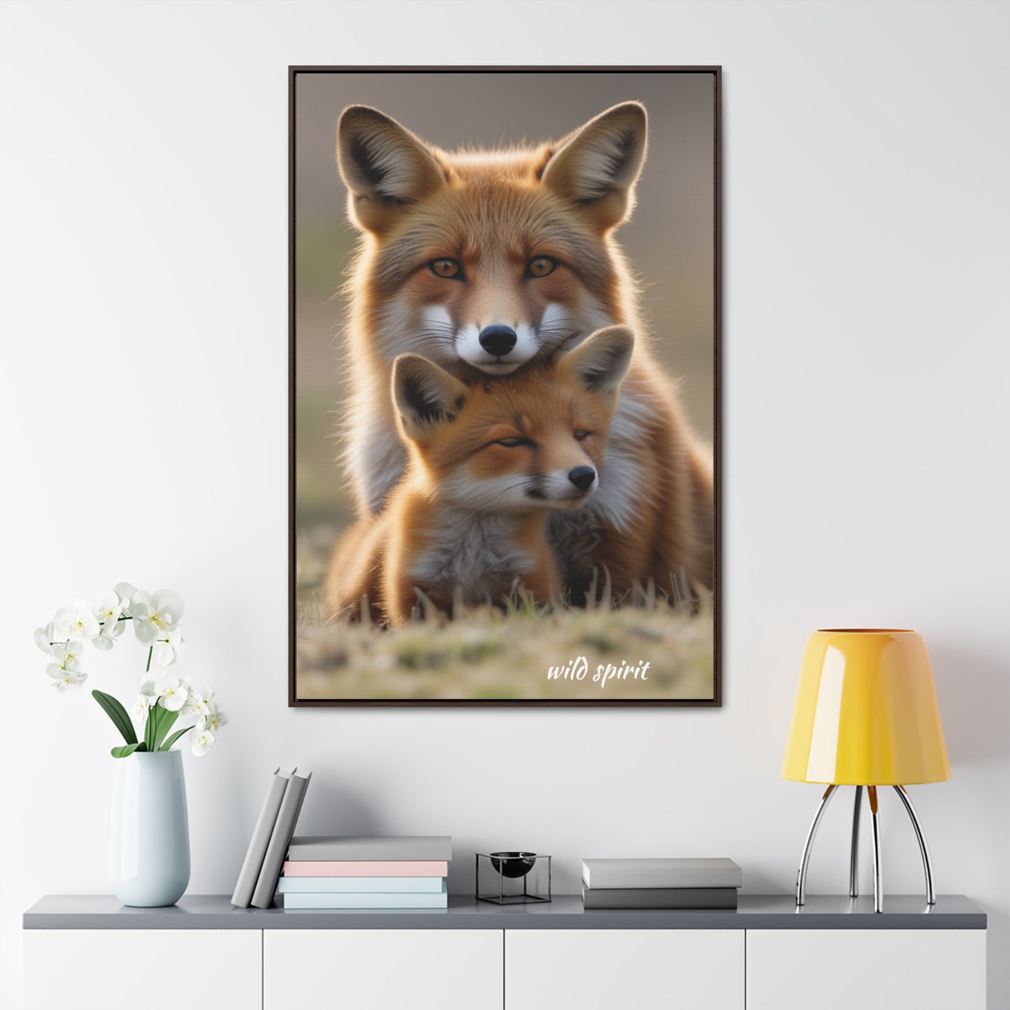 Capture the heartwarming moment of a mama fox snuggling her baby fox with this vertical frame canvas wrap. The cozy and endearing design is perfect for nursery decor or as a gift for new parents or animal lovers. Ideal for Mother's Day, baby showers, or birthdays.