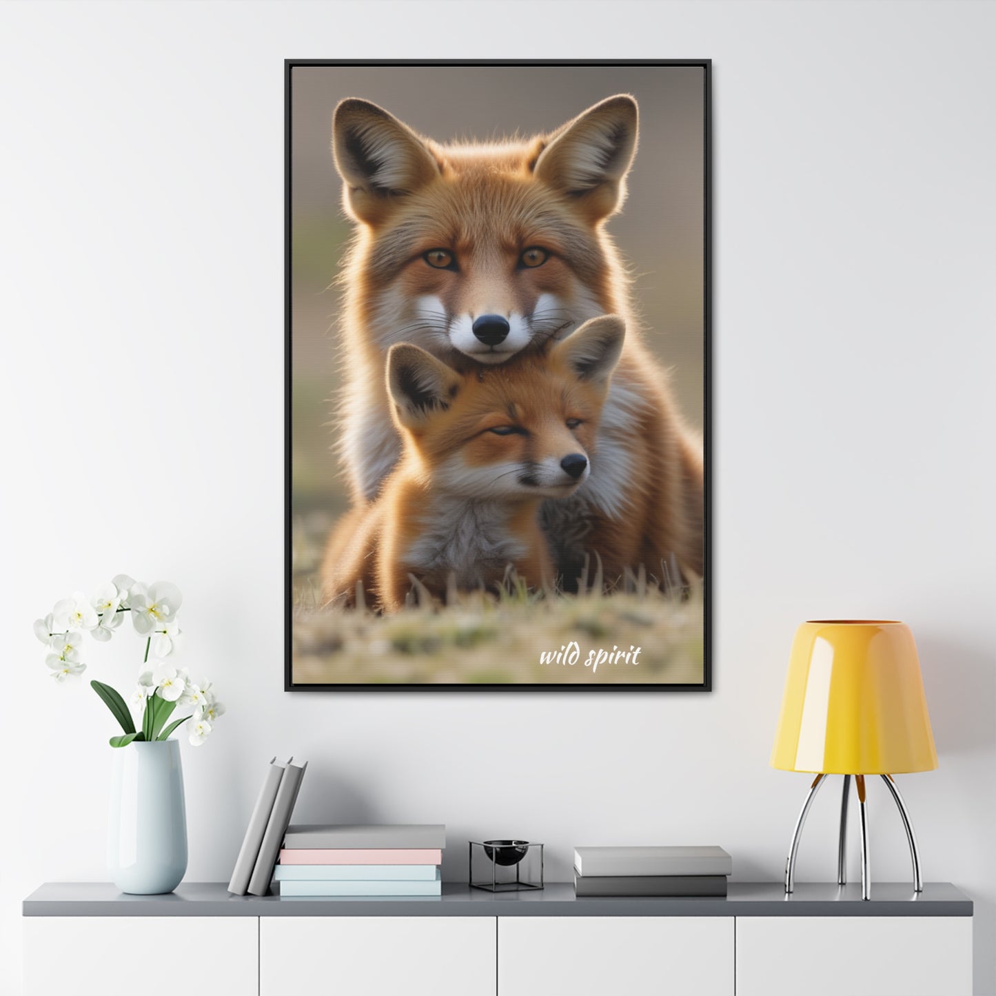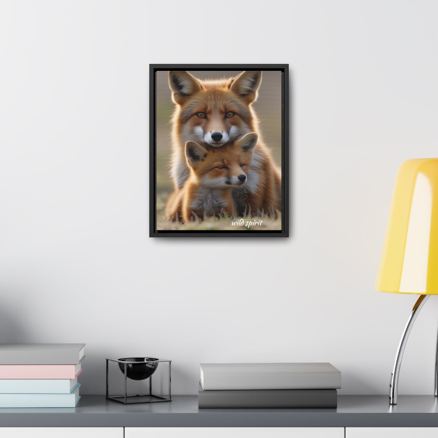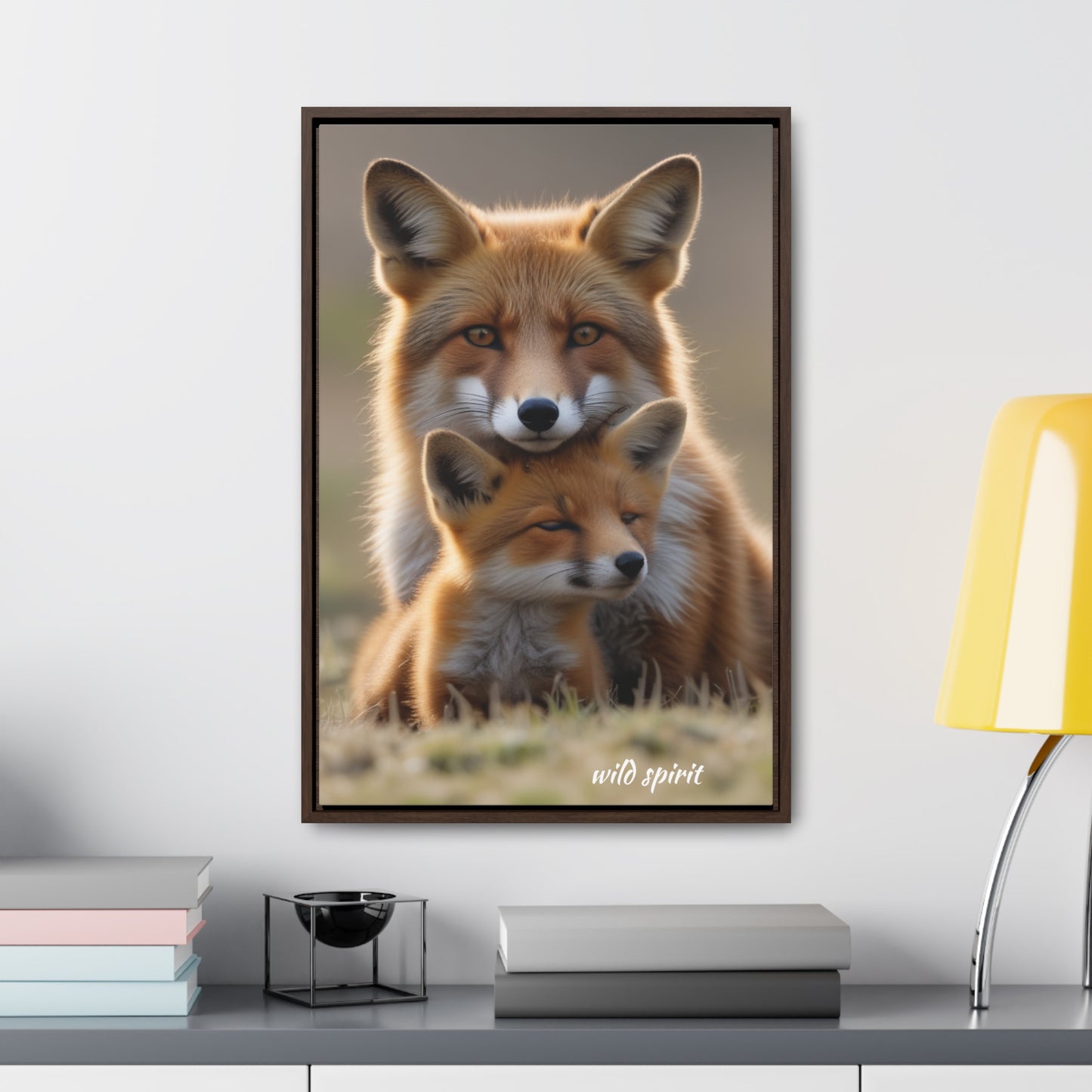Capture the heartwarming moment of a mama fox snuggling her baby fox with this vertical frame canvas wrap. The cozy and endearing design is perfect for nursery decor or as a gift for new parents or animal lovers. Ideal for Mother's Day, baby showers, or birthdays.