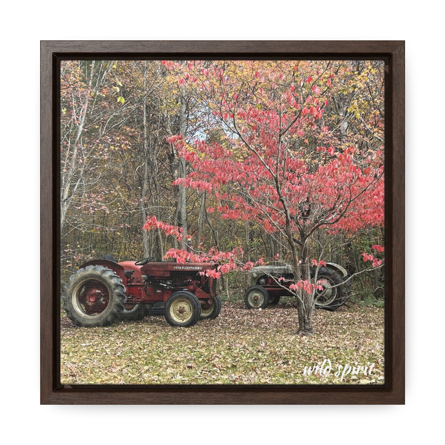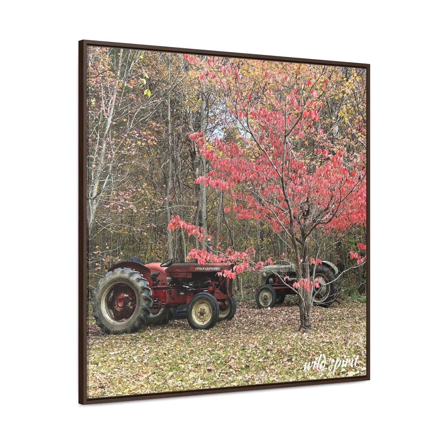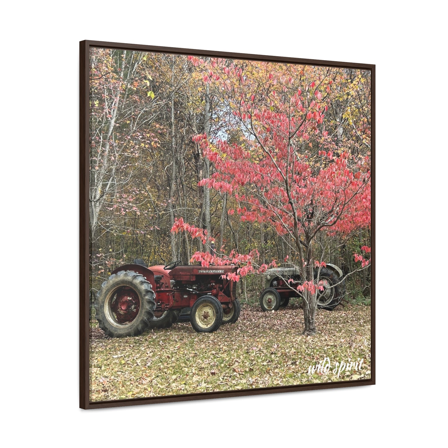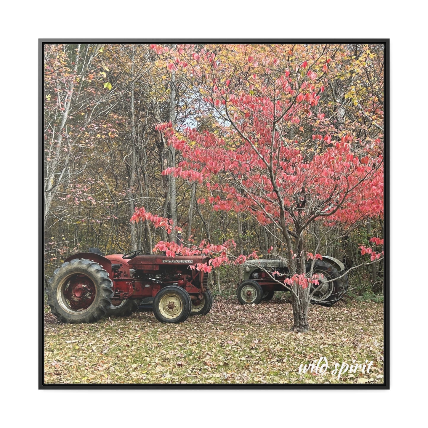 Rustic square frame canvas wraps featuring tractors at the woodlands edge. Perfect for adding a touch of rustic charm to your home decor. Ideal for farmhouse decor enthusiasts and nature lovers. Relevant for holidays and occasions such as Thanksgiving and Christmas.