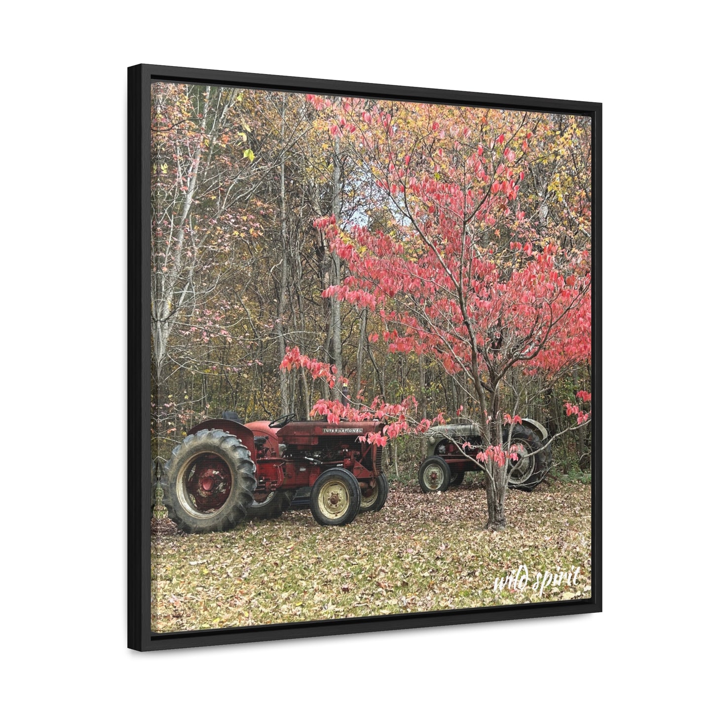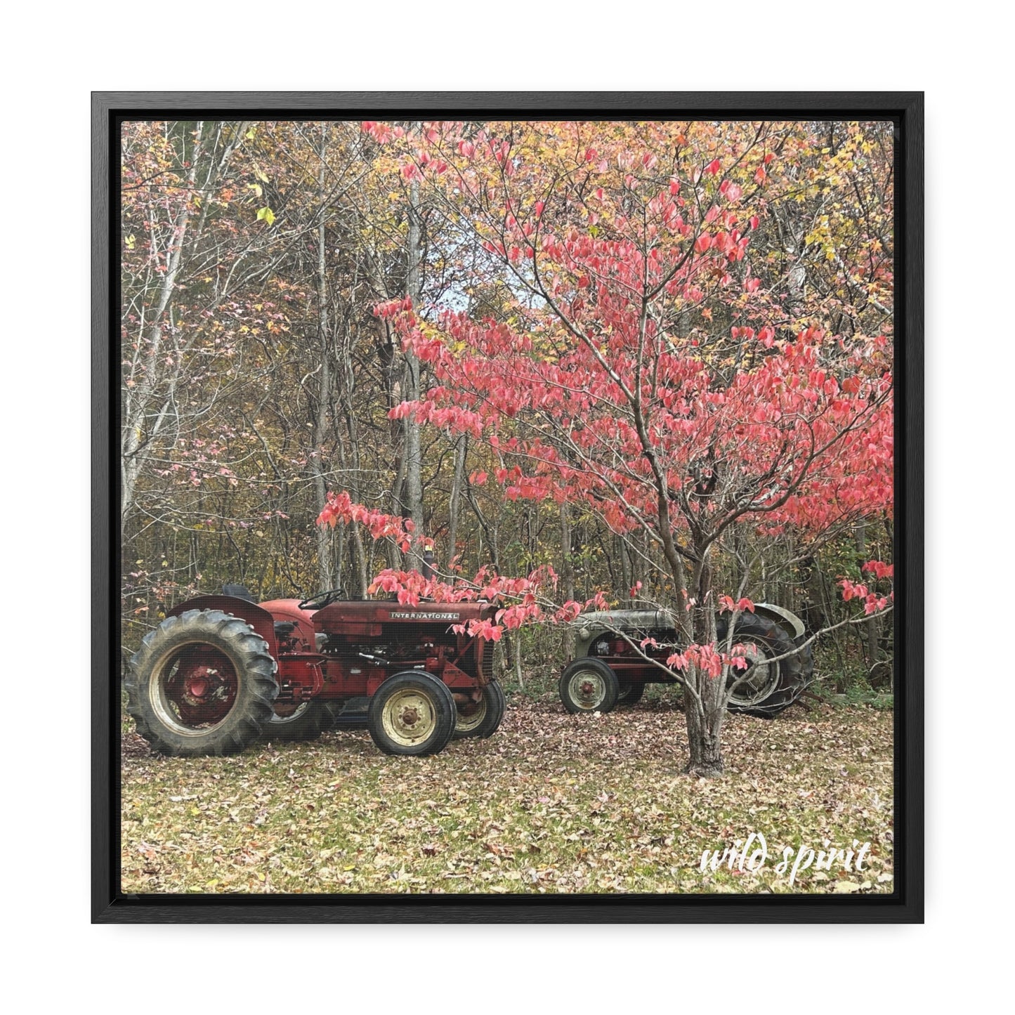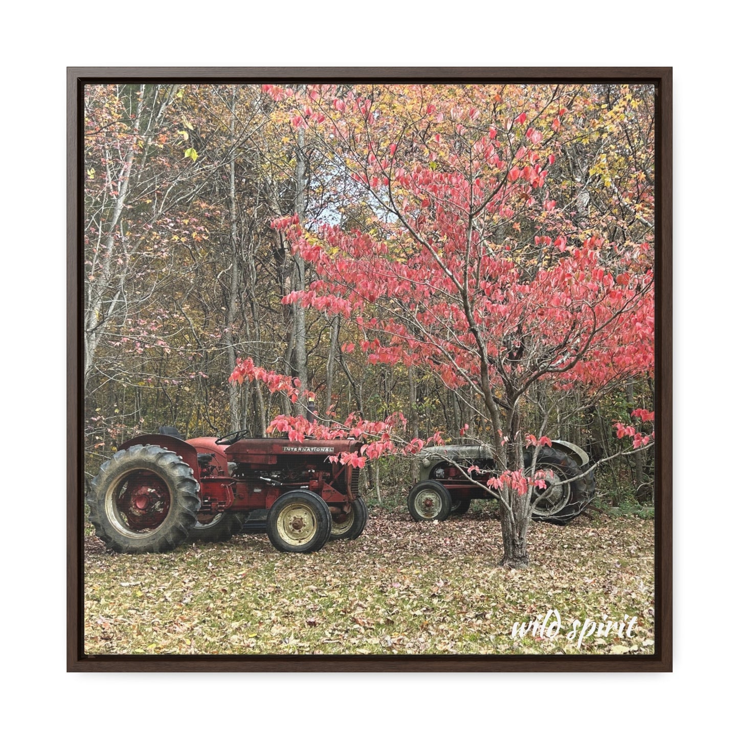 Rustic square frame canvas wraps featuring tractors at the woodlands edge. Perfect for adding a touch of rustic charm to your home decor. Ideal for farmhouse decor enthusiasts and nature lovers. Relevant for holidays and occasions such as Thanksgiving and Christmas.