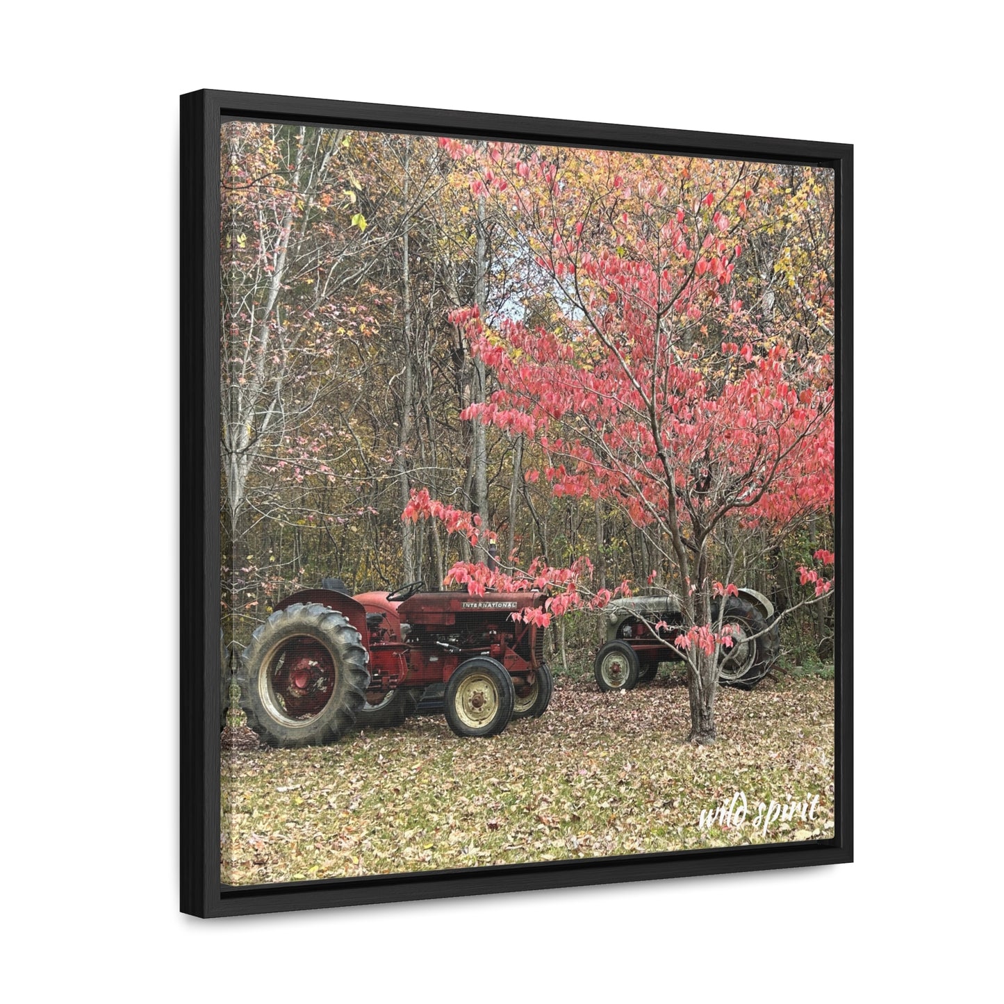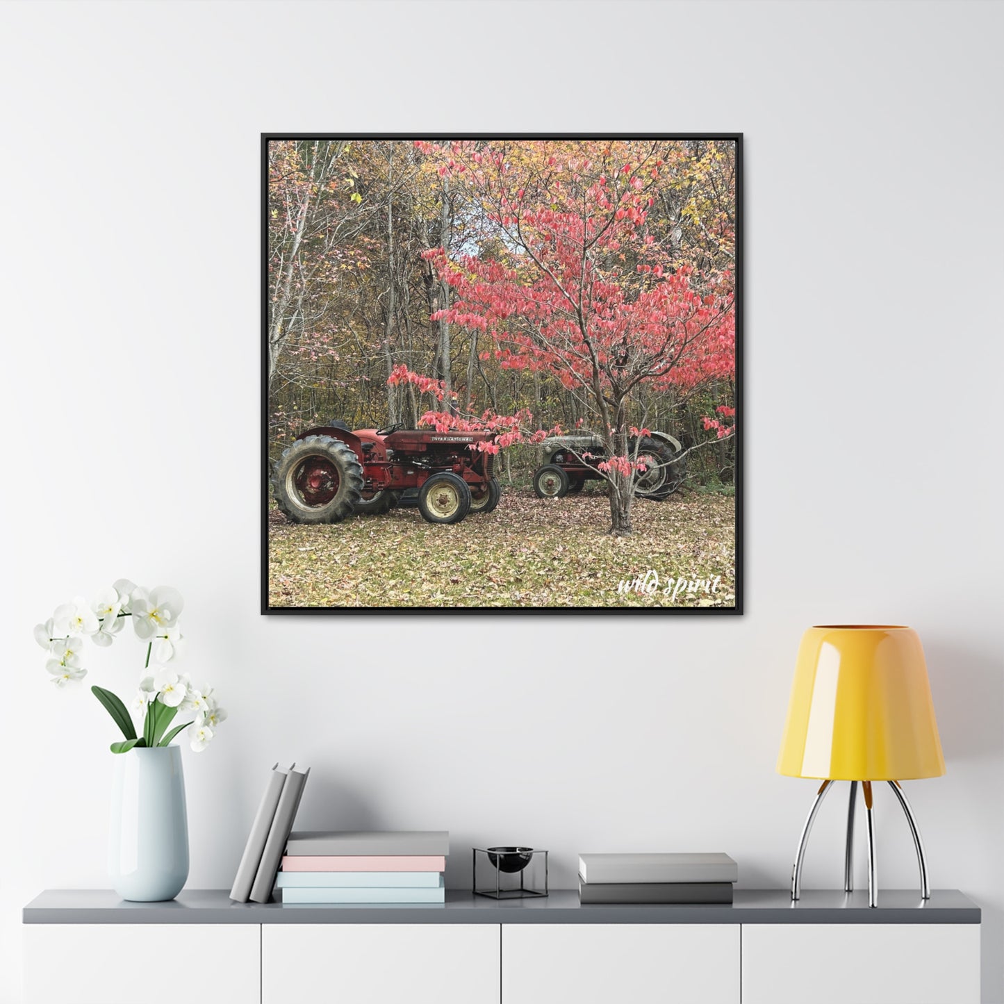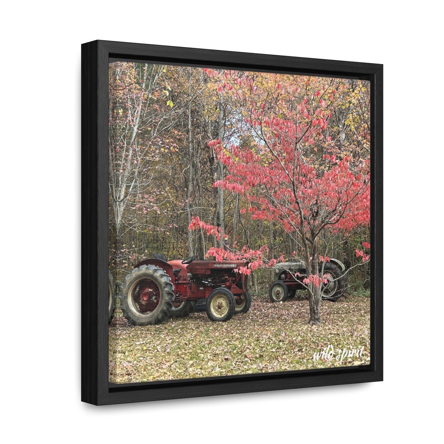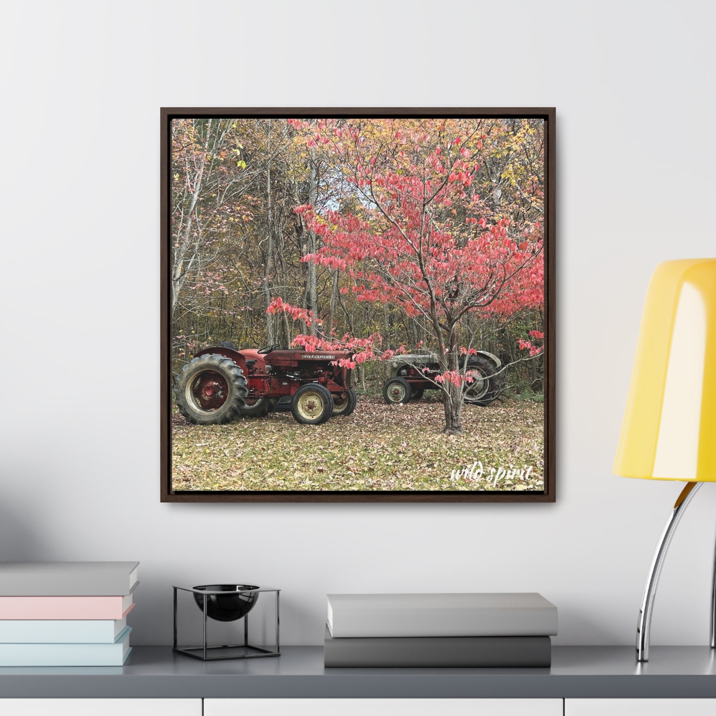Rustic square frame canvas wraps featuring tractors at the woodlands edge. Perfect for adding a touch of rustic charm to your home decor. Ideal for farmhouse decor enthusiasts and nature lovers. Relevant for holidays and occasions such as Thanksgiving and Christmas.