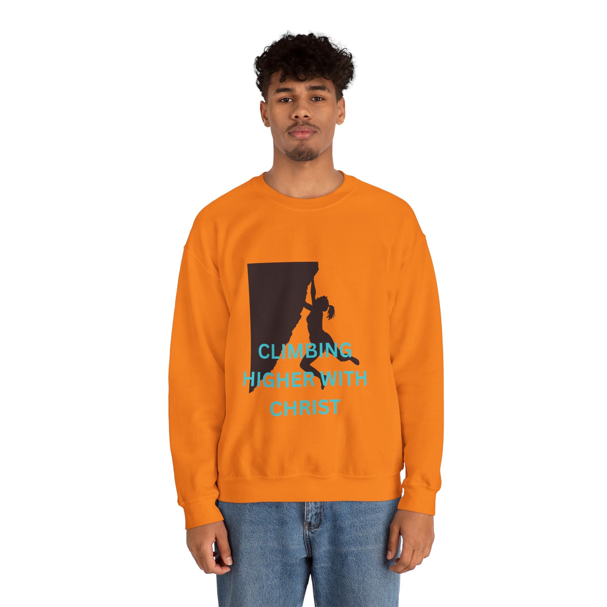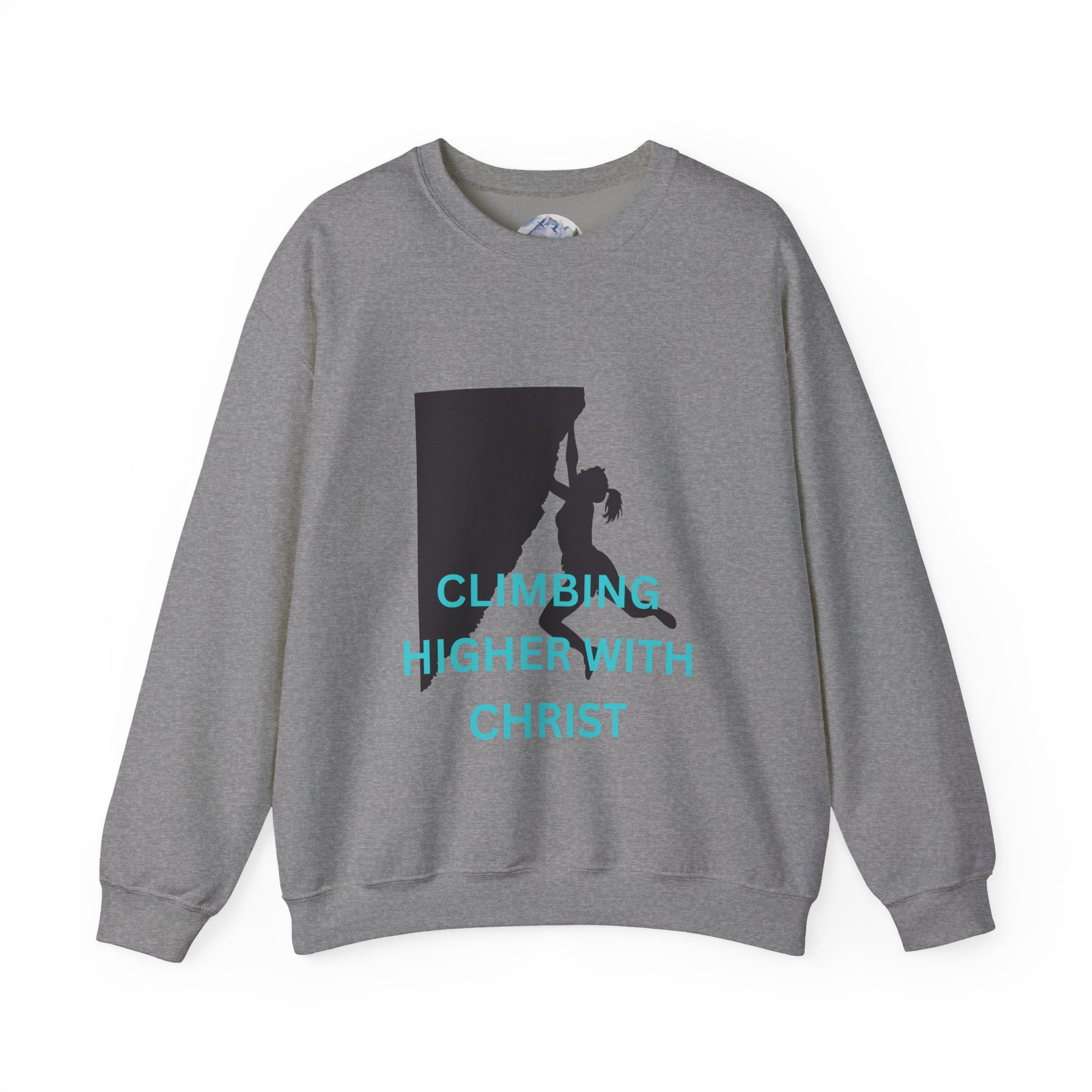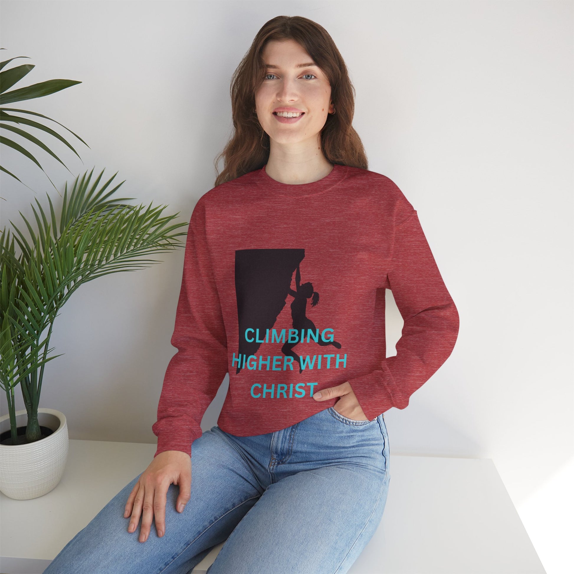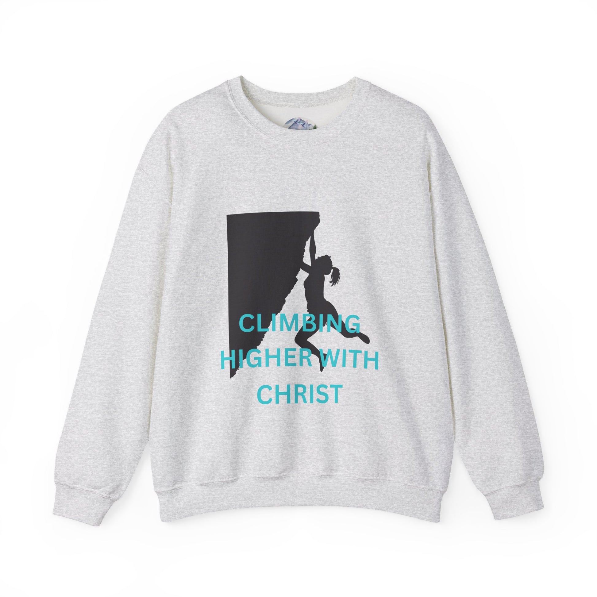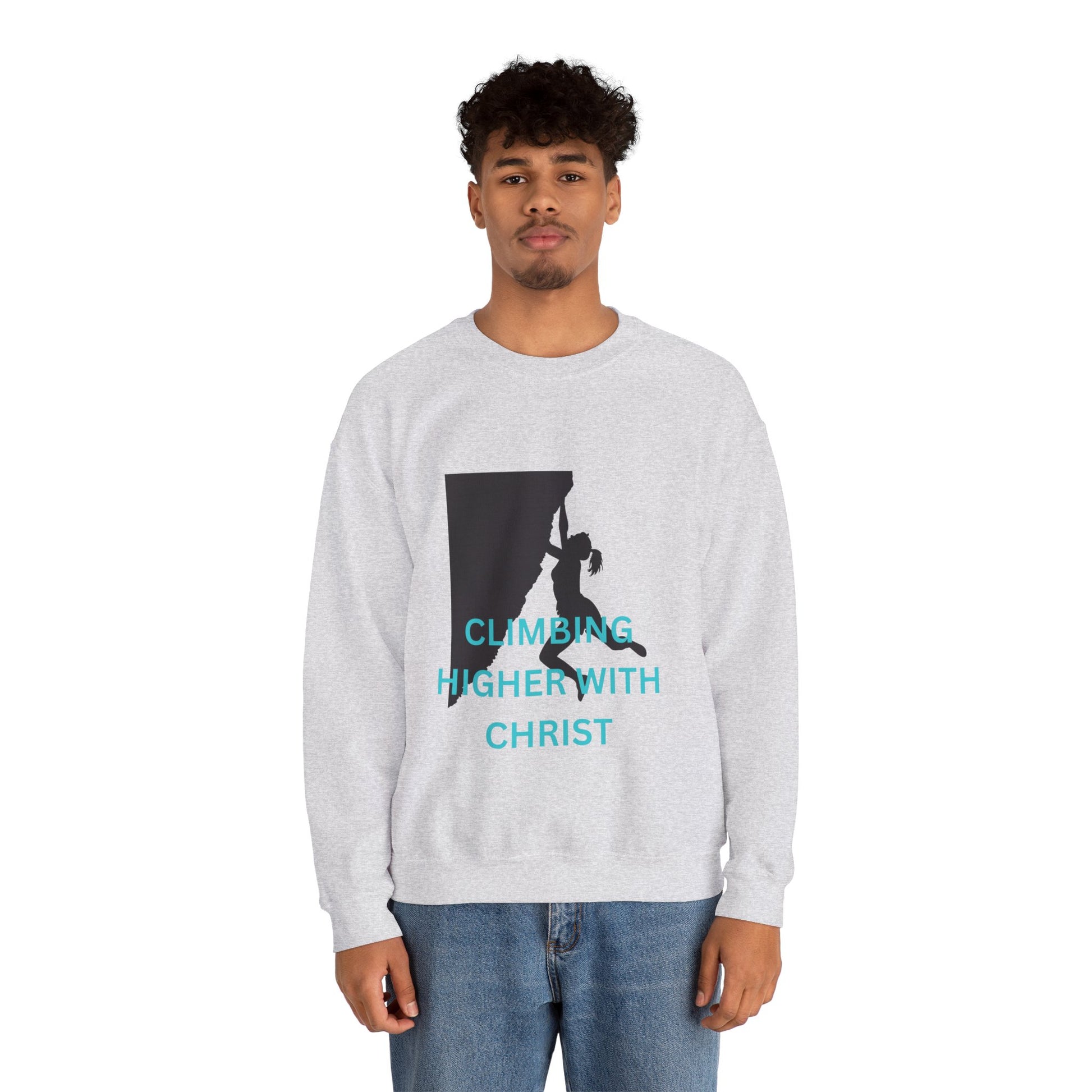 A unisex heavy blend crewneck sweatshirt featuring a rock-climbing design with the message 'climbing higher with Christ'. This cozy sweatshirt is perfect for those colder months and delivers a comfy wearing experience with a clean-cut style. making it a great choice for anyone who loves rock climbing and faith-inspired messages. Ideal for wearing during outdoor adventures or casual hangouts, this sweatshirt is a thoughtful gift for Christians and rock-climbing enthusiasts, especially during Christmas and Easter.