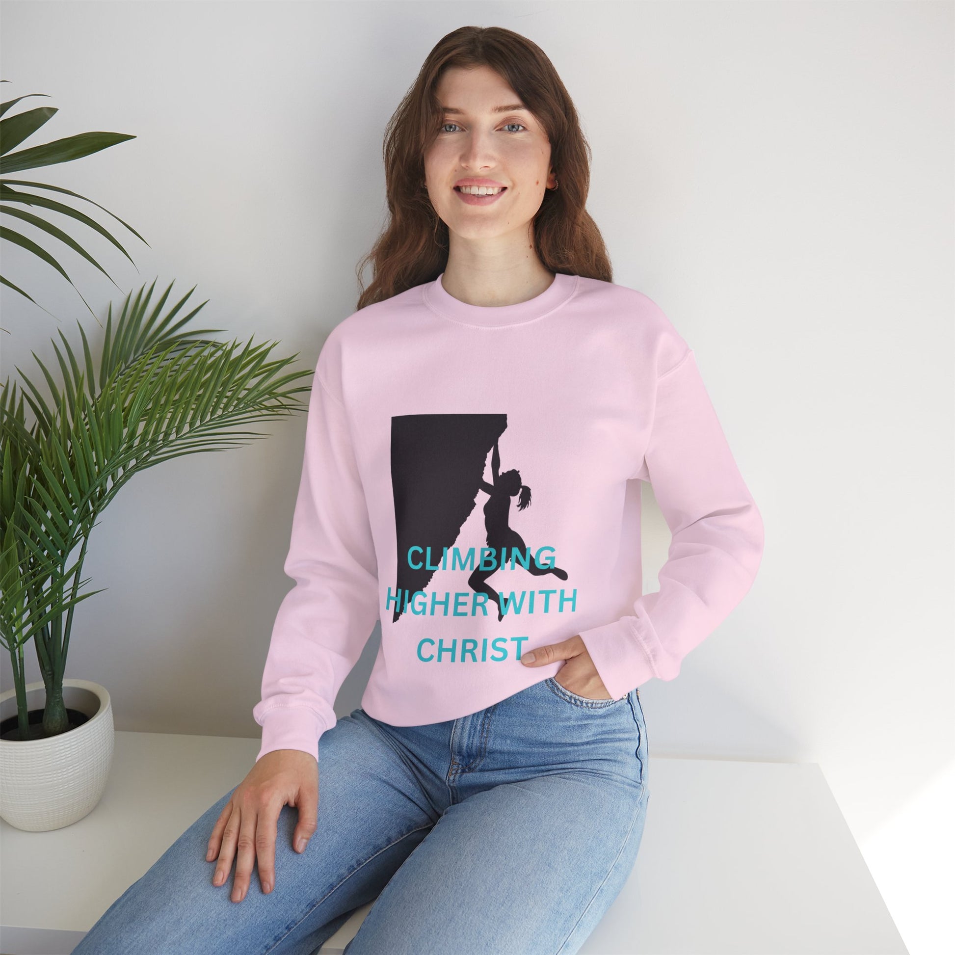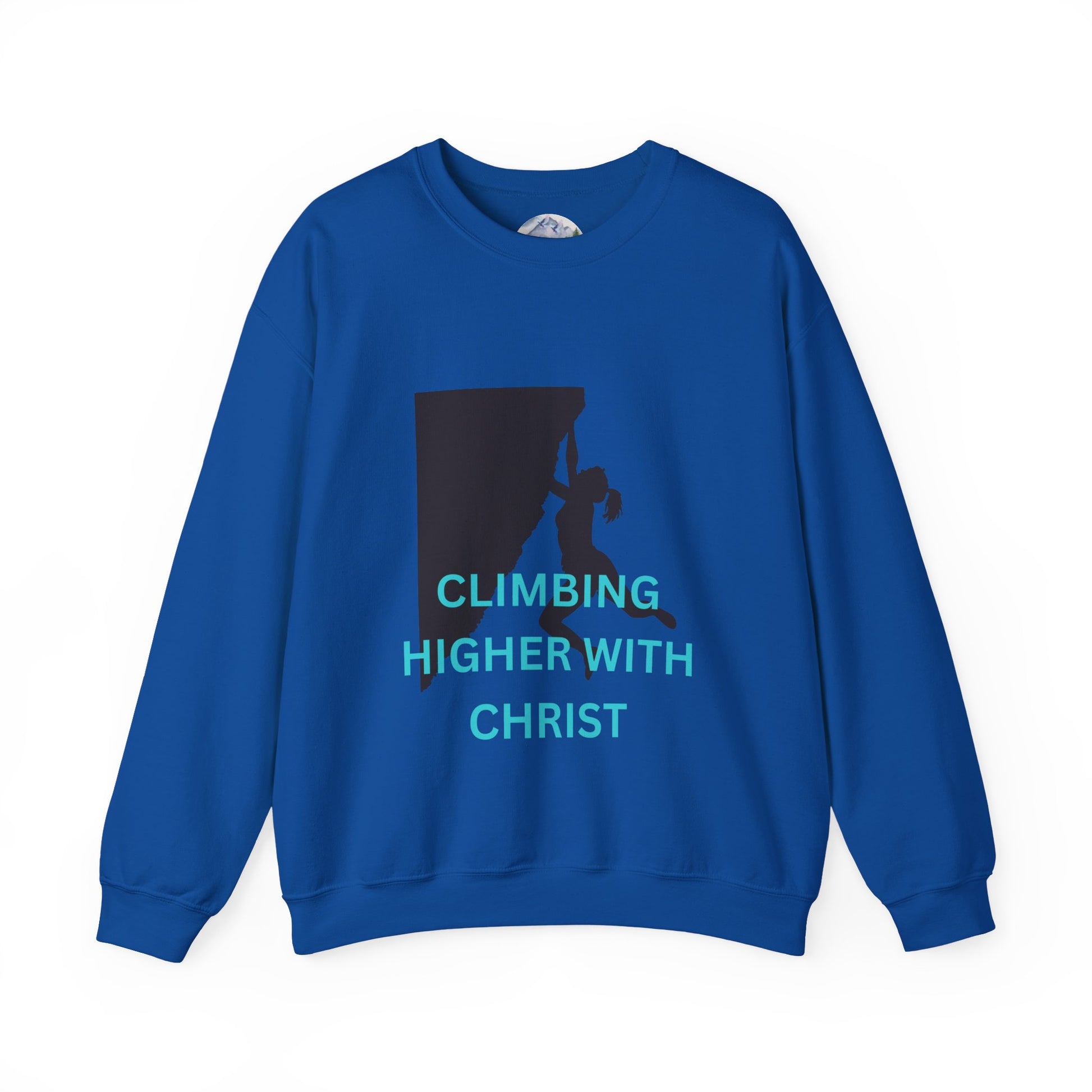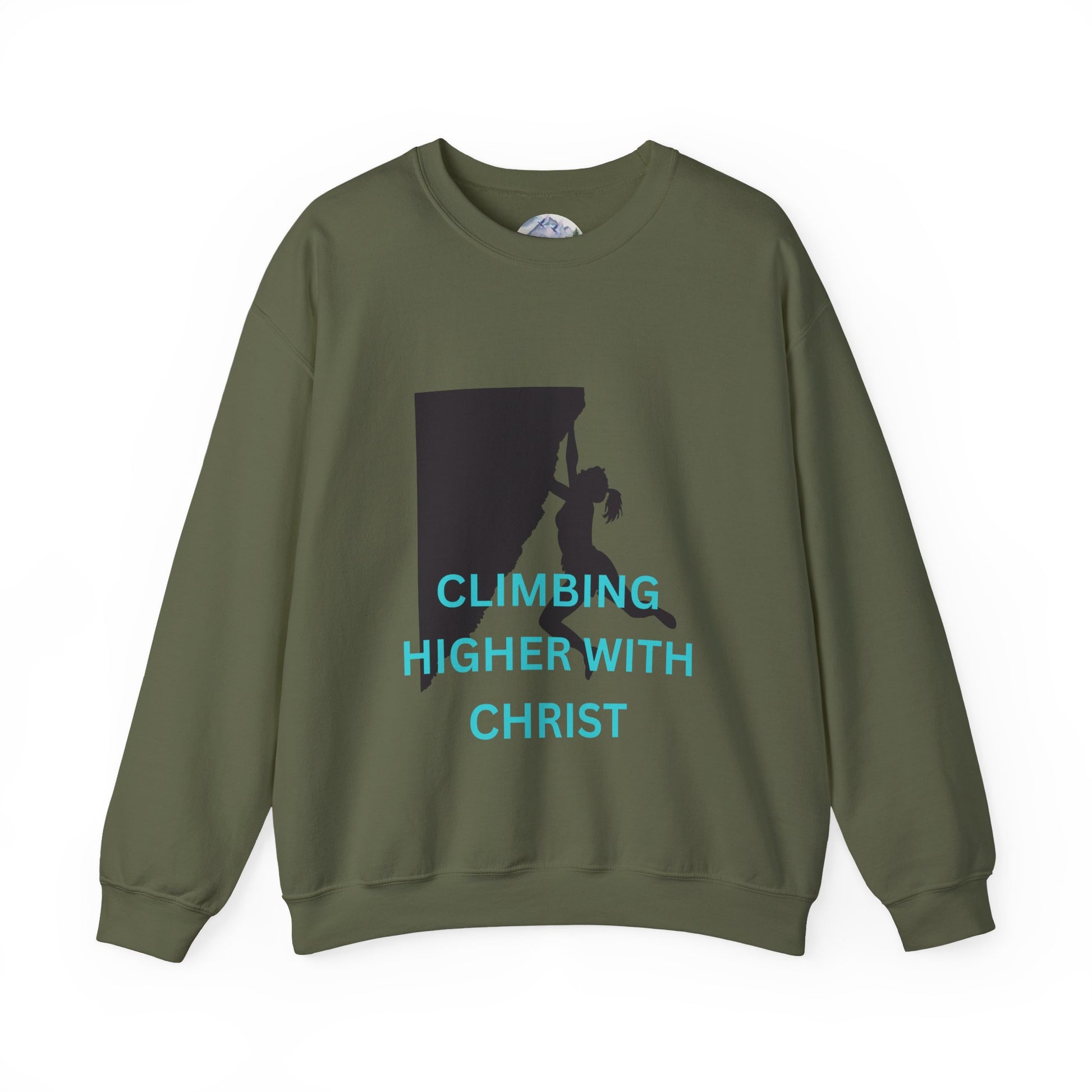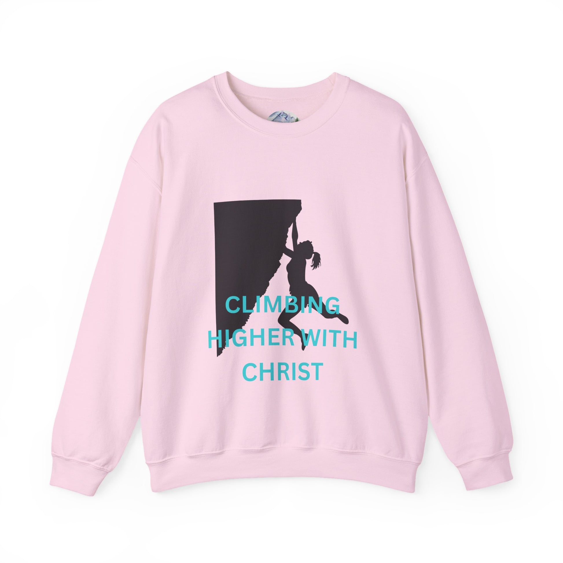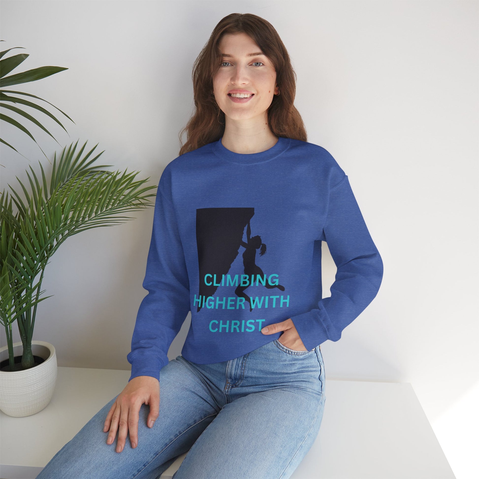 A unisex heavy blend crewneck sweatshirt featuring a rock-climbing design with the message 'climbing higher with Christ'. This cozy sweatshirt is perfect for those colder months and delivers a comfy wearing experience with a clean-cut style. making it a great choice for anyone who loves rock climbing and faith-inspired messages. Ideal for wearing during outdoor adventures or casual hangouts, this sweatshirt is a thoughtful gift for Christians and rock-climbing enthusiasts, especially during Christmas and Easter.