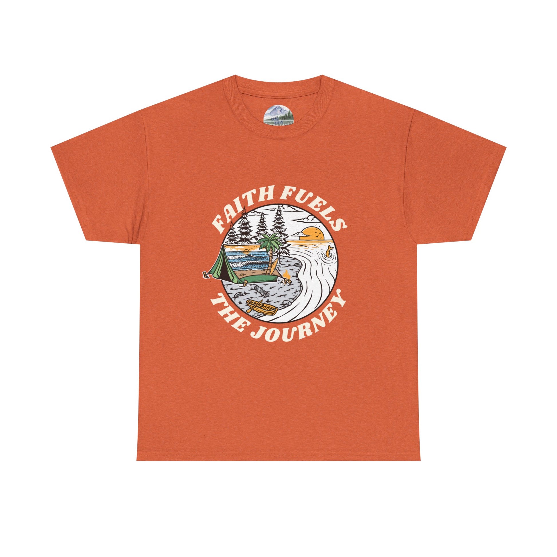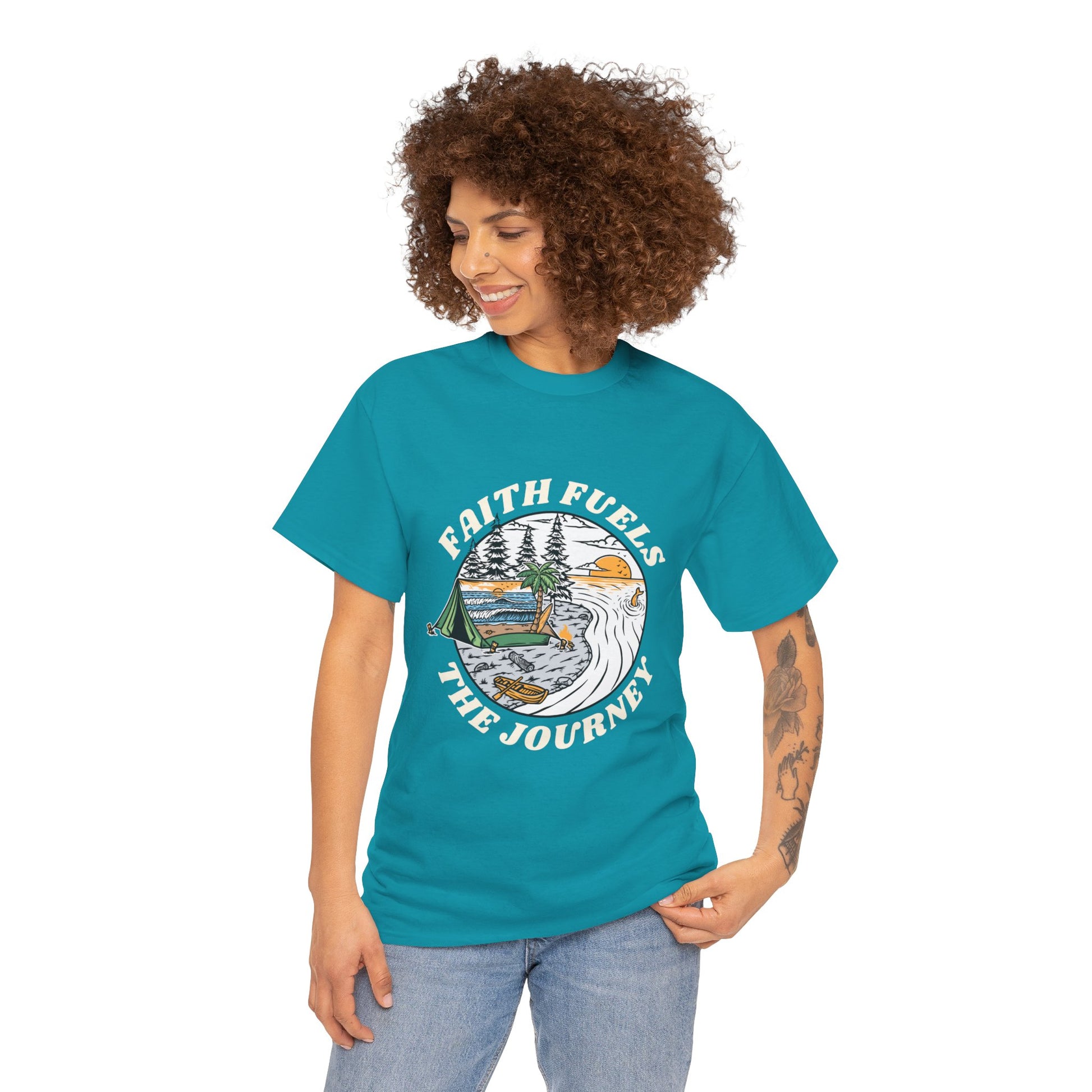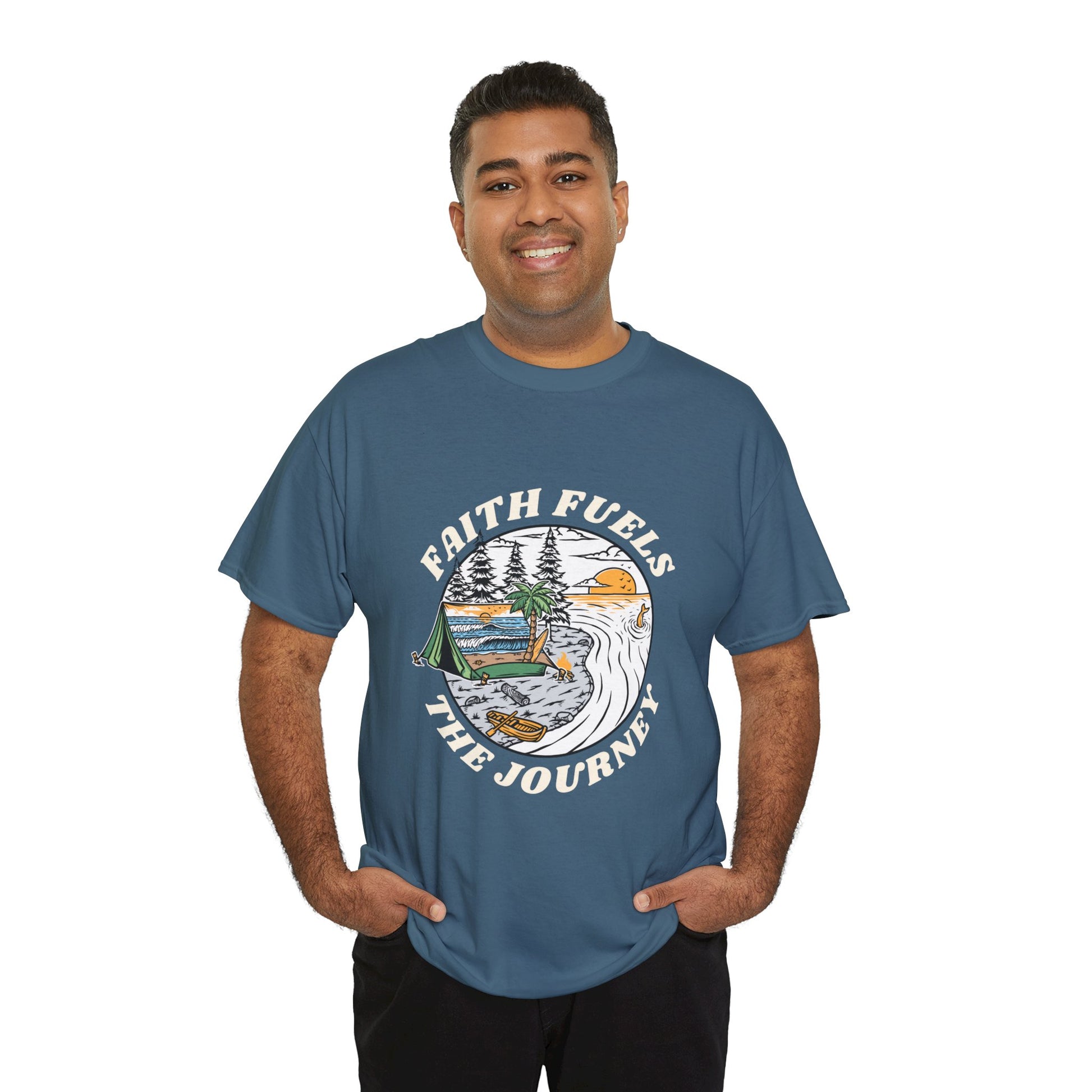 This unisex heavy cotton tee with the design 'faith fuels the journey' exudes a sense of motivation and positivity. Perfect for those who seek comfort and inspiration in their daily life. Ideal for religious holidays, spiritual observances, and everyday wear.