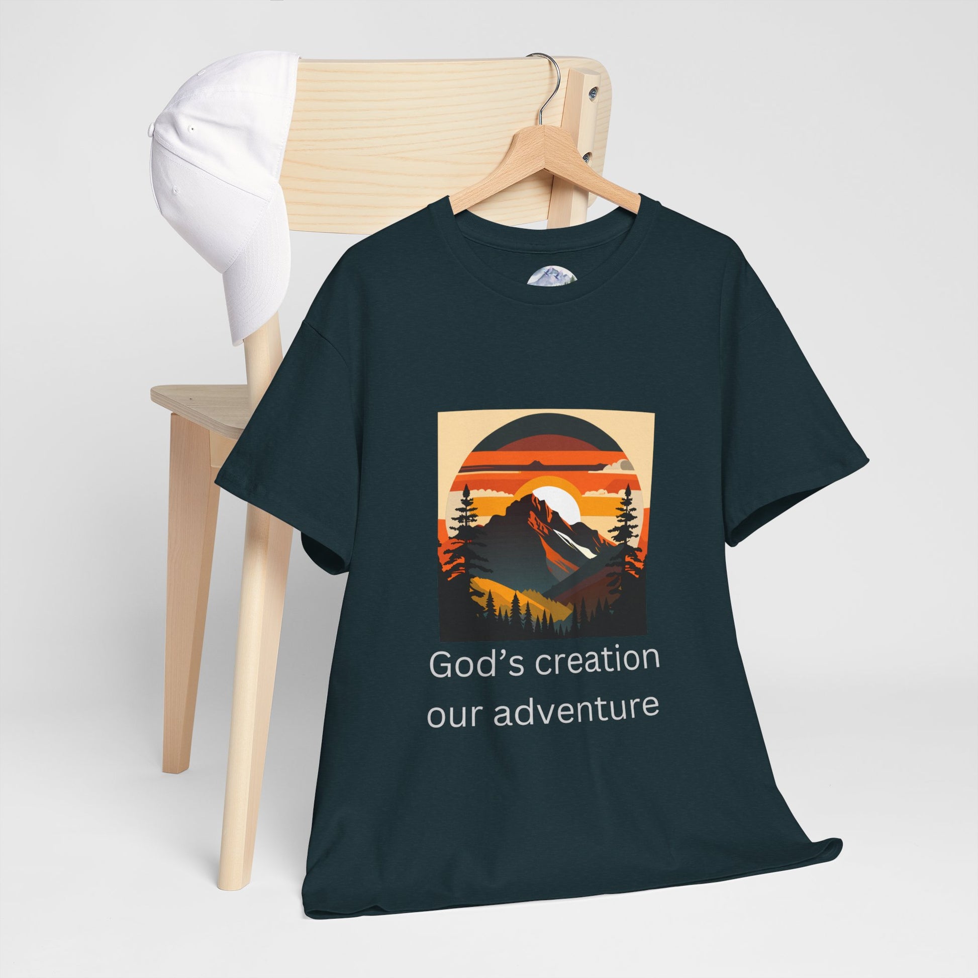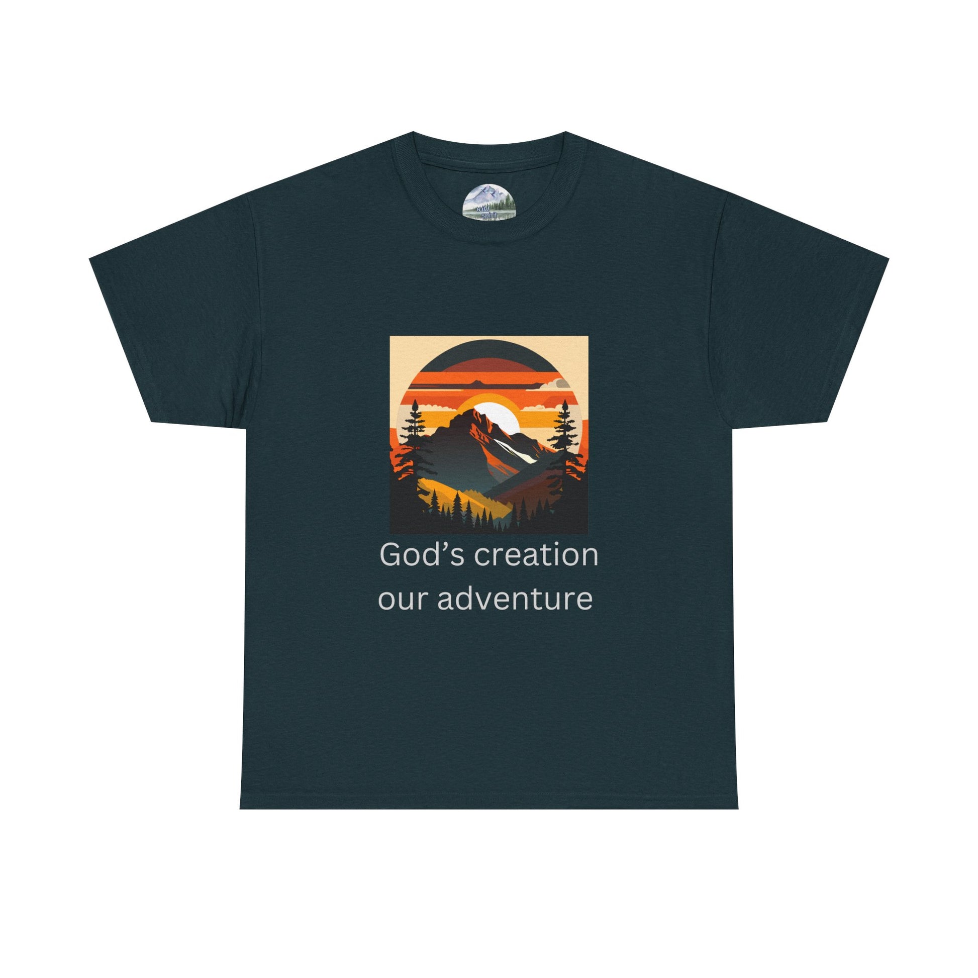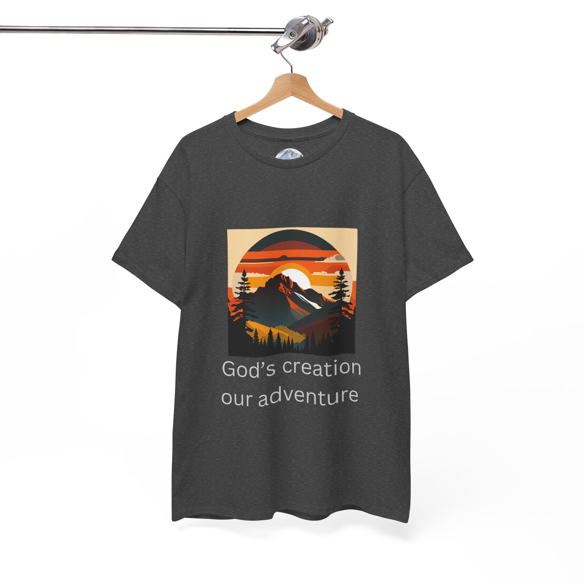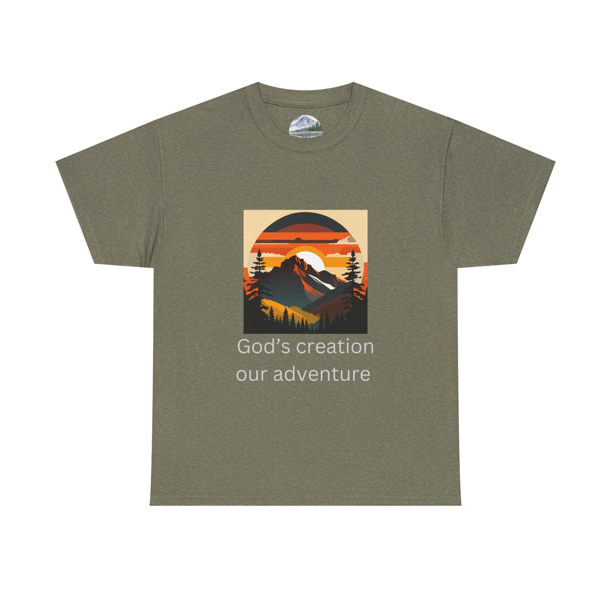 A unisex heavy cotton tee featuring a serene design of a sunset over the mountains and forest with the message 'God's creation our adventure'. This tee gives off a peaceful and adventurous vibe, perfect for nature lovers and outdoor enthusiasts. Ideal for casual wear or outdoor activities, this shirt is relevant for nature-themed events and spiritual gatherings.