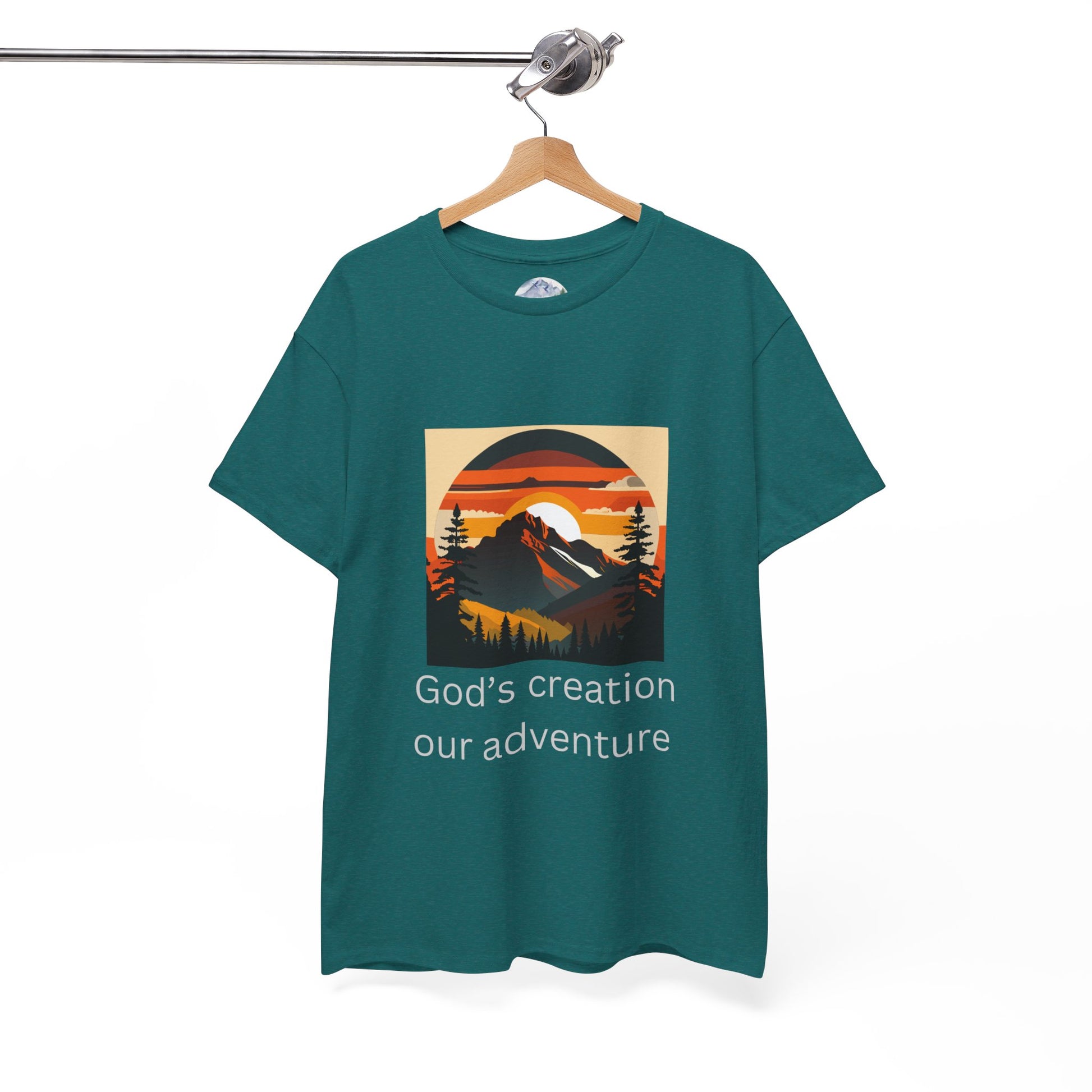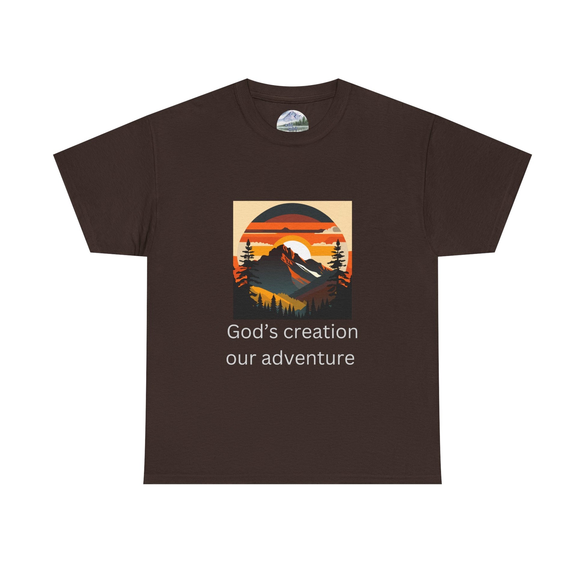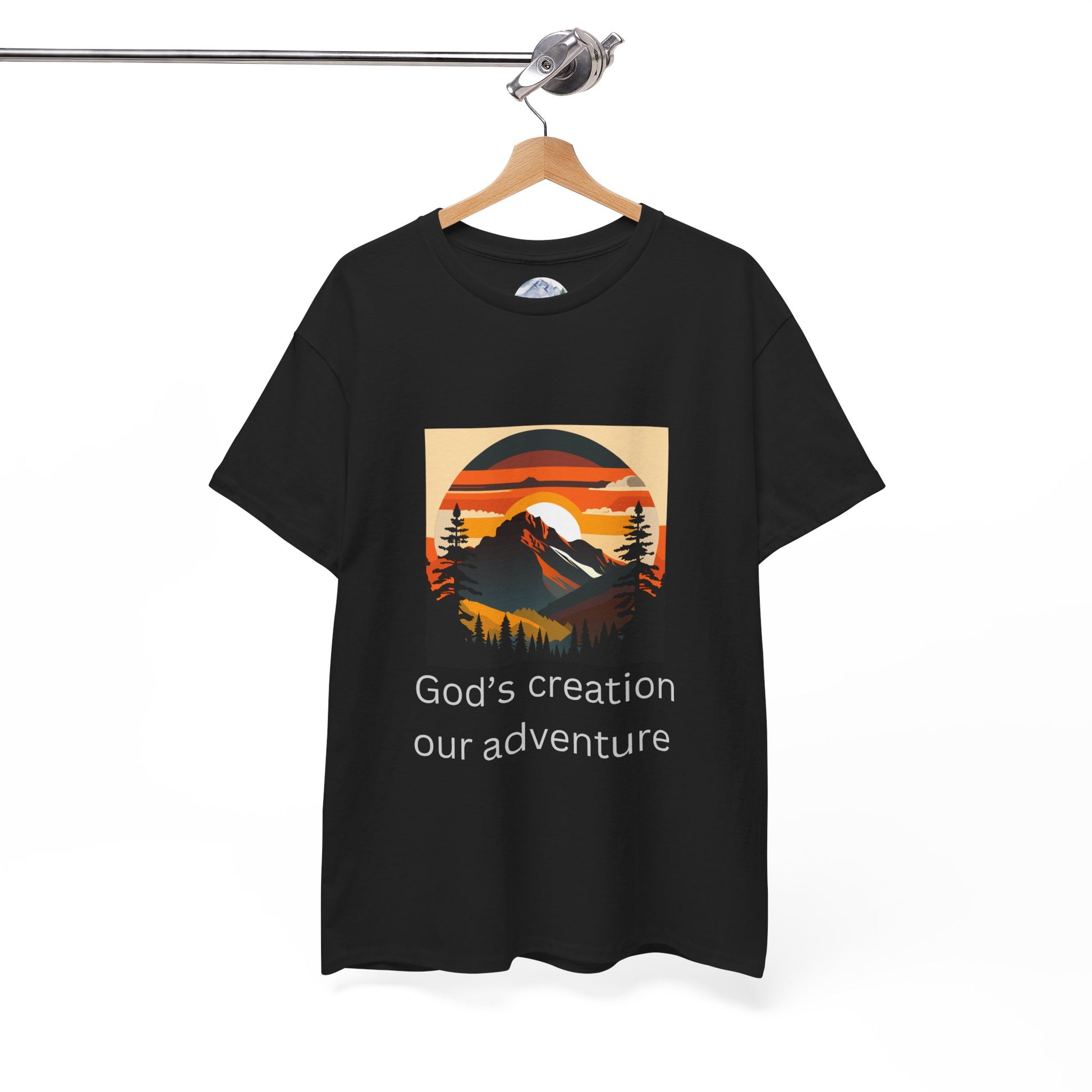 A unisex heavy cotton tee featuring a serene design of a sunset over the mountains and forest with the message 'God's creation our adventure'. This tee gives off a peaceful and adventurous vibe, perfect for nature lovers and outdoor enthusiasts. Ideal for casual wear or outdoor activities, this shirt is relevant for nature-themed events and spiritual gatherings.