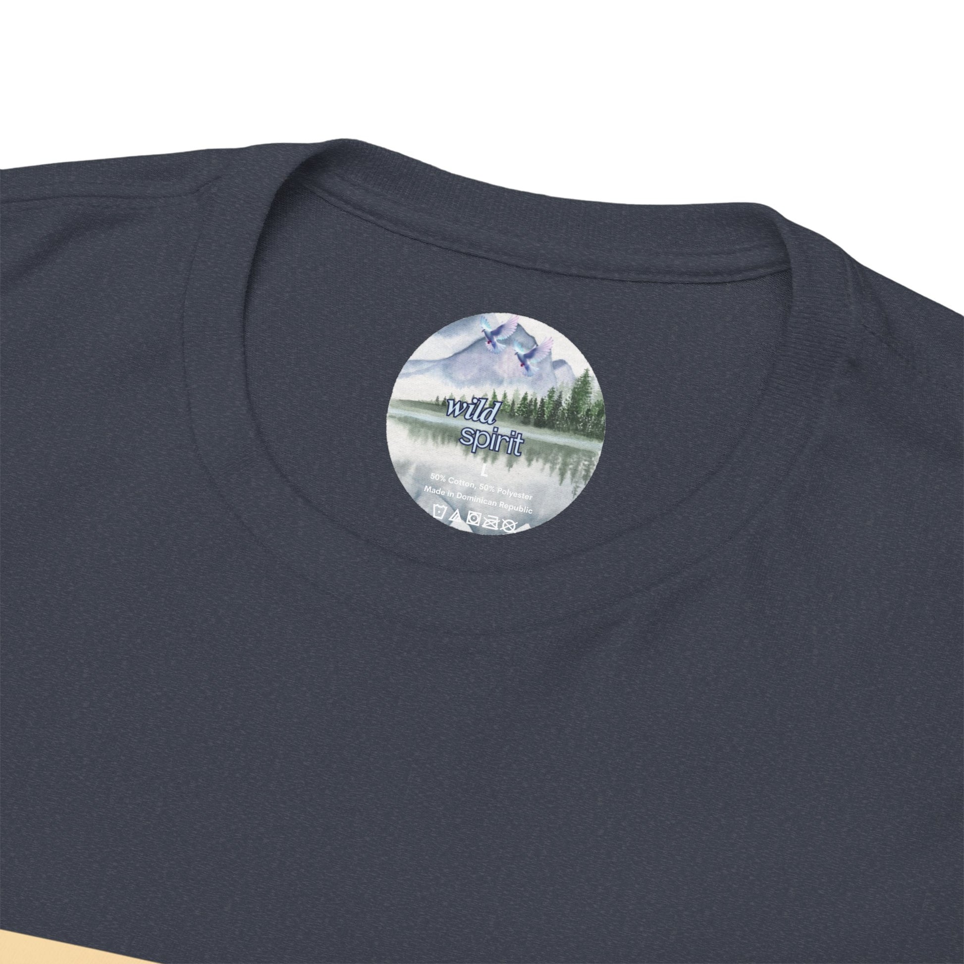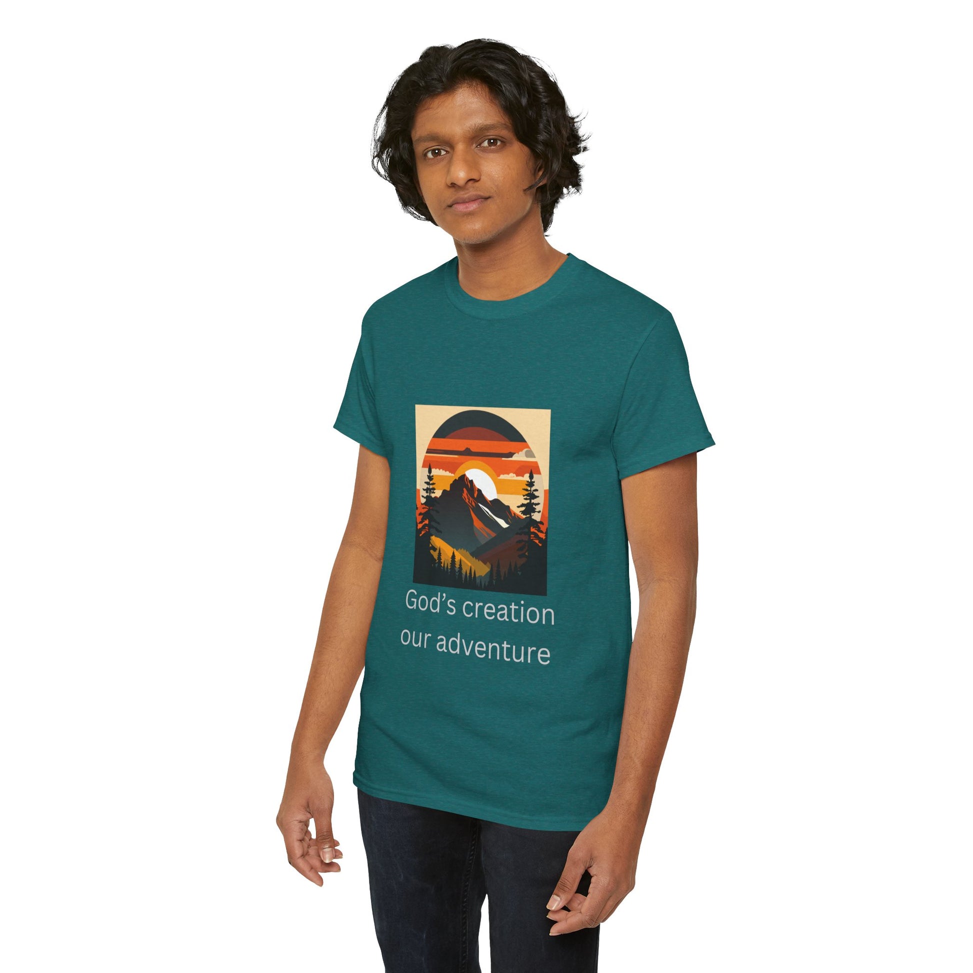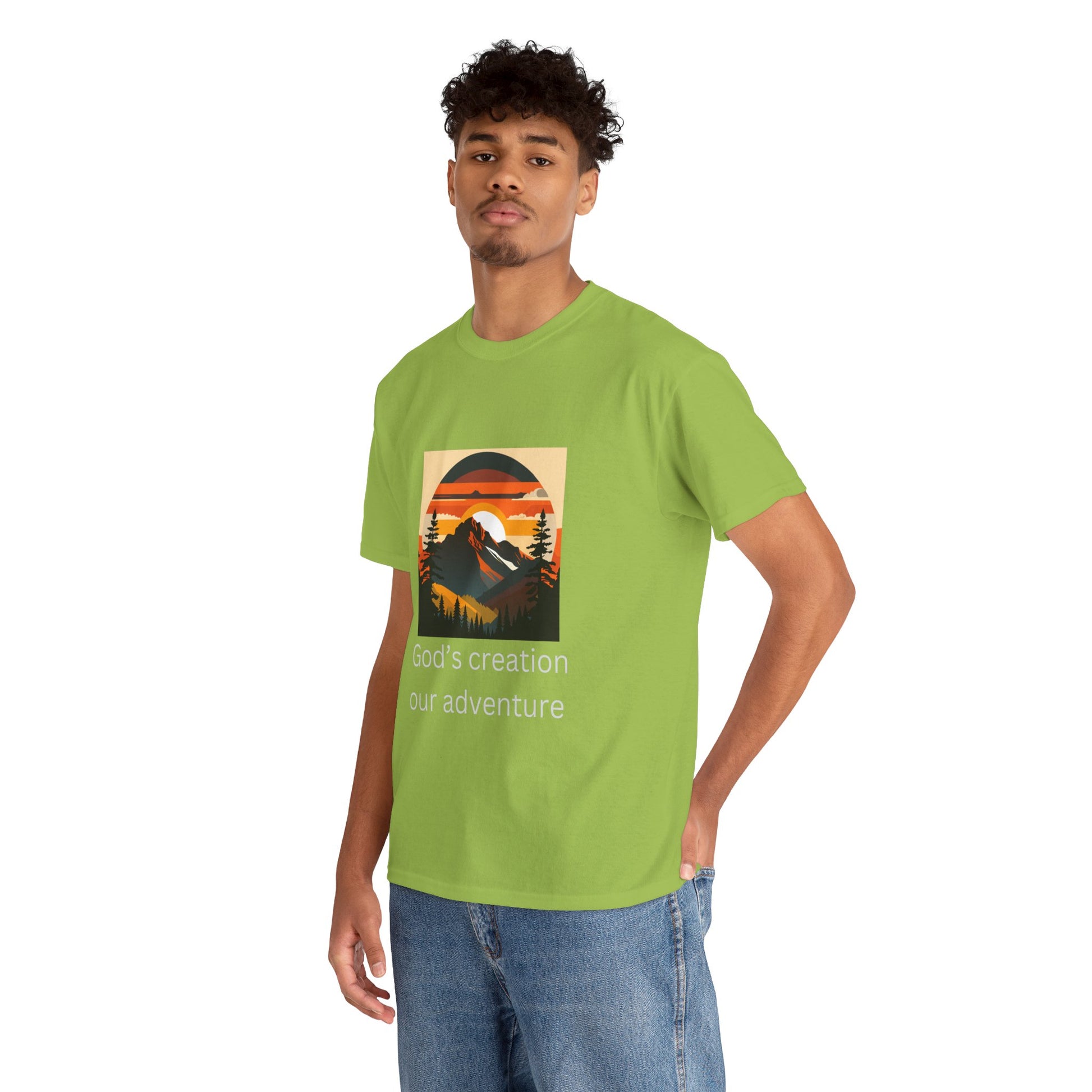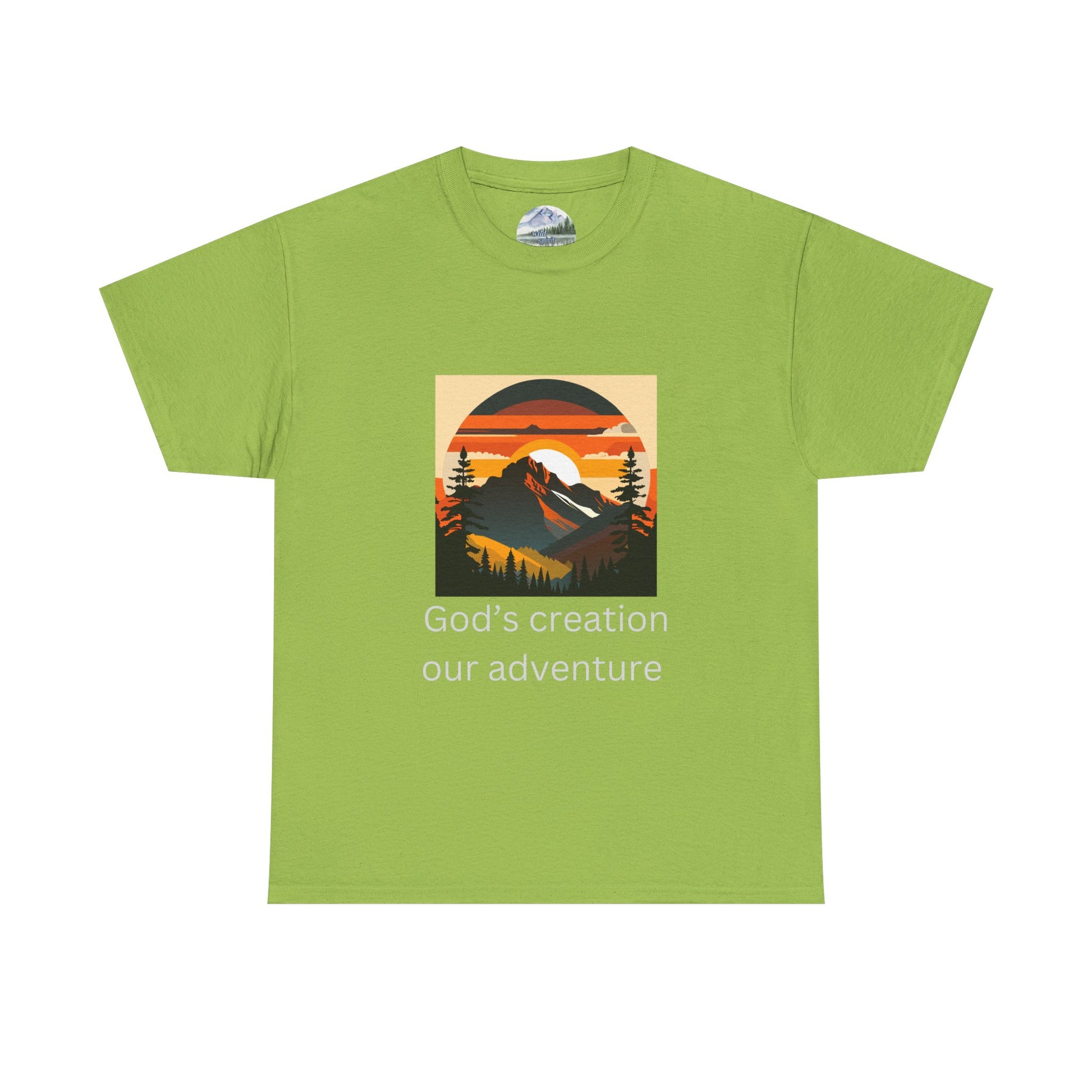 A unisex heavy cotton tee featuring a serene design of a sunset over the mountains and forest with the message 'God's creation our adventure'. This tee gives off a peaceful and adventurous vibe, perfect for nature lovers and outdoor enthusiasts. Ideal for casual wear or outdoor activities, this shirt is relevant for nature-themed events and spiritual gatherings.