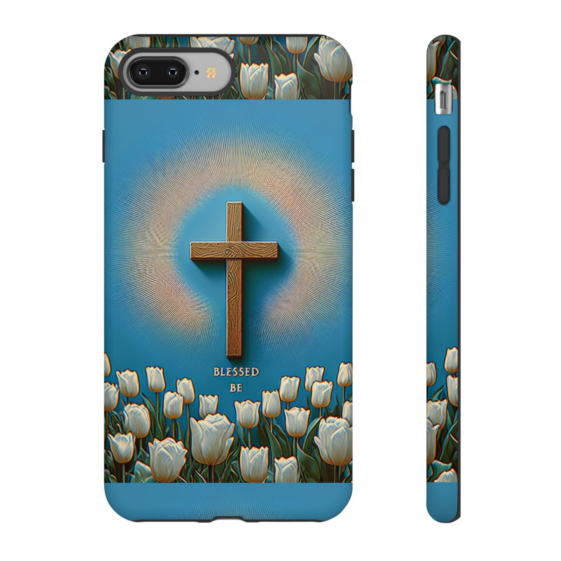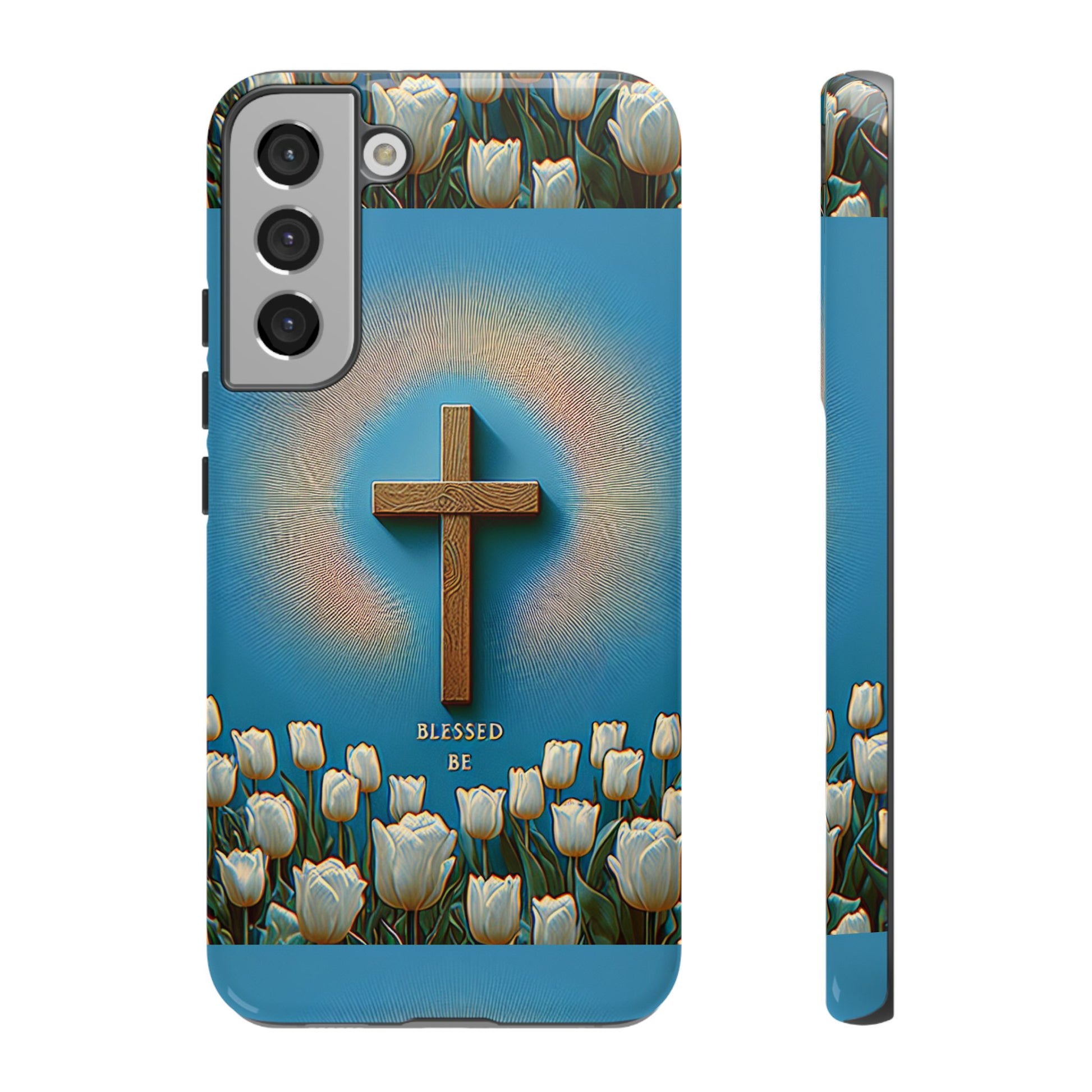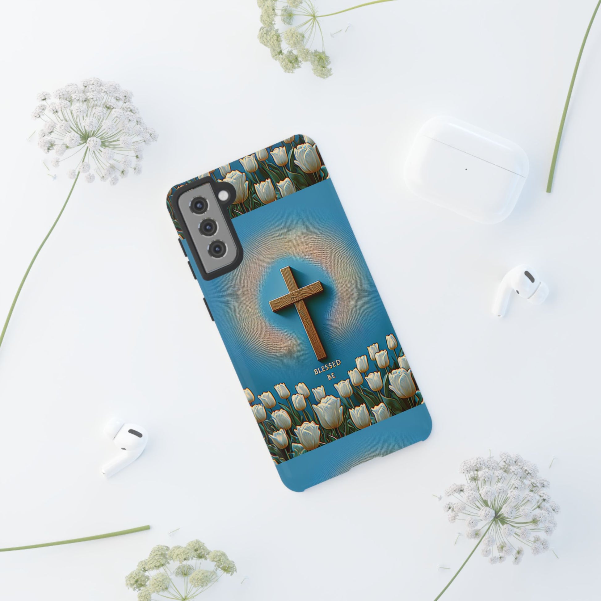 Phone Case, Cross Surrounded by Tulips Blessed Be Design