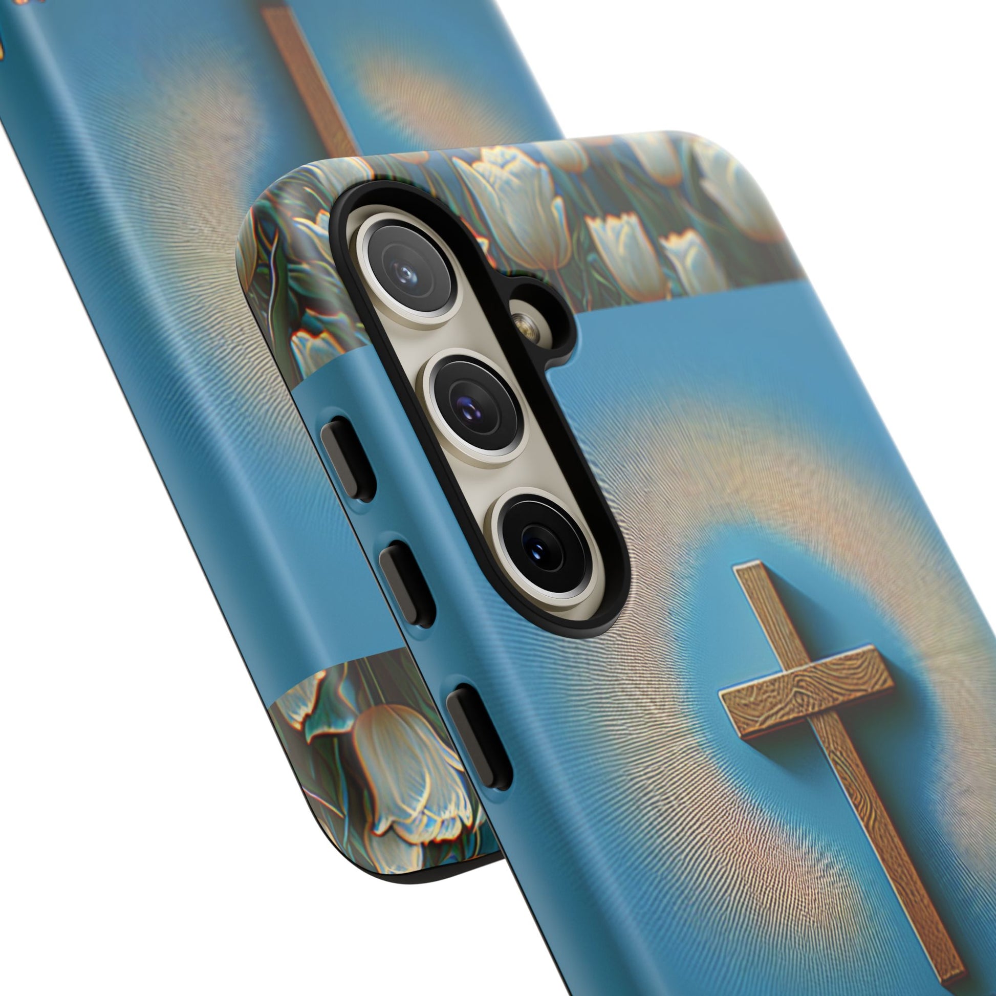 A tough phone case featuring a cross surrounded by tulips, giving off a strong and protective vibe. Perfect for those who value durability and impact resistance for their phone. Ideal for religious holidays, spiritual observances, or as a gift for someone with a strong faith.
