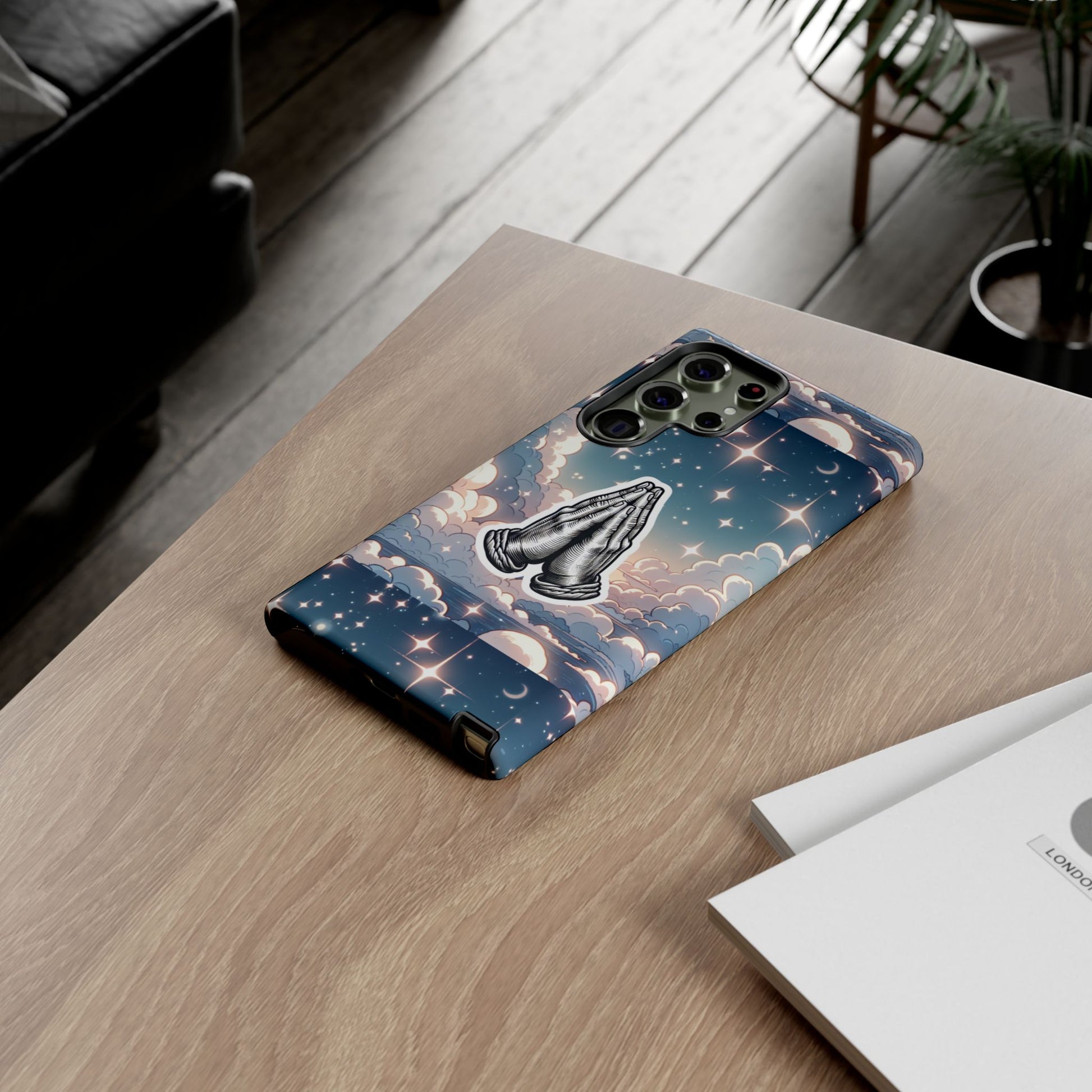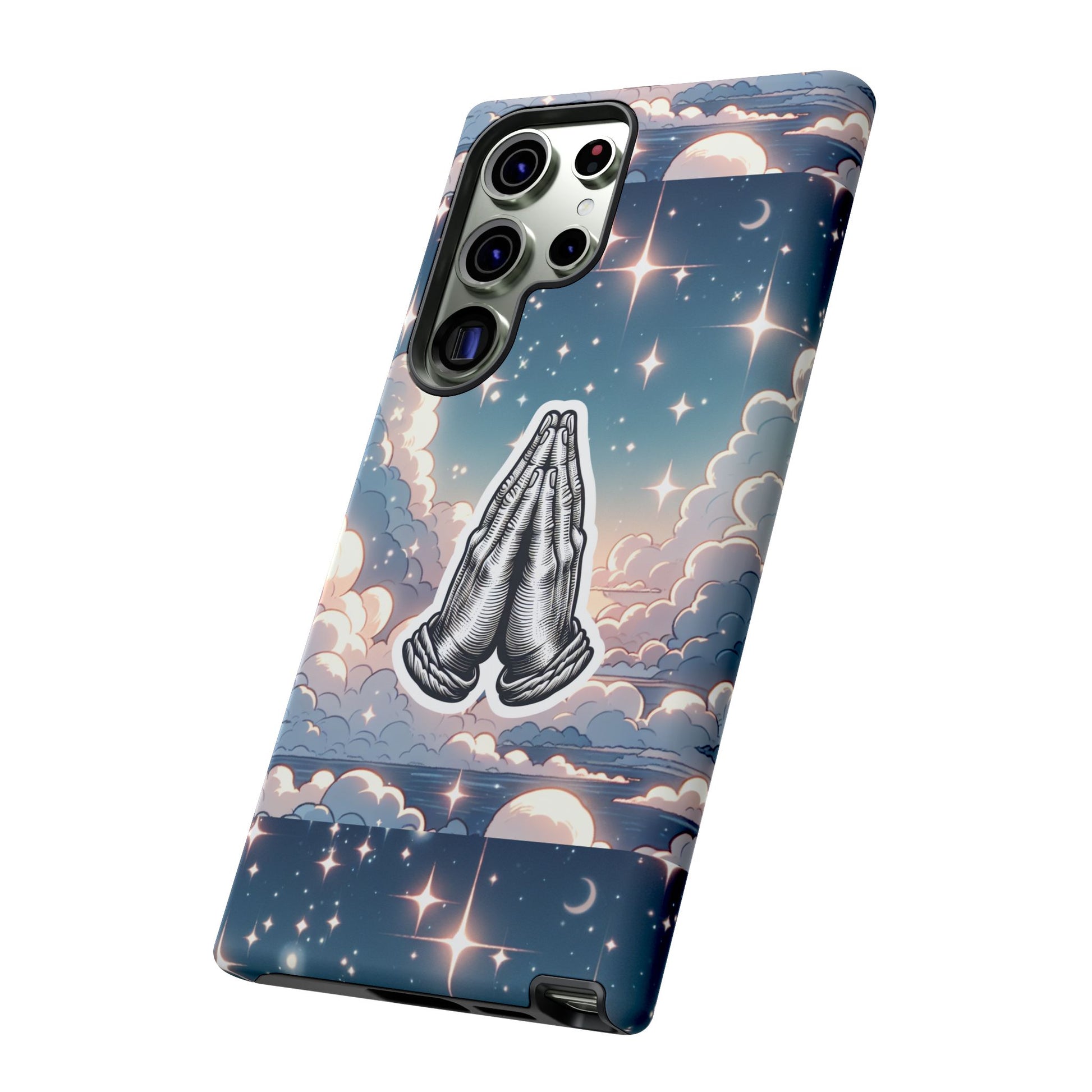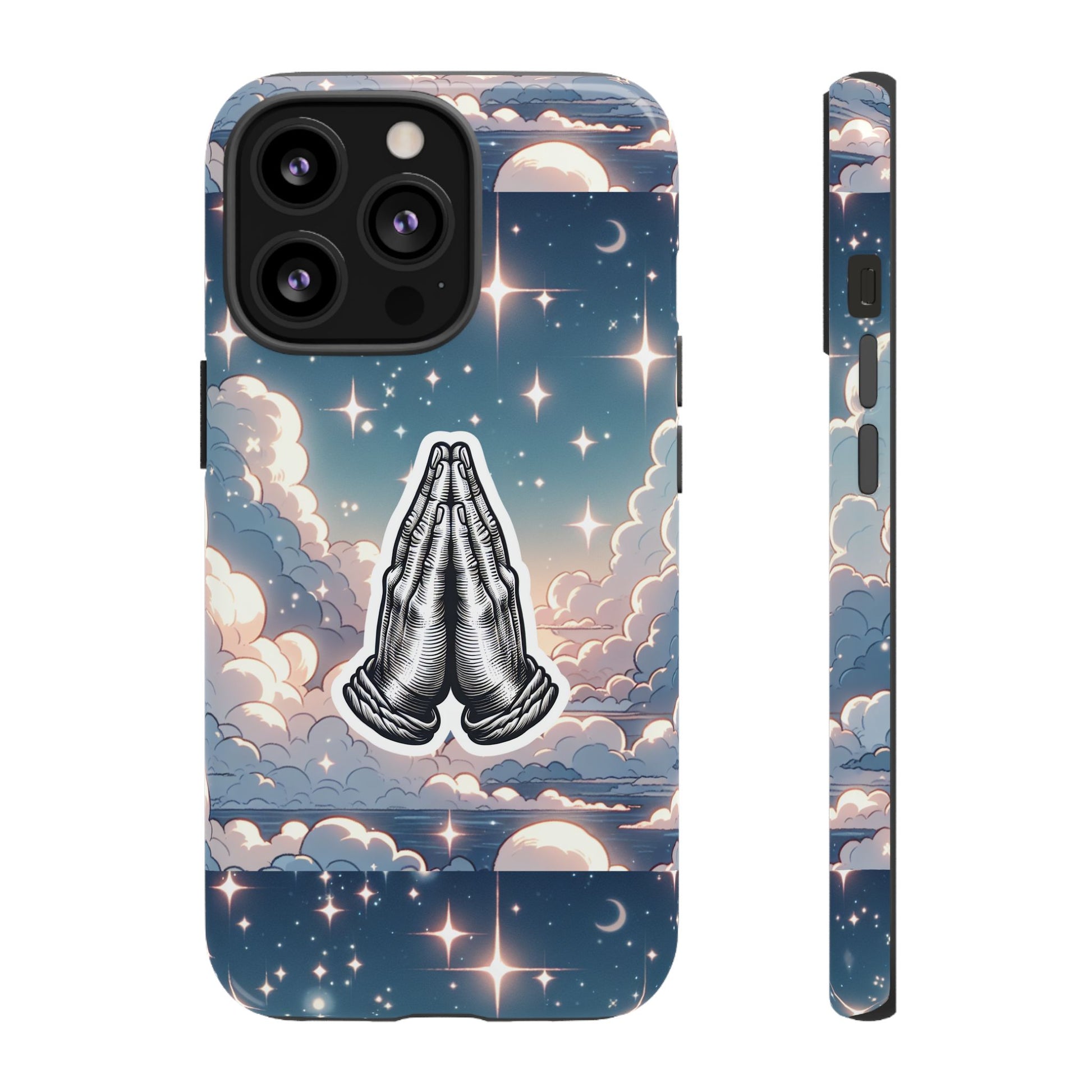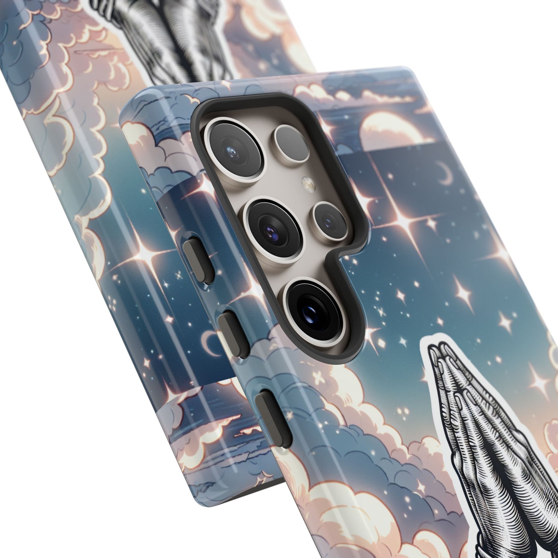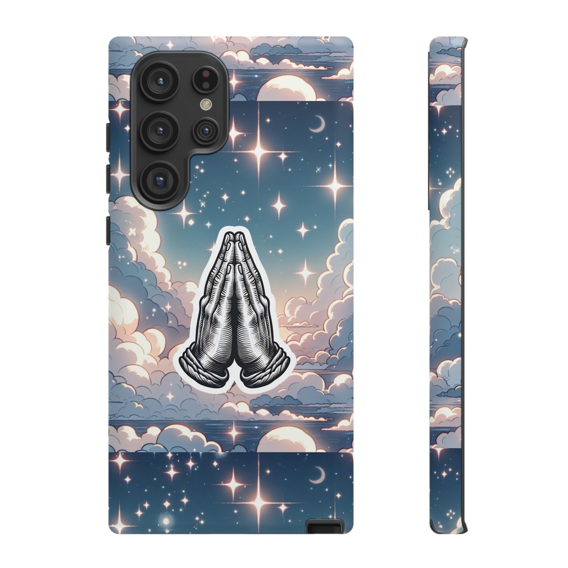 Protect your phone with these tough cases featuring praying hands above in the heavens design. Made of durable materials with impact resistance, shock absorption, and excellent outdoor weathering resistance. Suitable for adults, these cases offer dual-layer protection and support wireless charging. Perfect for those looking for stylish and protective phone accessories.