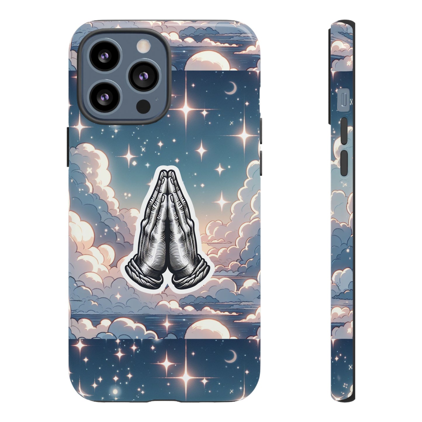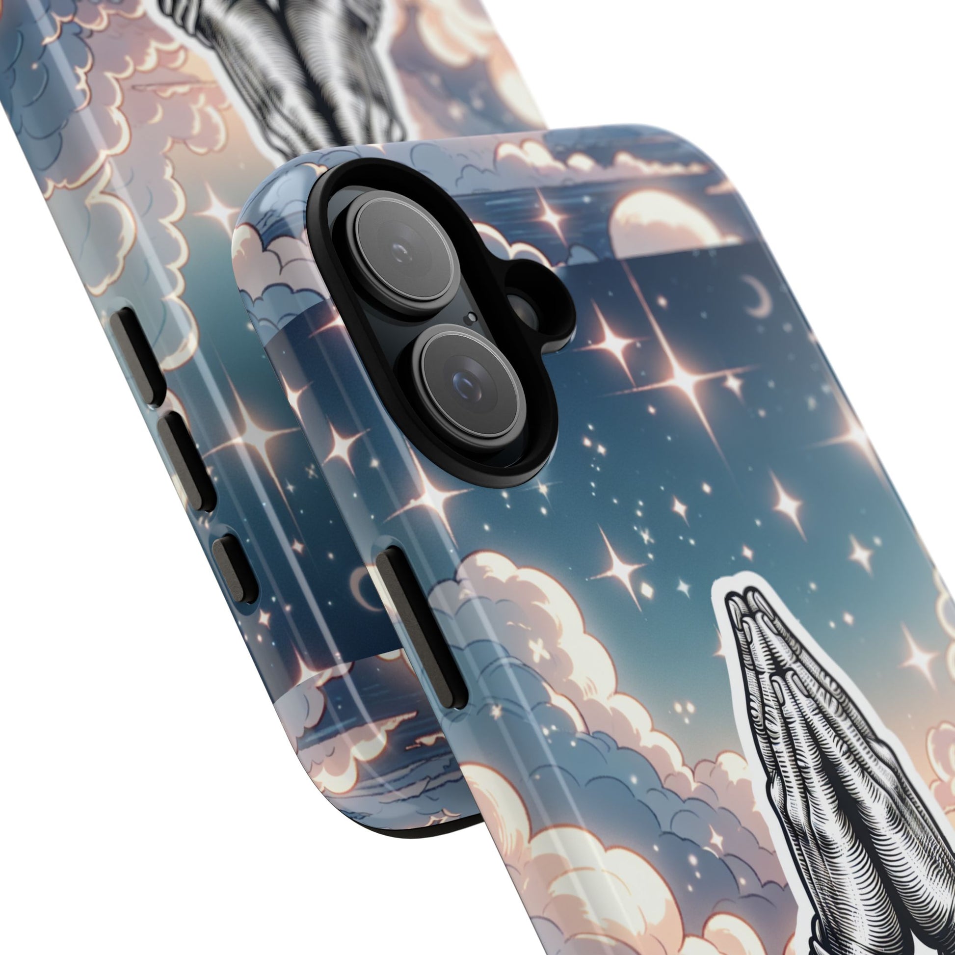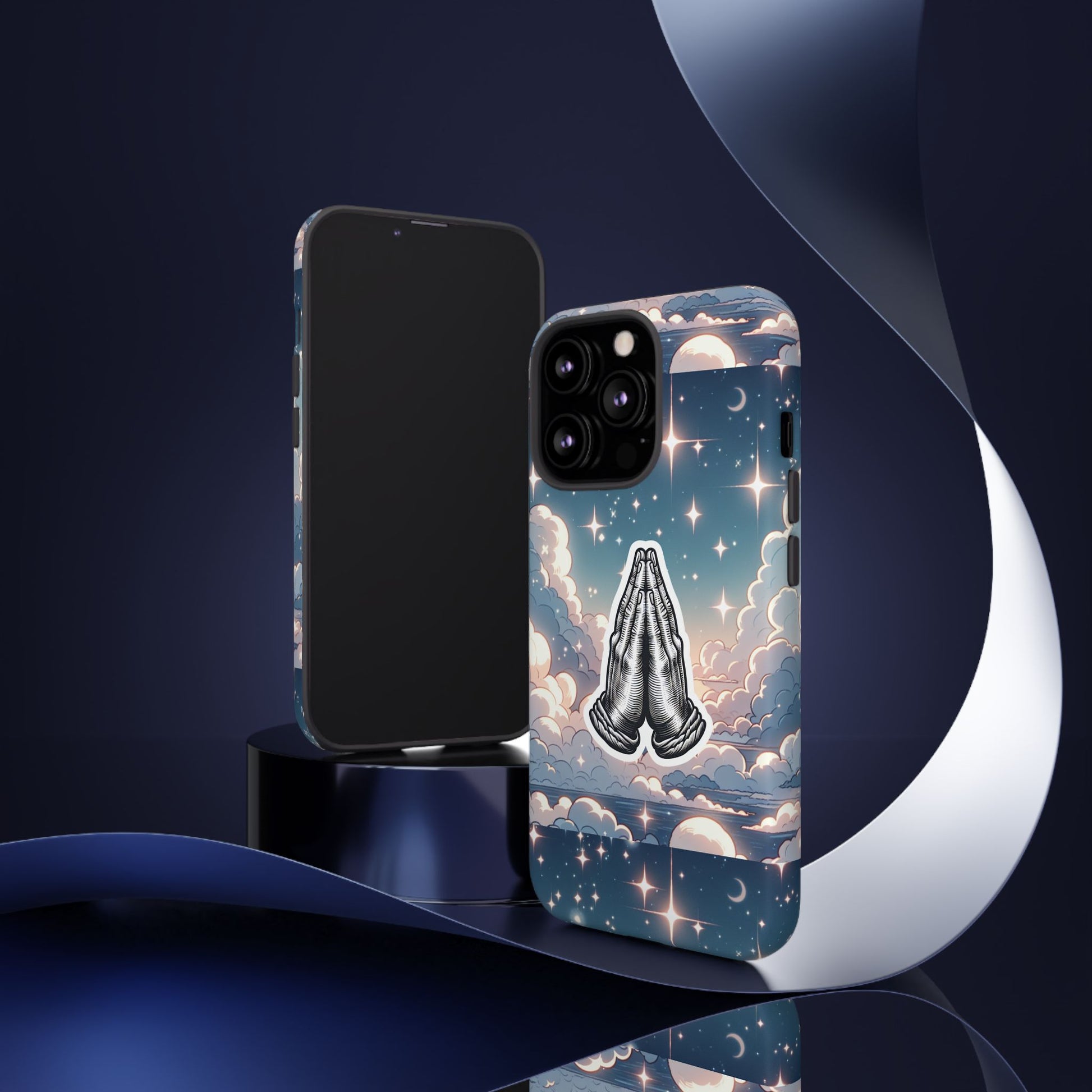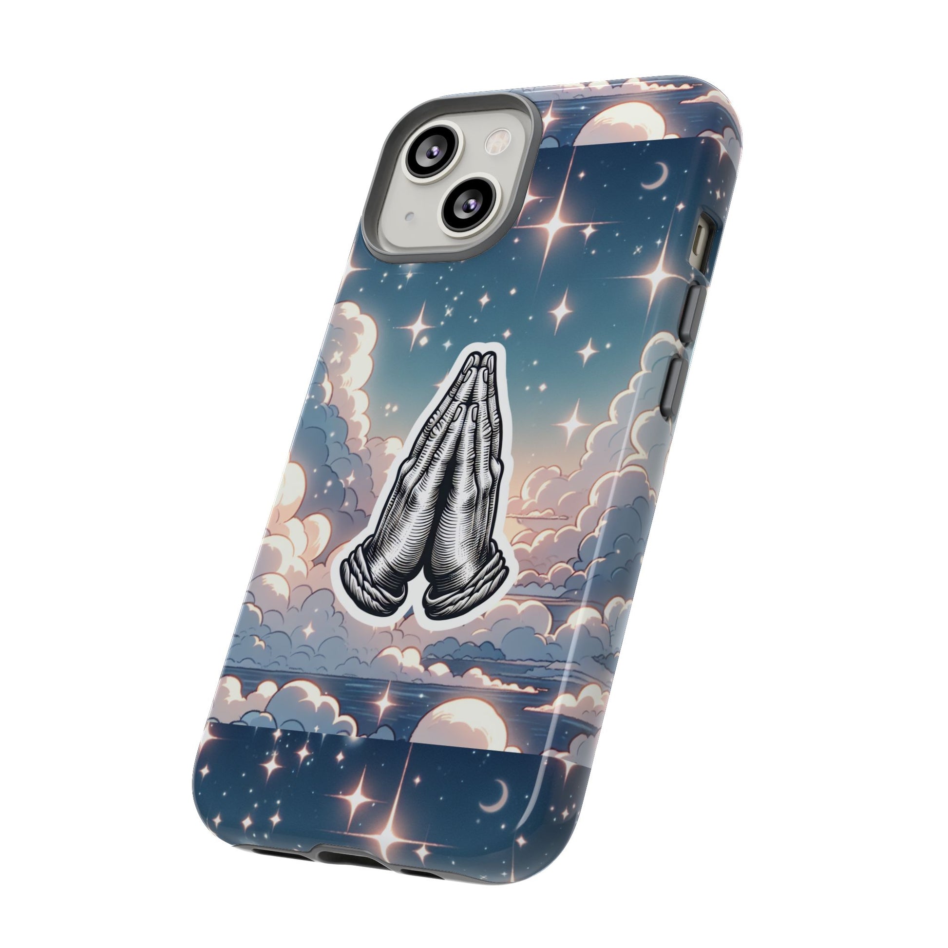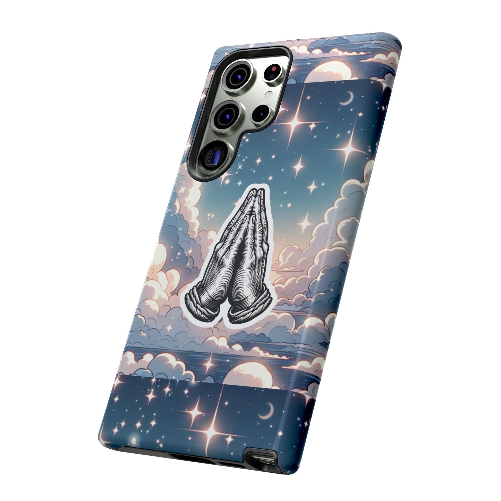 Protect your phone with these tough cases featuring praying hands above in the heavens design. Made of durable materials with impact resistance, shock absorption, and excellent outdoor weathering resistance. Suitable for adults, these cases offer dual-layer protection and support wireless charging. Perfect for those looking for stylish and protective phone accessories.