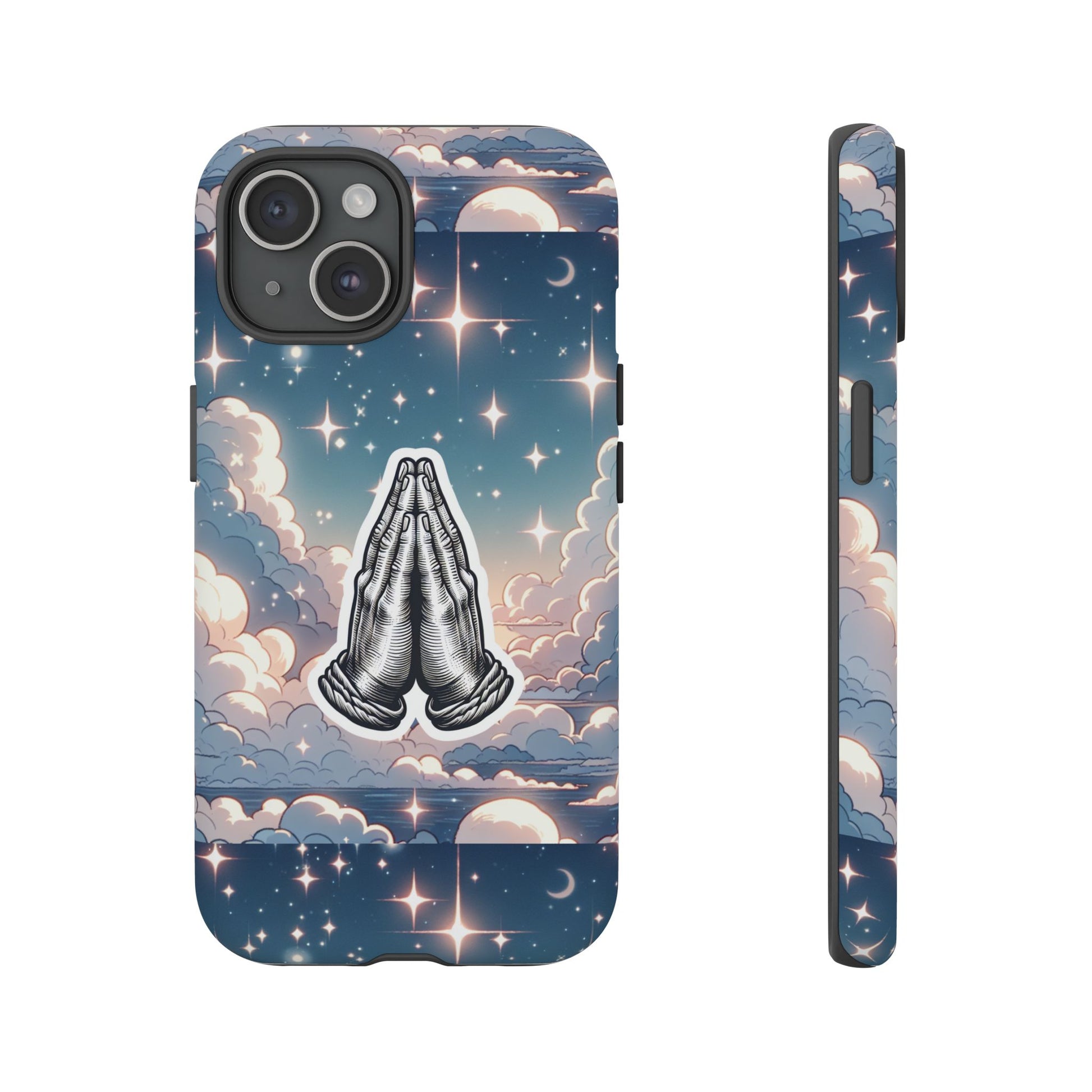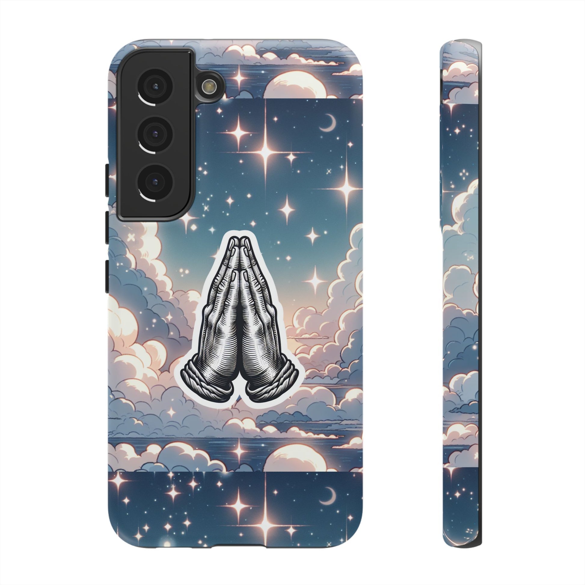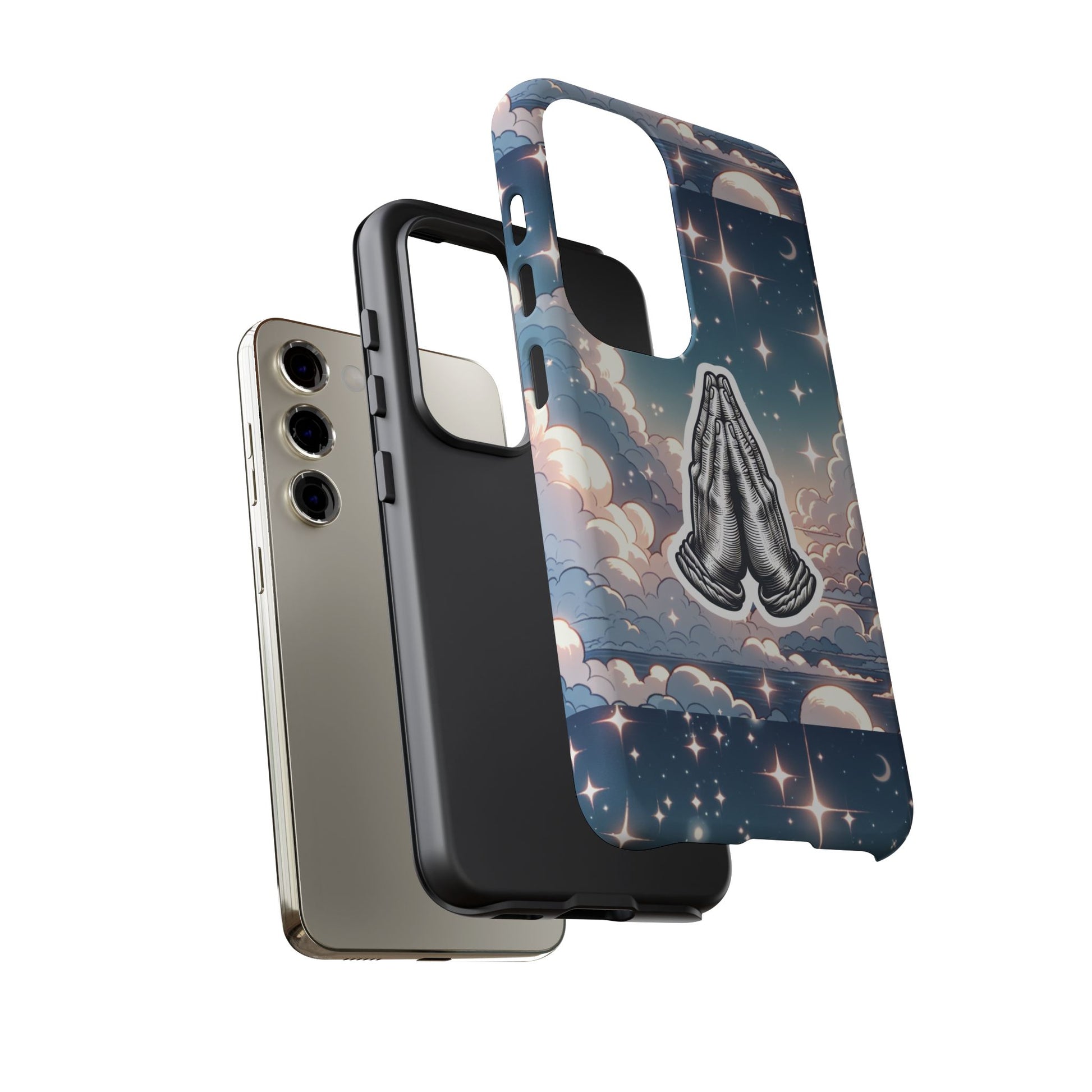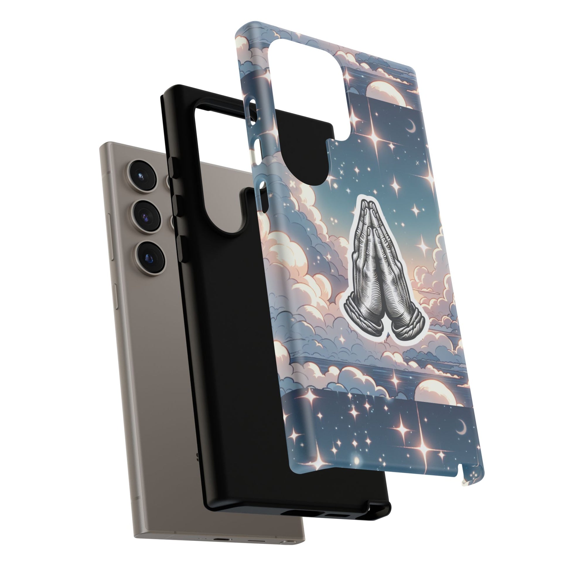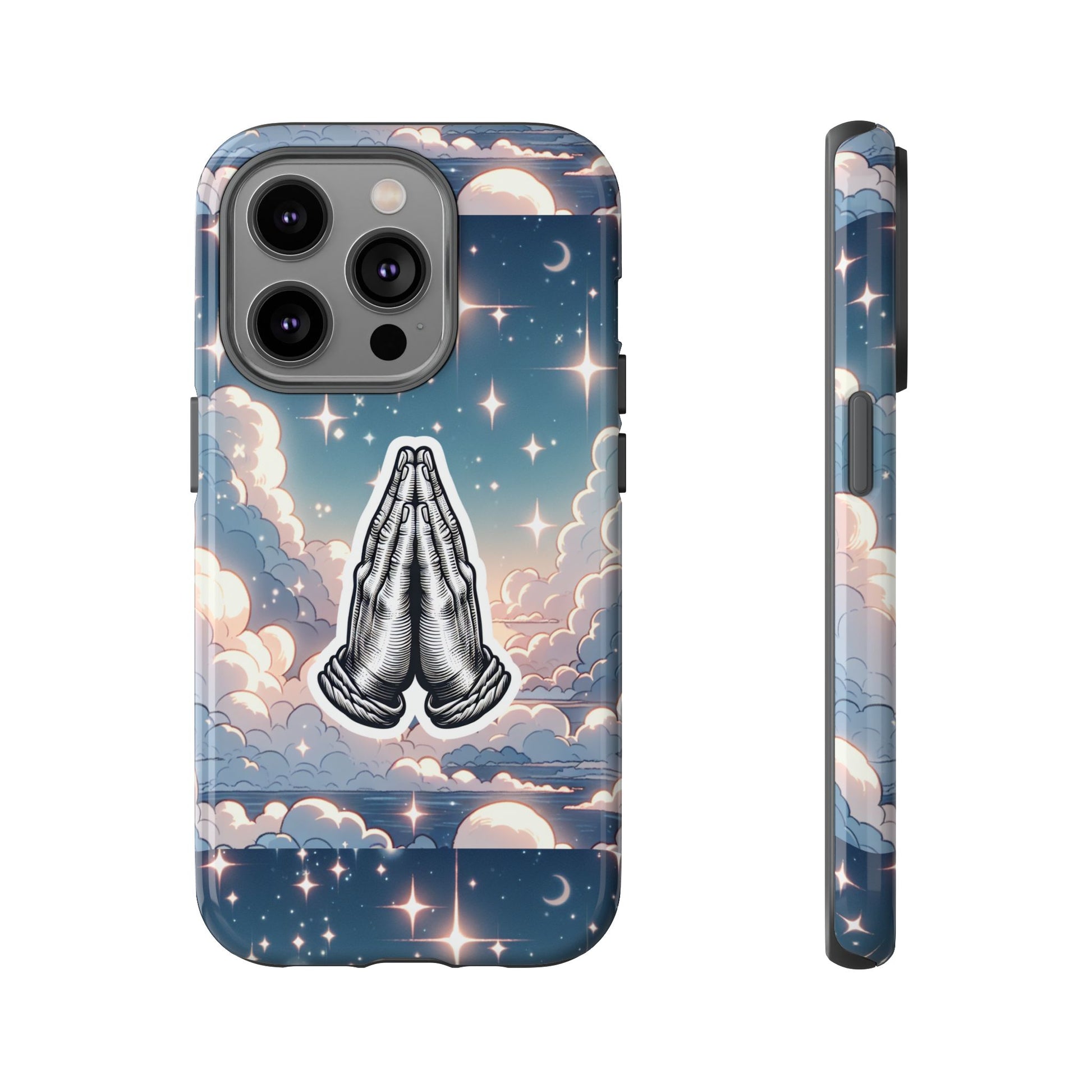 Protect your phone with these tough cases featuring praying hands above in the heavens design. Made of durable materials with impact resistance, shock absorption, and excellent outdoor weathering resistance. Suitable for adults, these cases offer dual-layer protection and support wireless charging. Perfect for those looking for stylish and protective phone accessories.