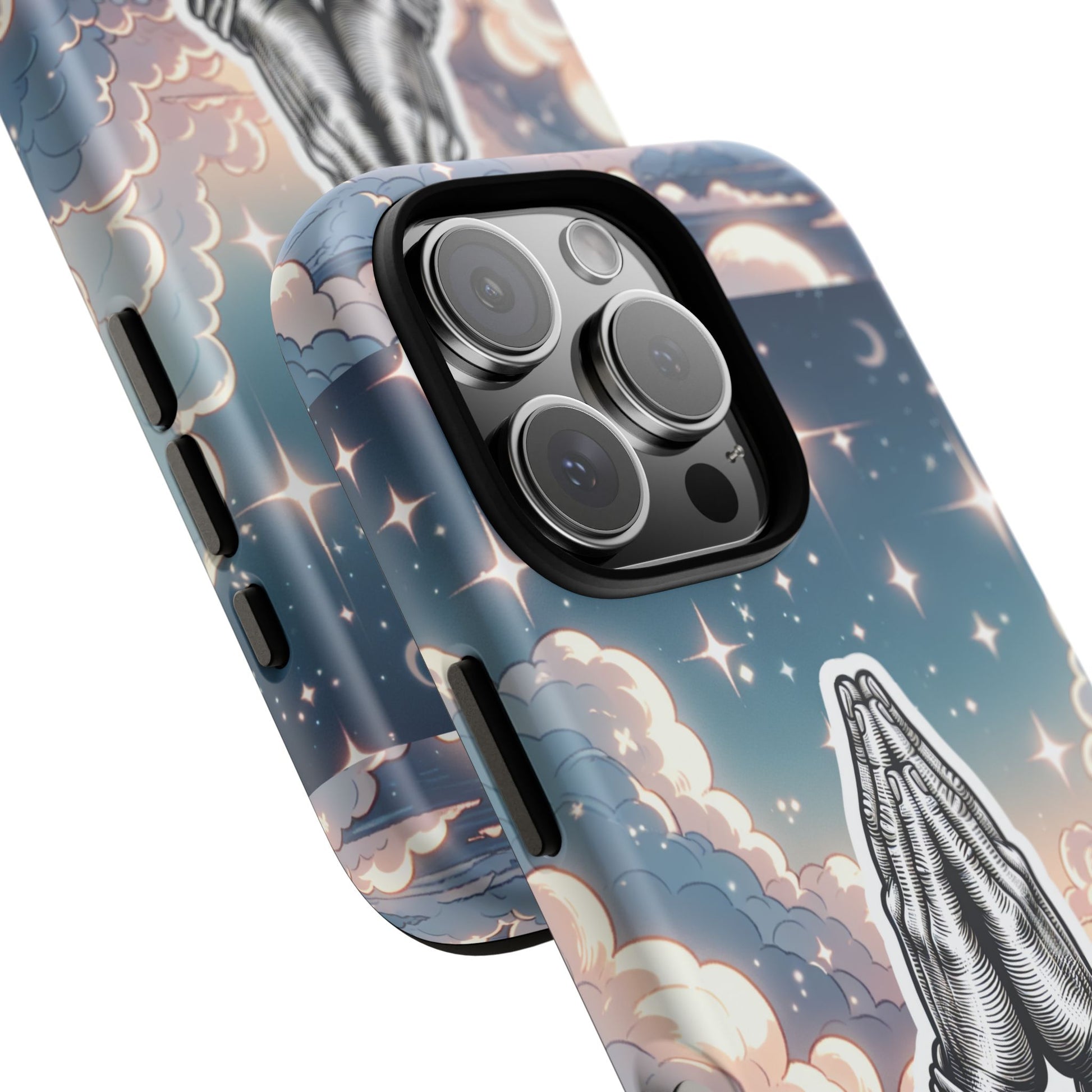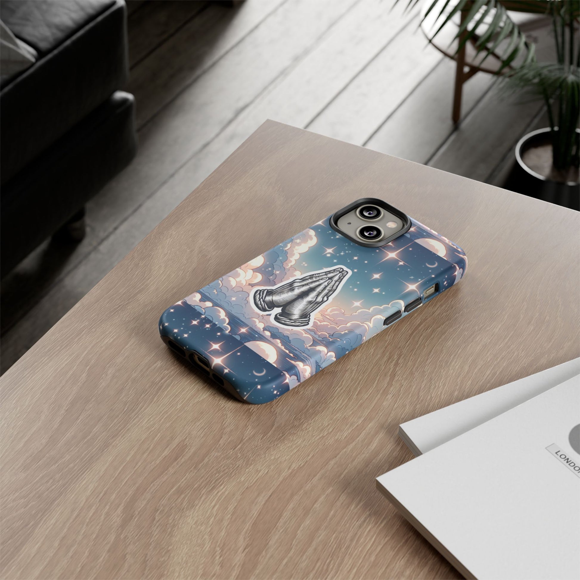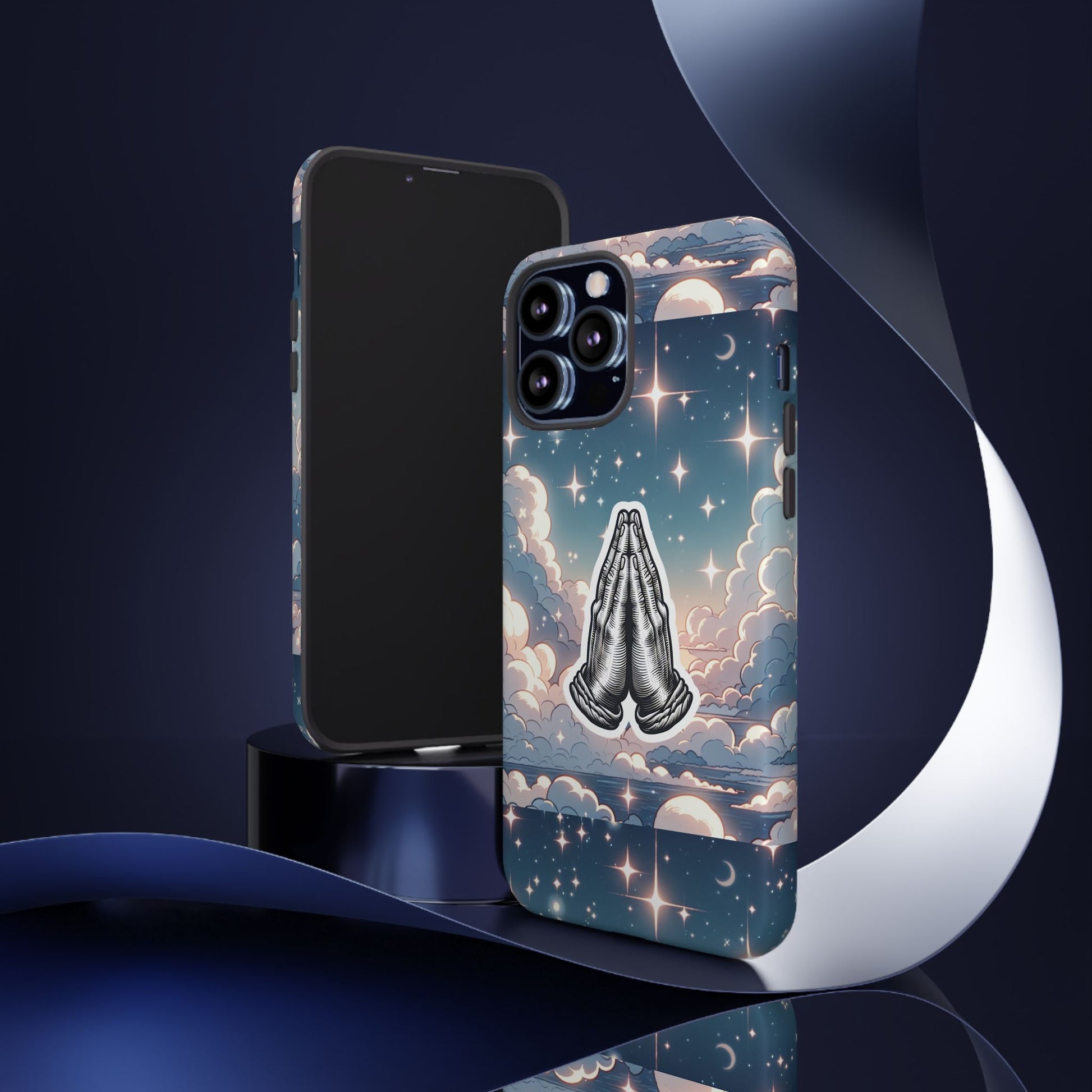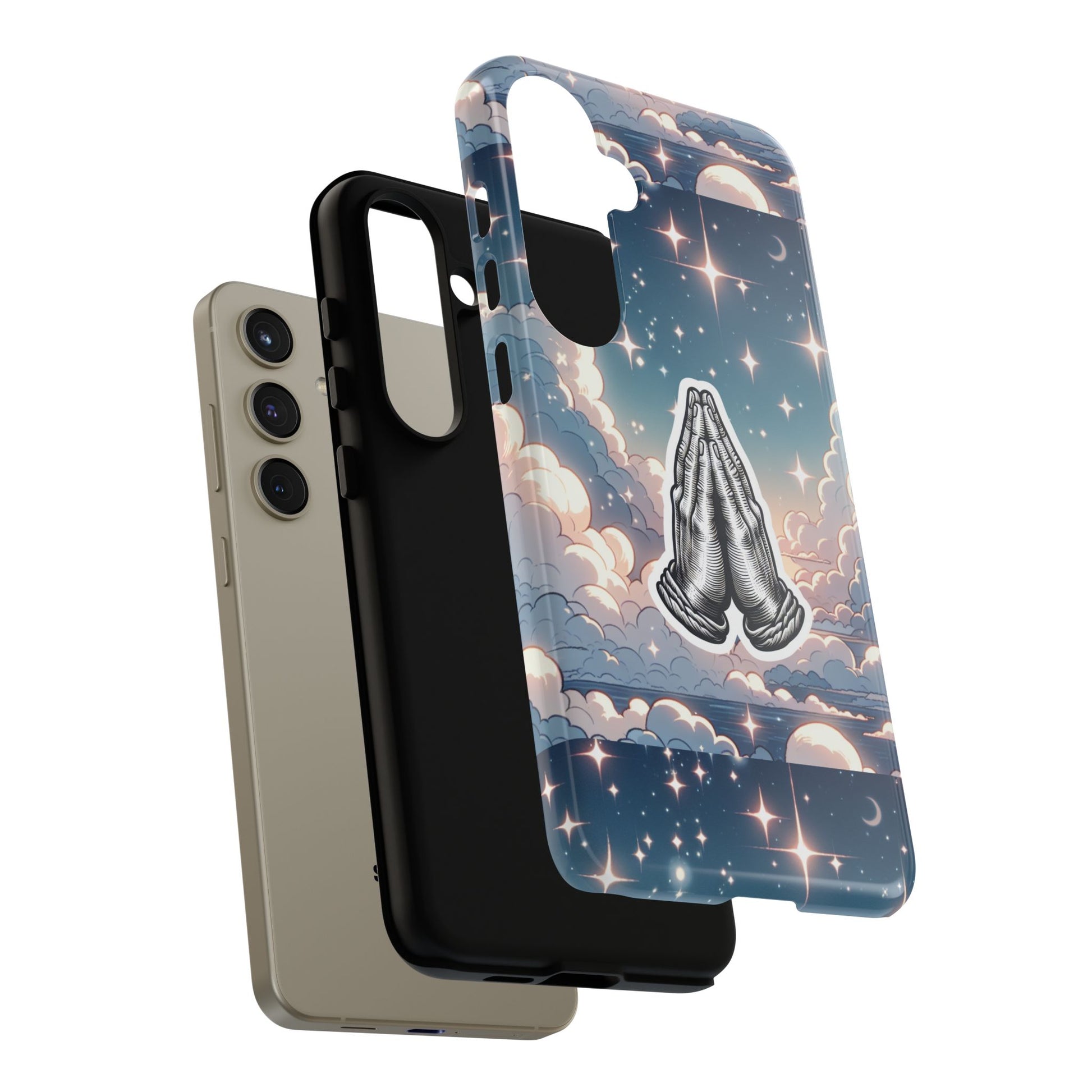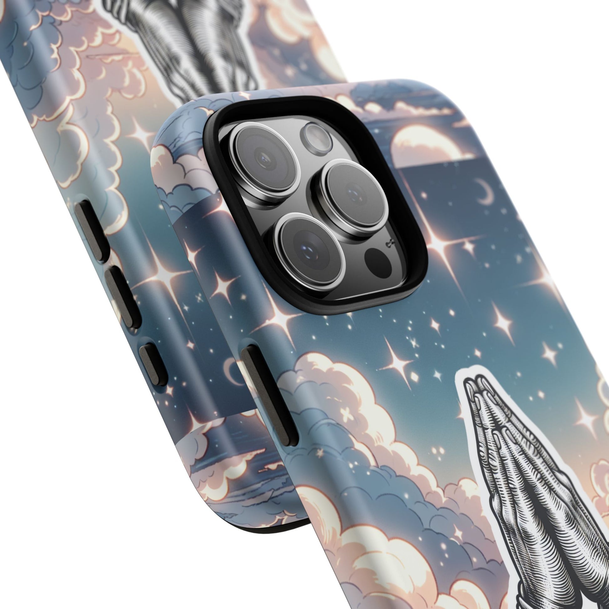Protect your phone with these tough cases featuring praying hands above in the heavens design. Made of durable materials with impact resistance, shock absorption, and excellent outdoor weathering resistance. Suitable for adults, these cases offer dual-layer protection and support wireless charging. Perfect for those looking for stylish and protective phone accessories.