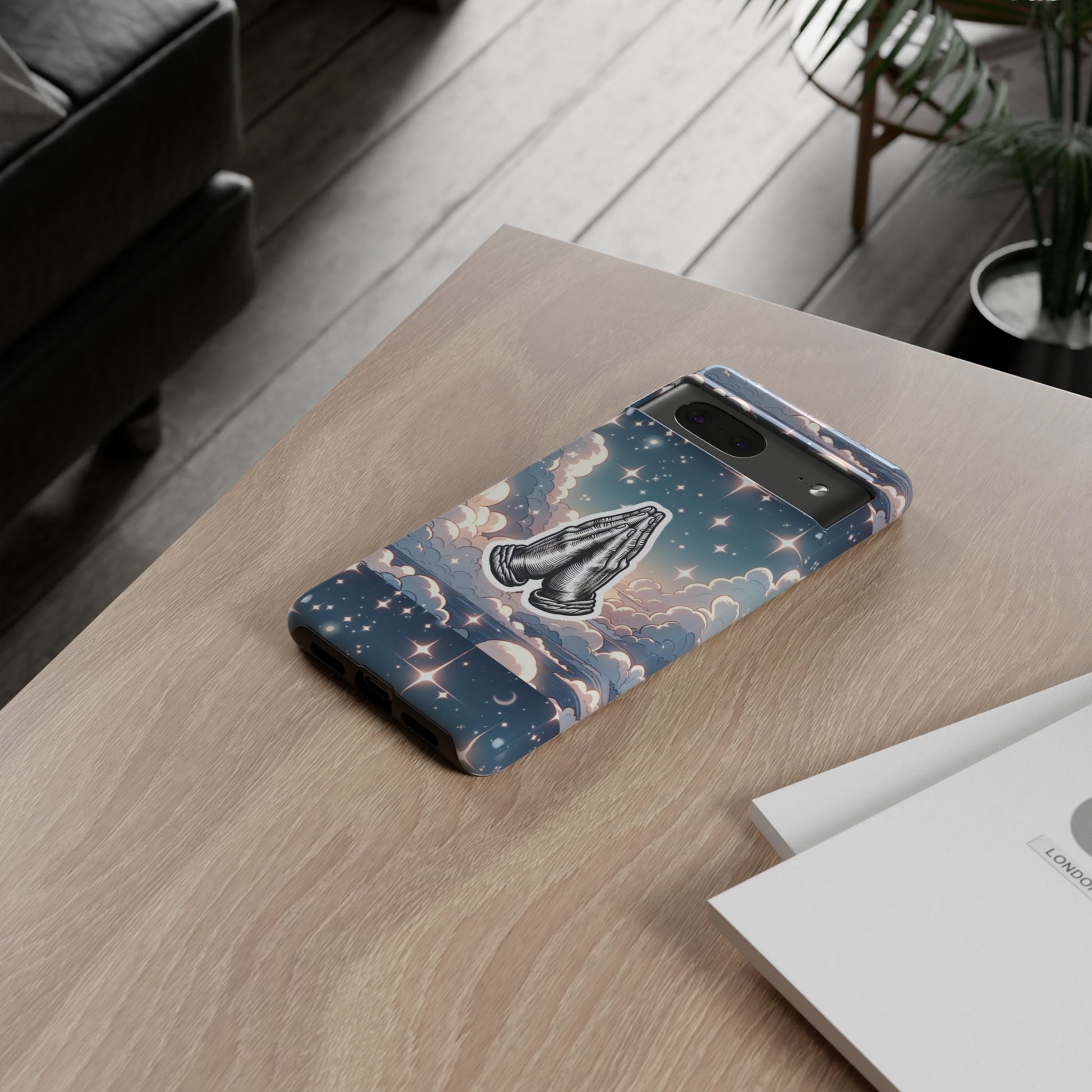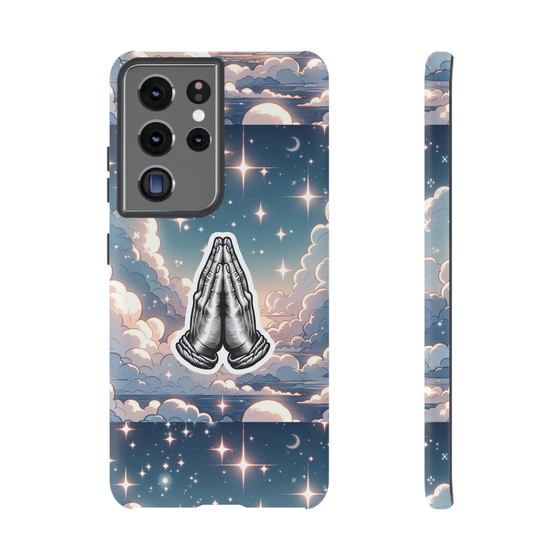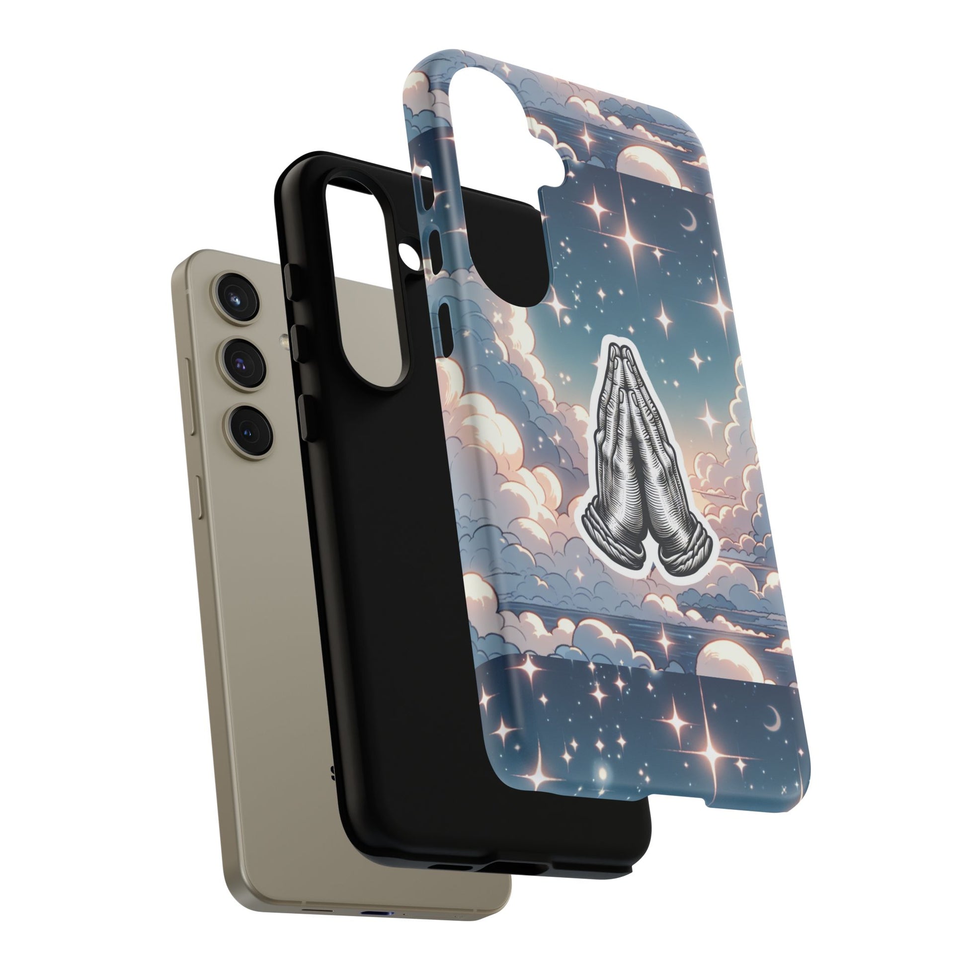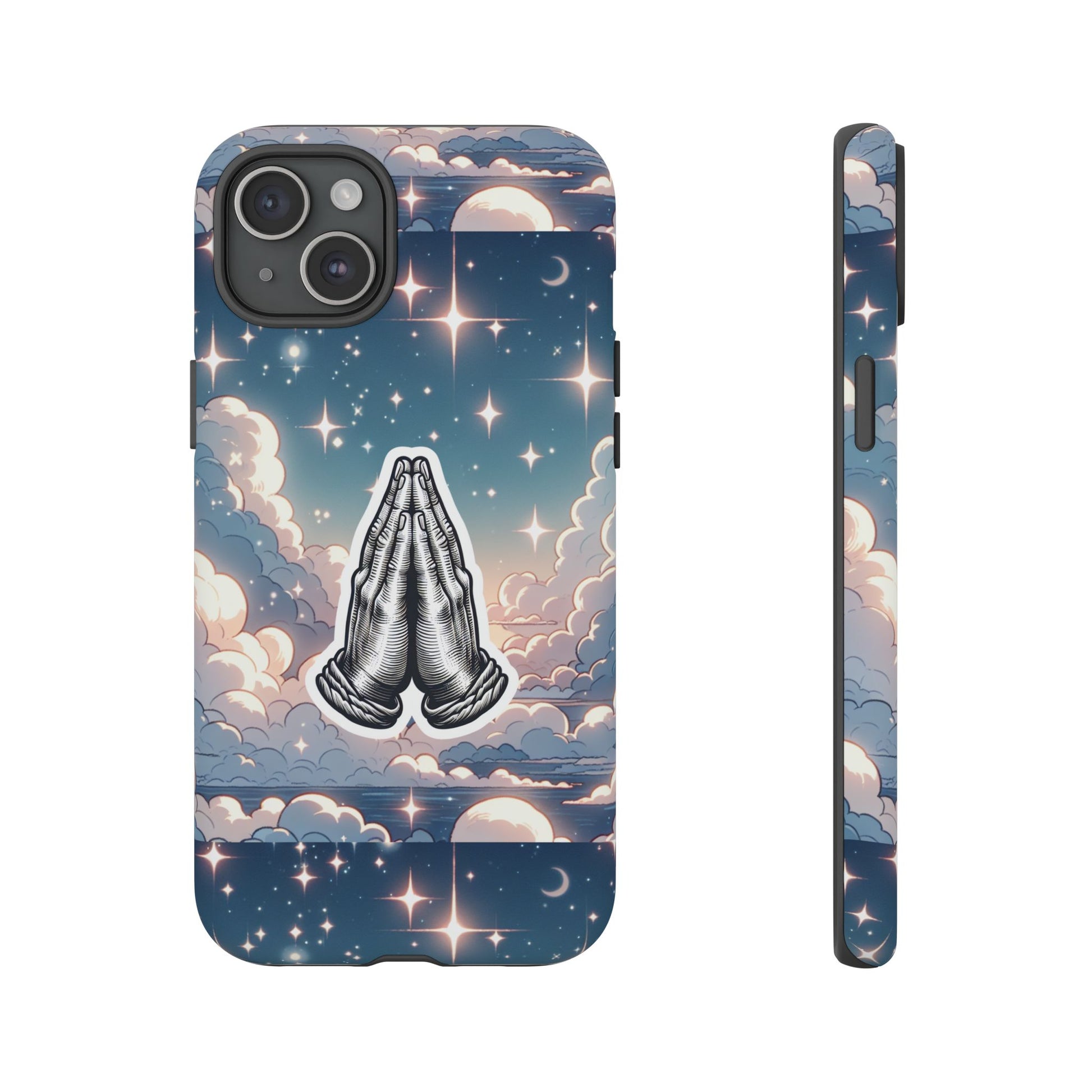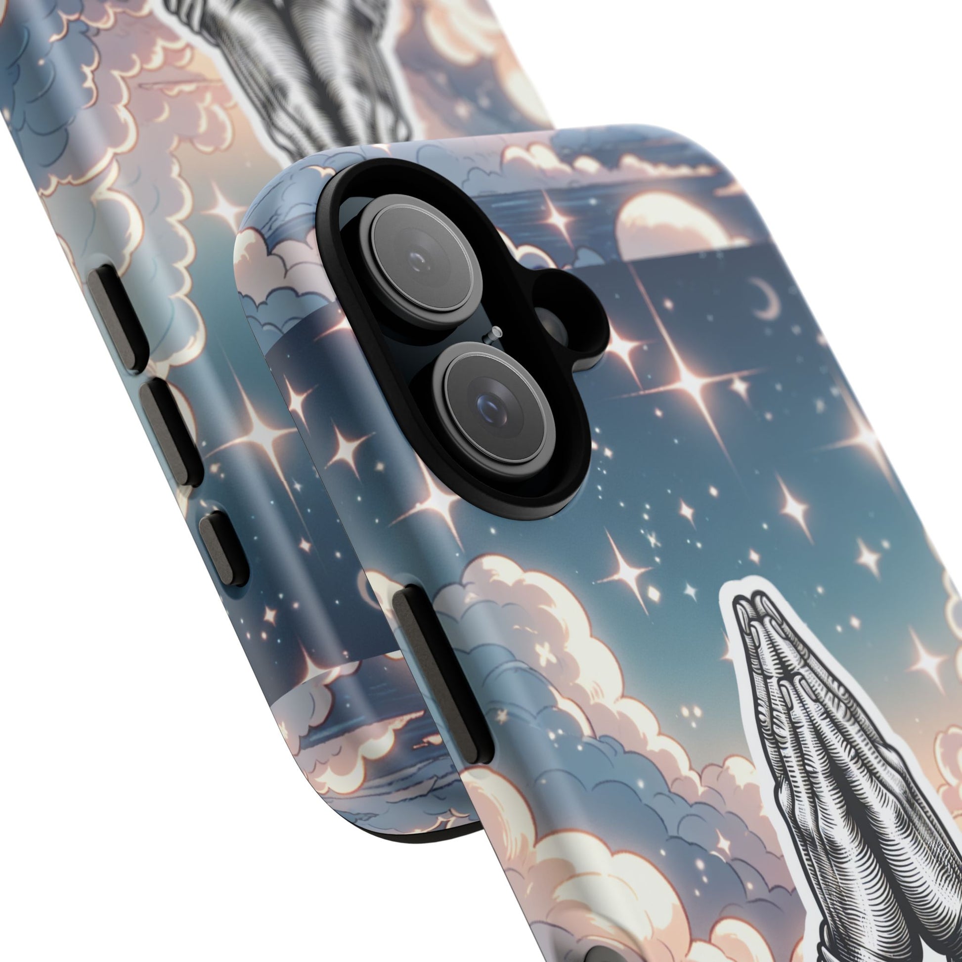 Protect your phone with these tough cases featuring praying hands above in the heavens design. Made of durable materials with impact resistance, shock absorption, and excellent outdoor weathering resistance. Suitable for adults, these cases offer dual-layer protection and support wireless charging. Perfect for those looking for stylish and protective phone accessories.