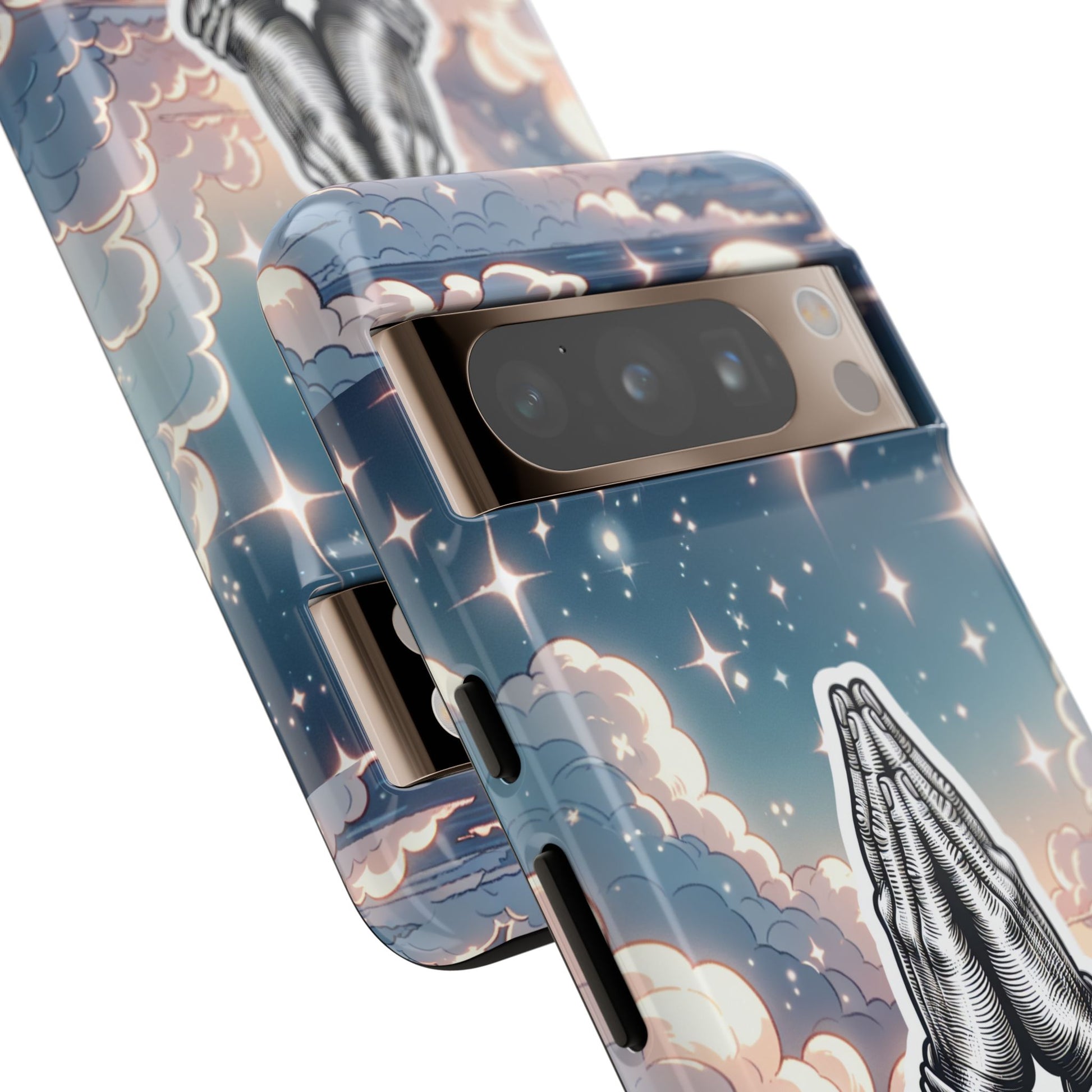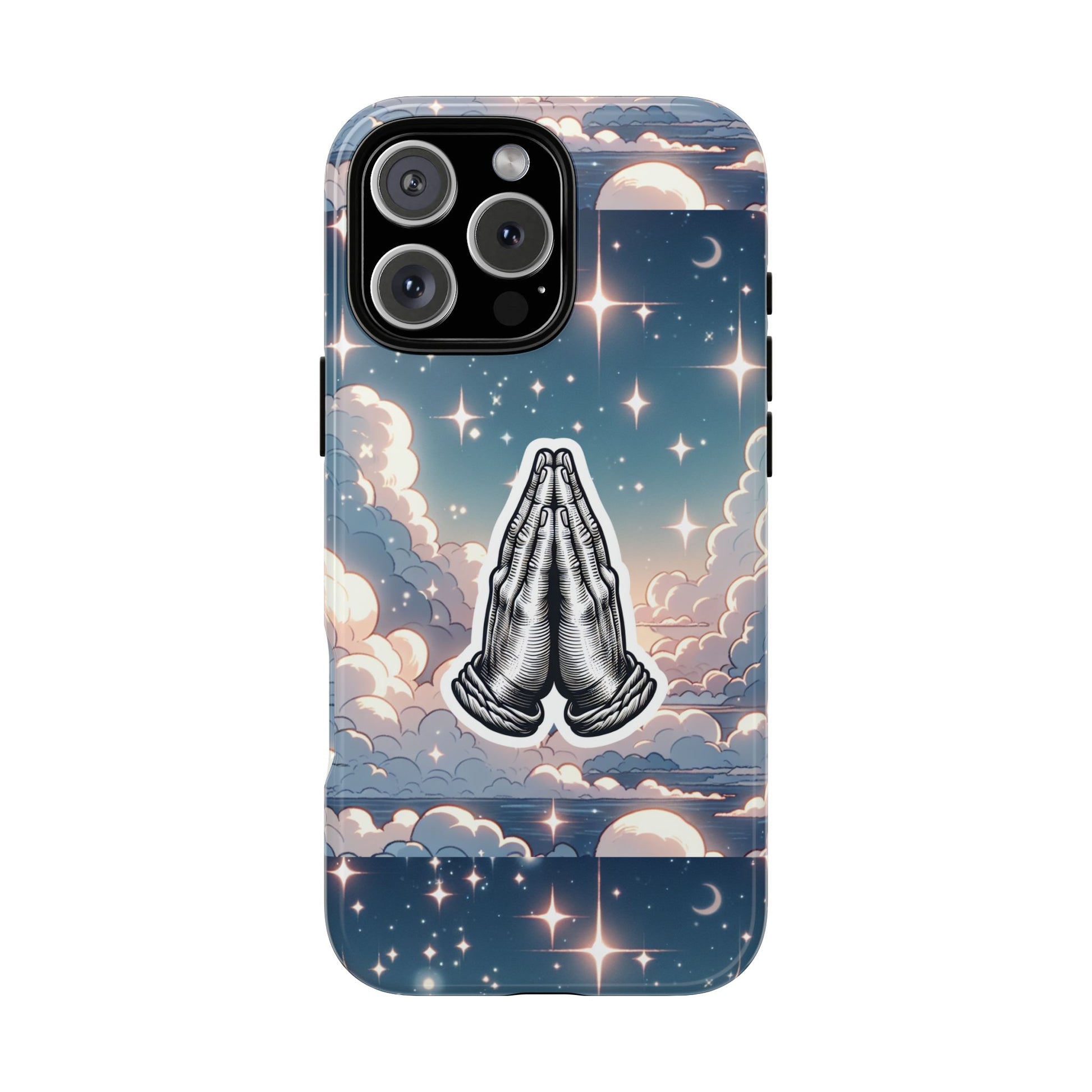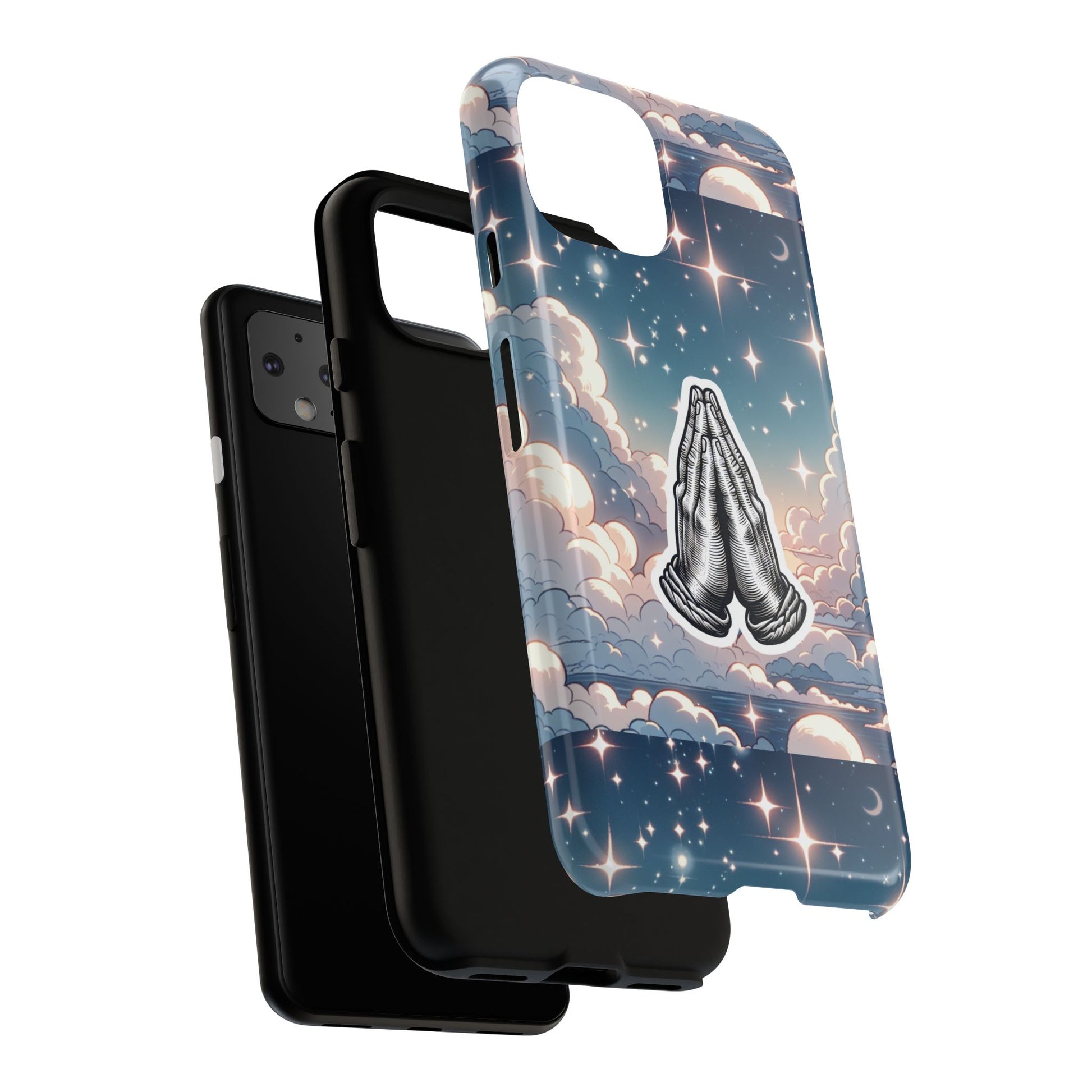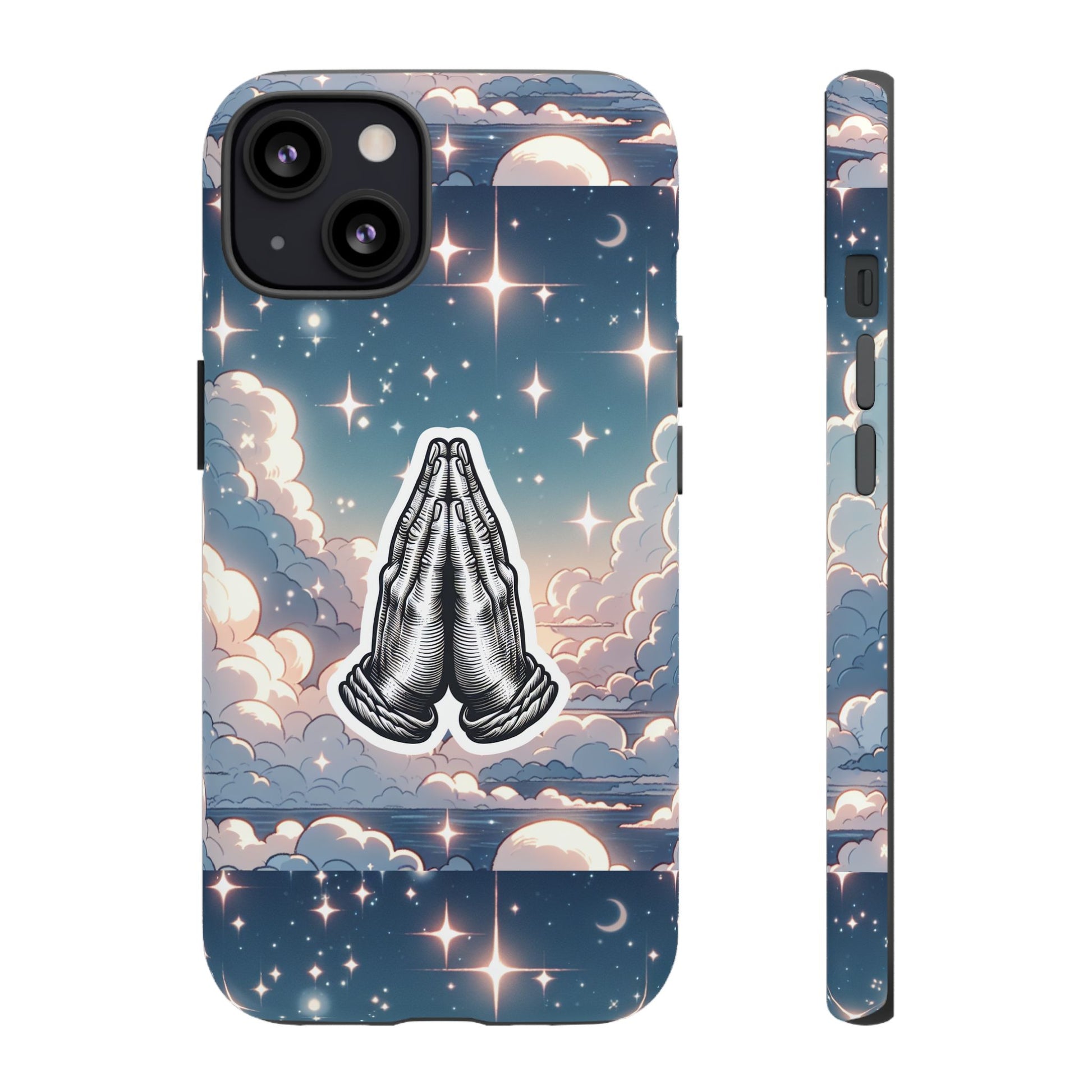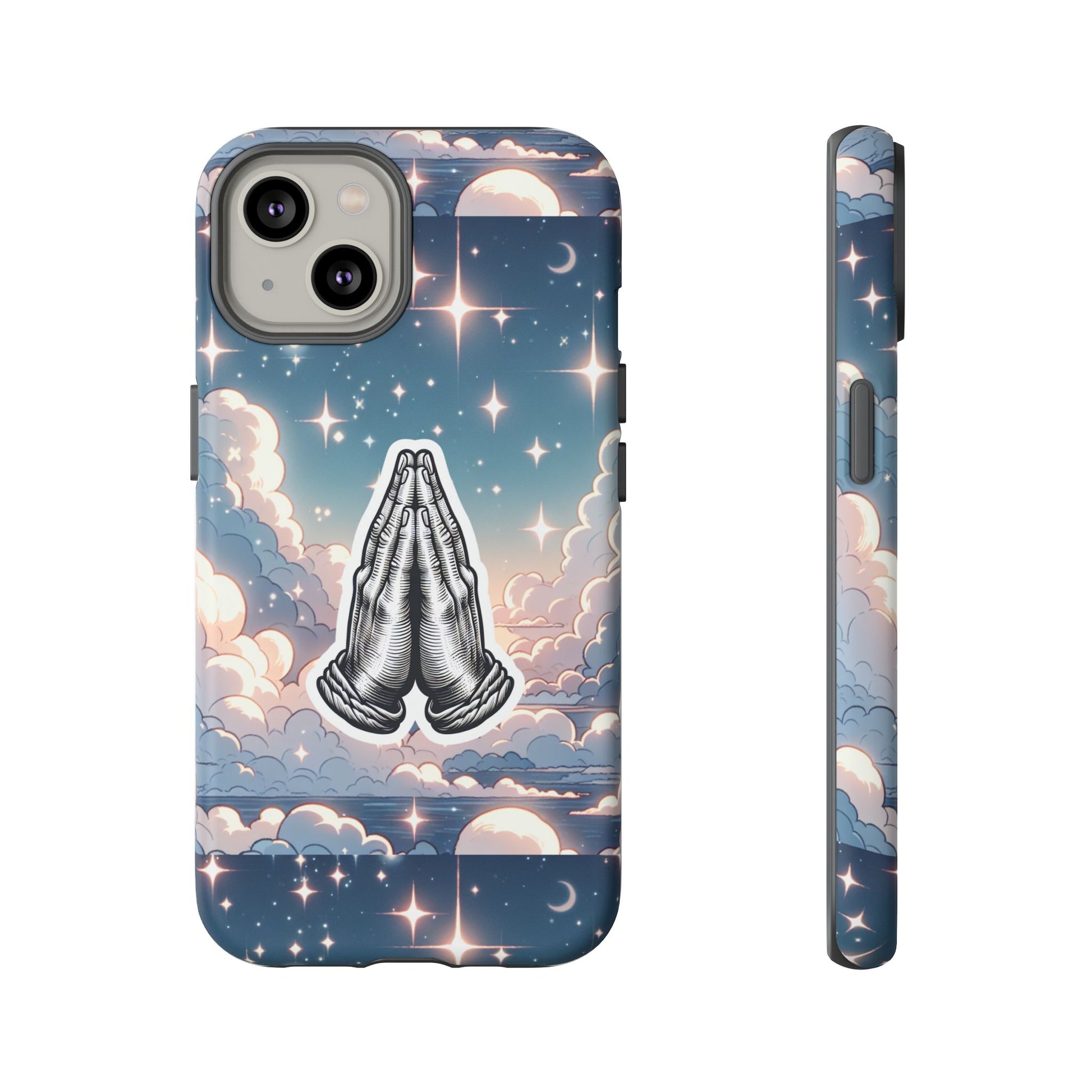 Protect your phone with these tough cases featuring praying hands above in the heavens design. Made of durable materials with impact resistance, shock absorption, and excellent outdoor weathering resistance. Suitable for adults, these cases offer dual-layer protection and support wireless charging. Perfect for those looking for stylish and protective phone accessories.