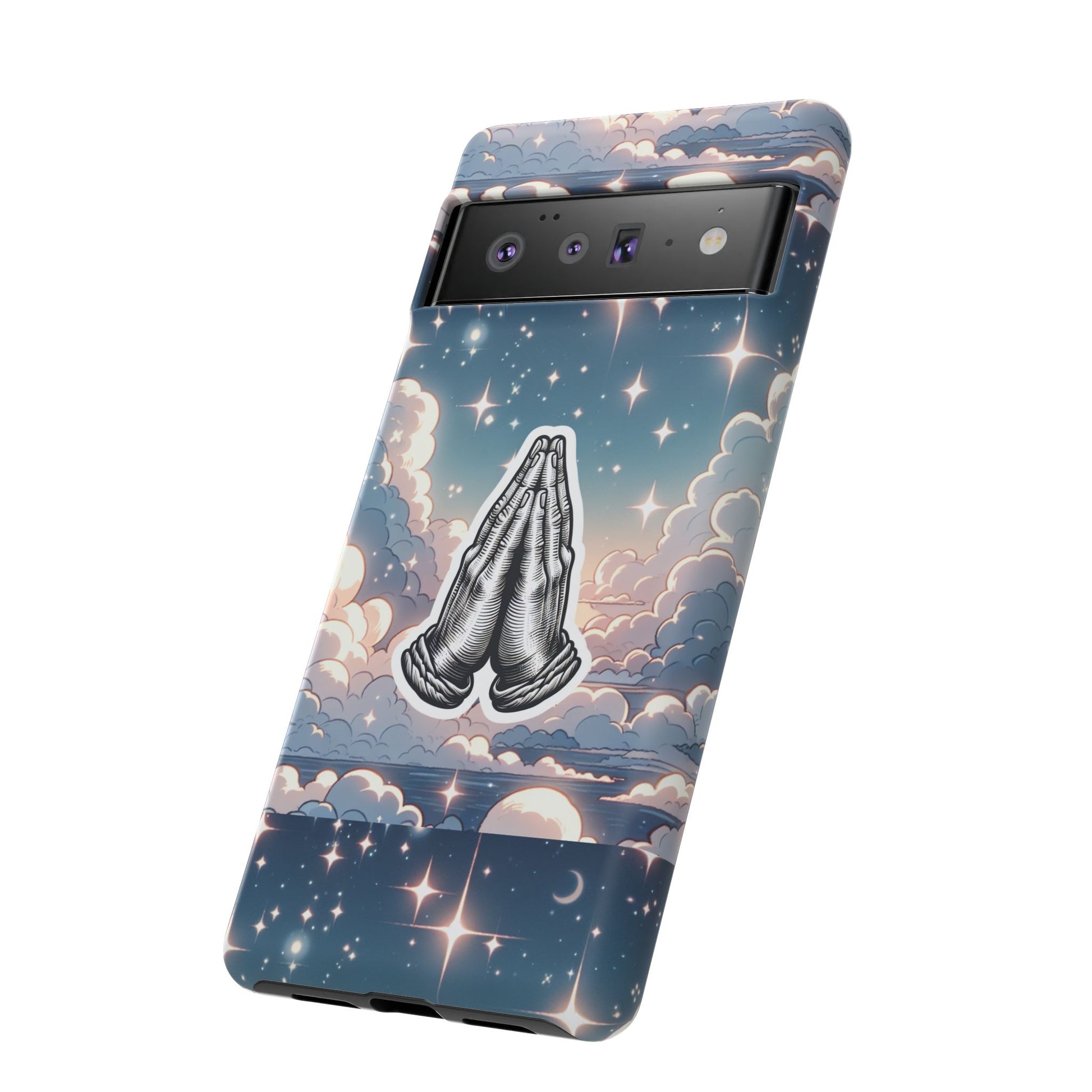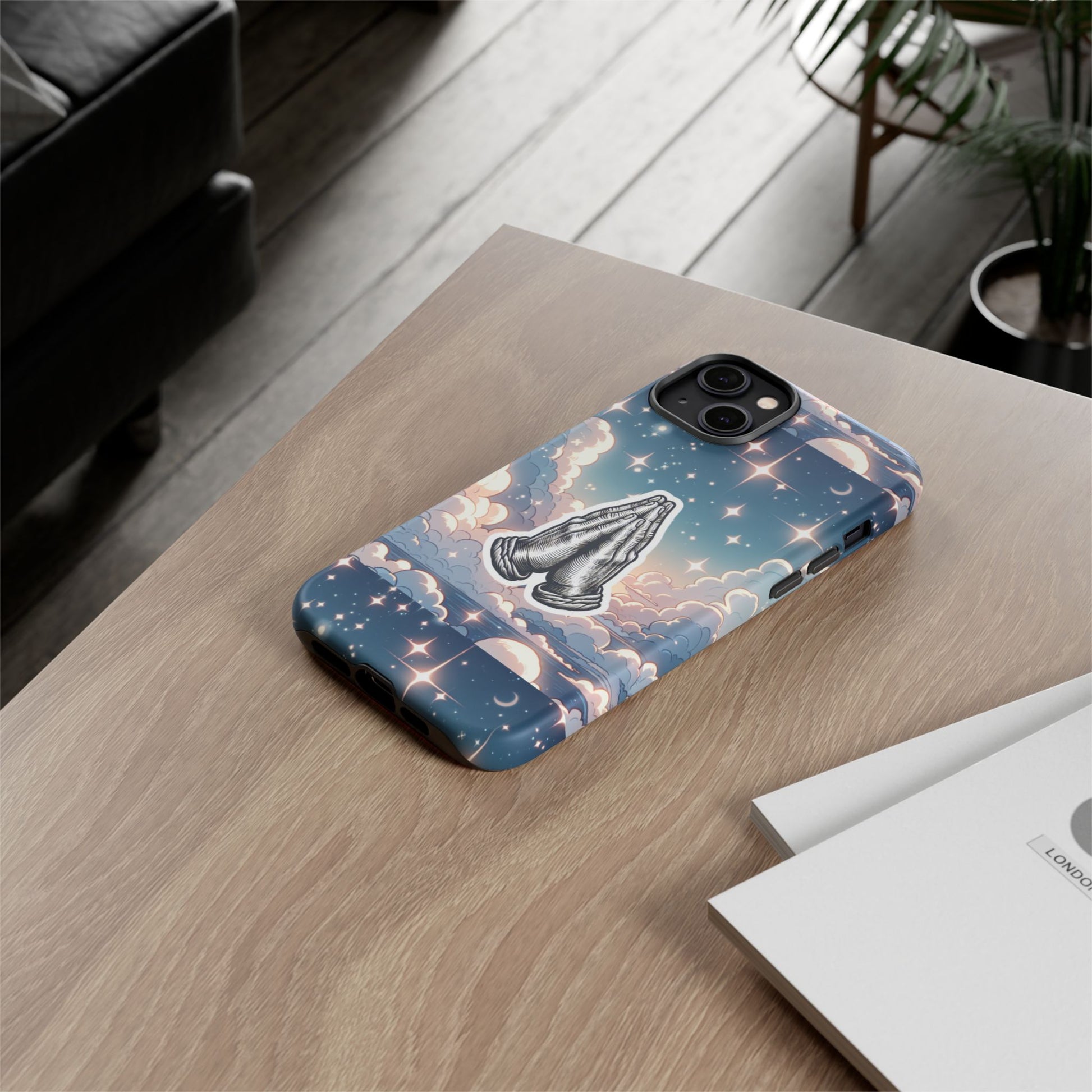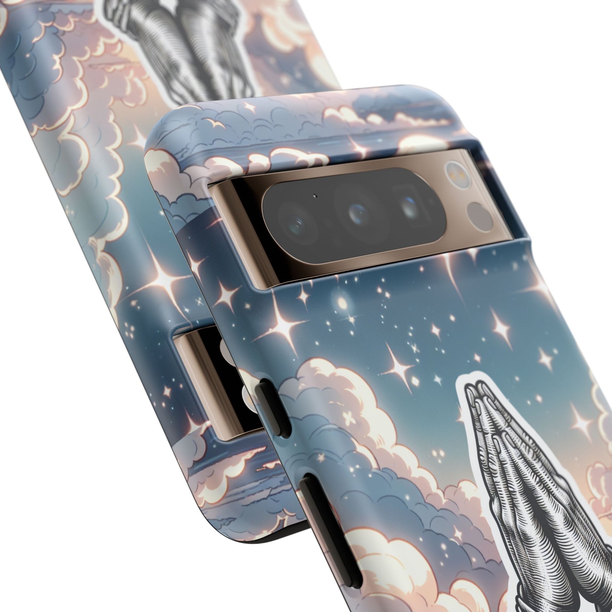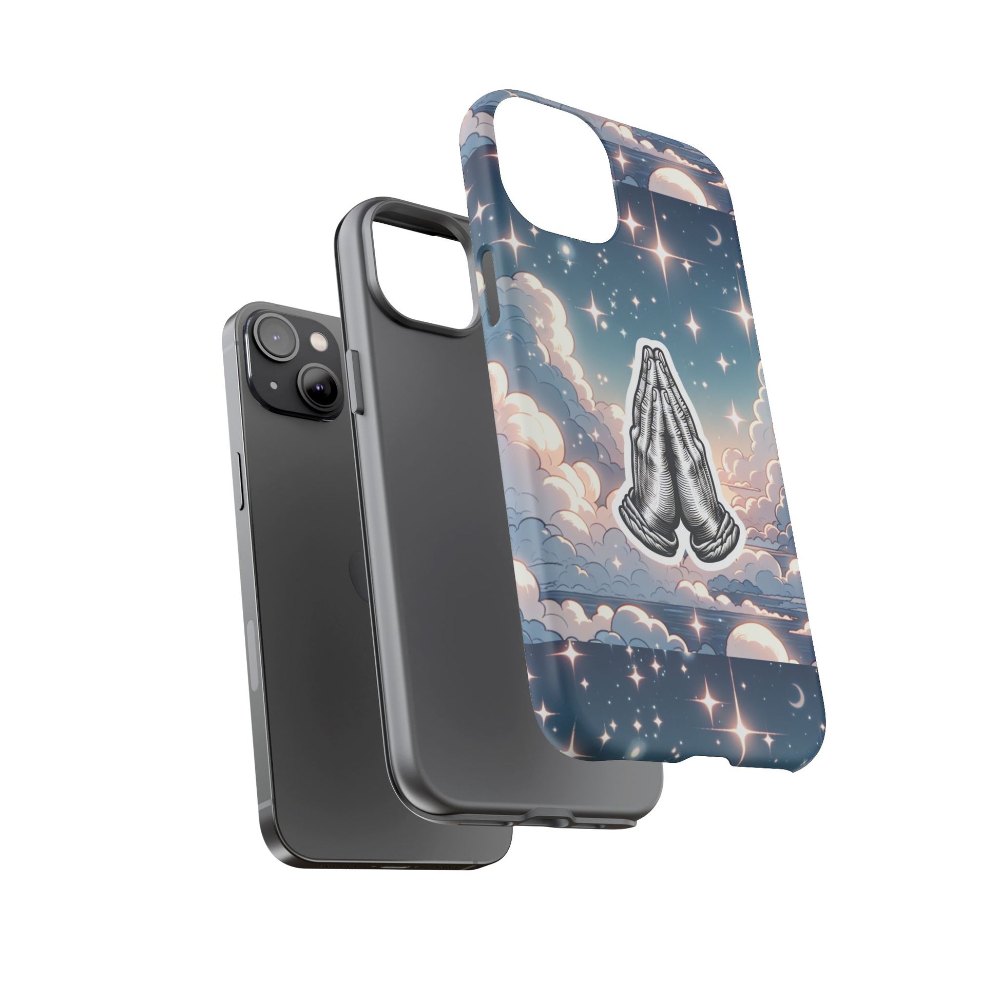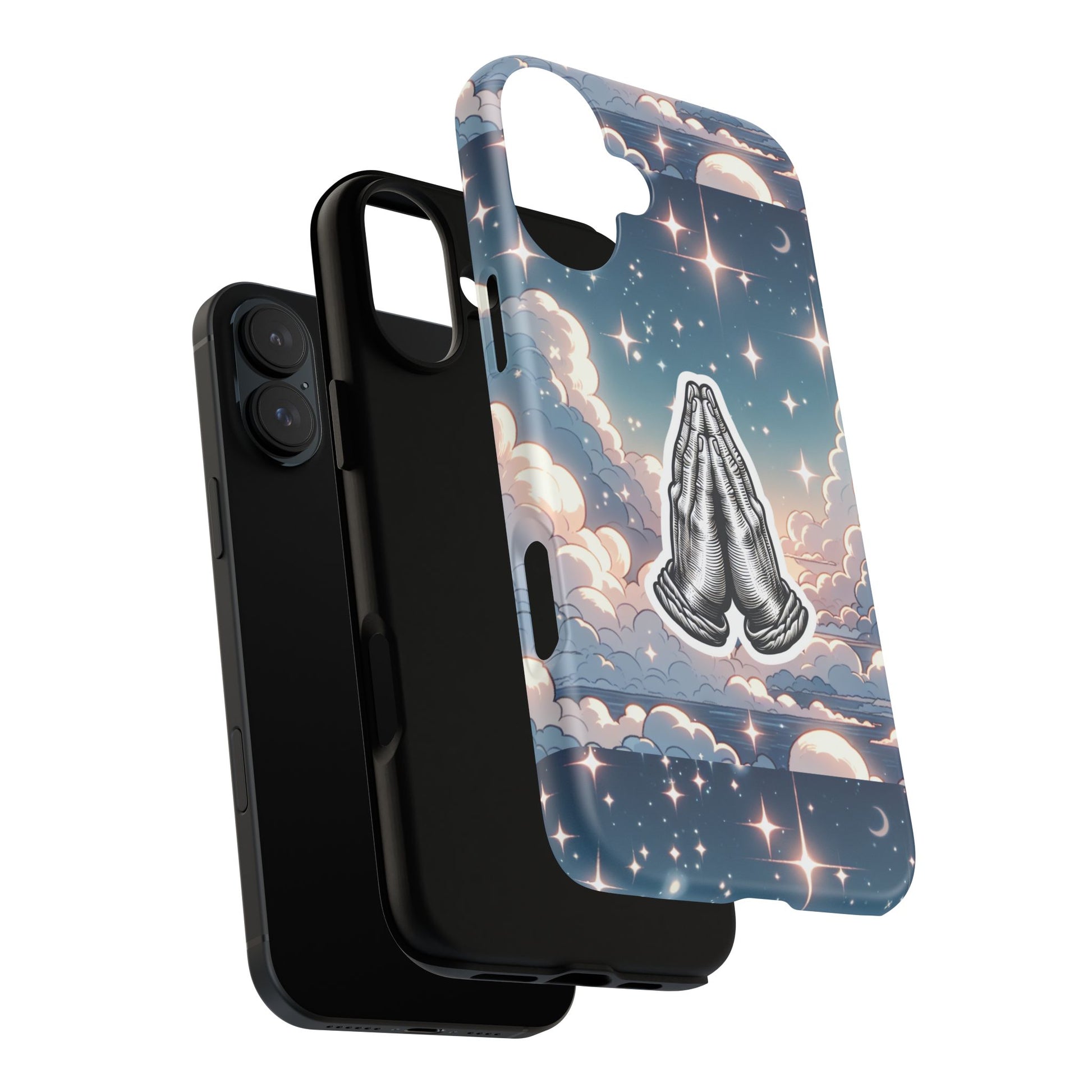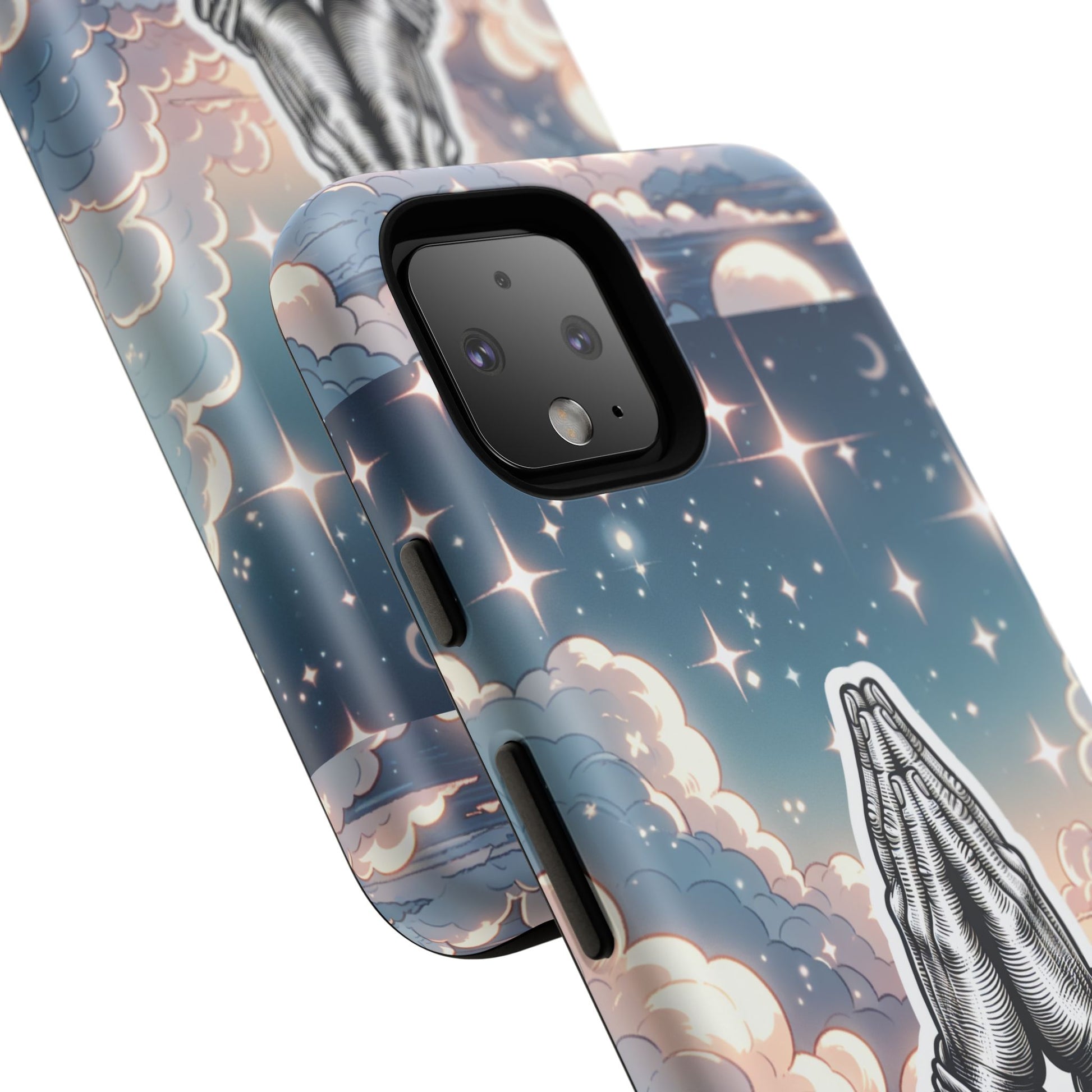 Protect your phone with these tough cases featuring praying hands above in the heavens design. Made of durable materials with impact resistance, shock absorption, and excellent outdoor weathering resistance. Suitable for adults, these cases offer dual-layer protection and support wireless charging. Perfect for those looking for stylish and protective phone accessories.