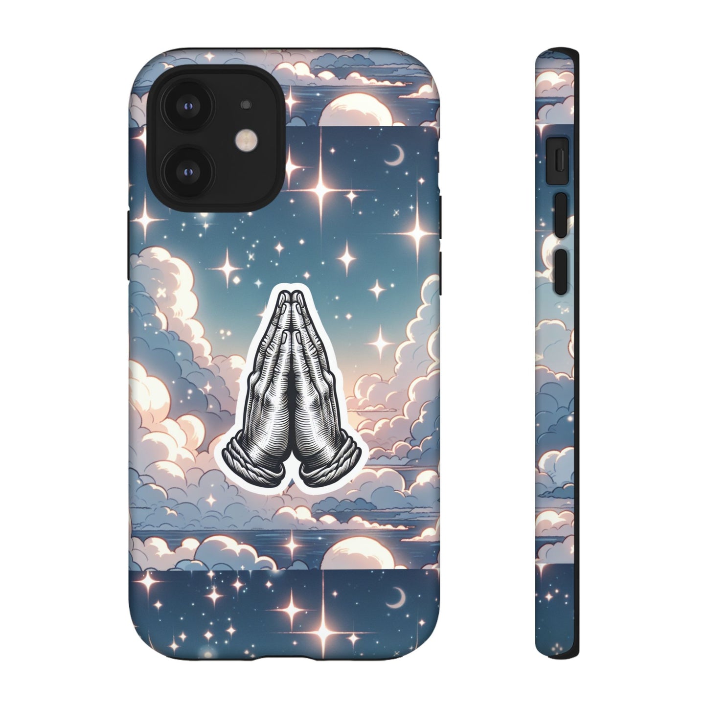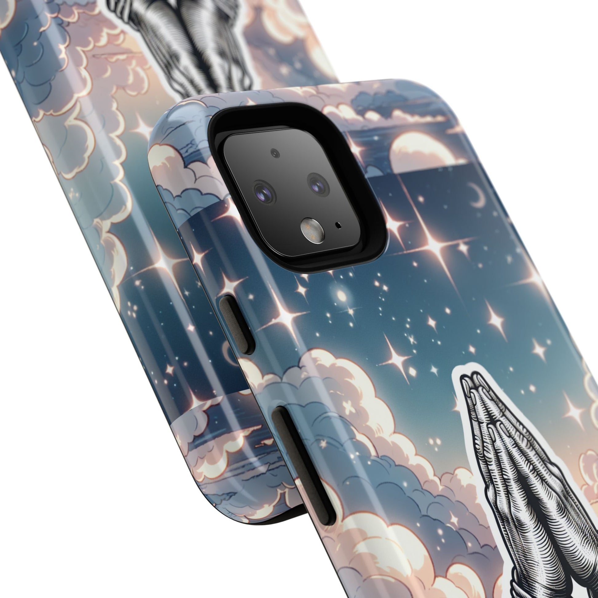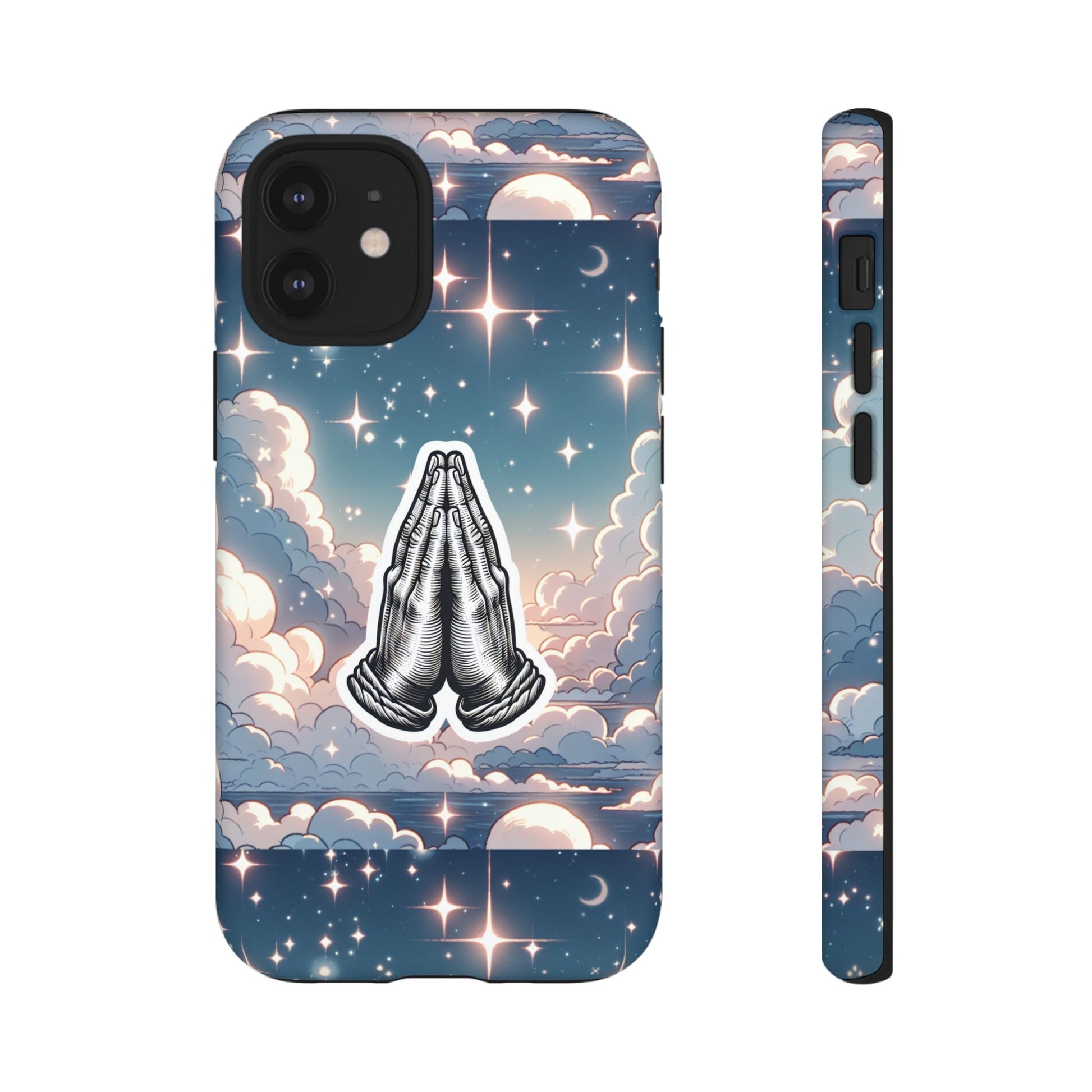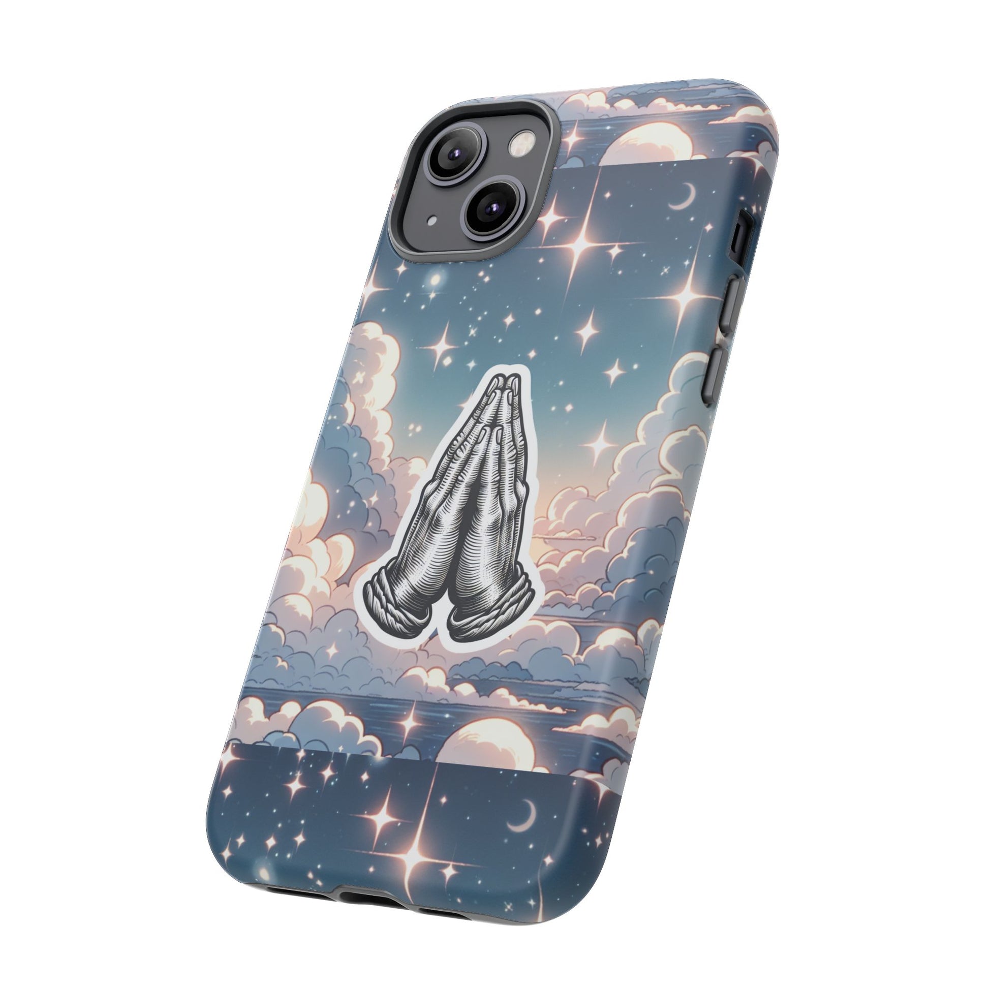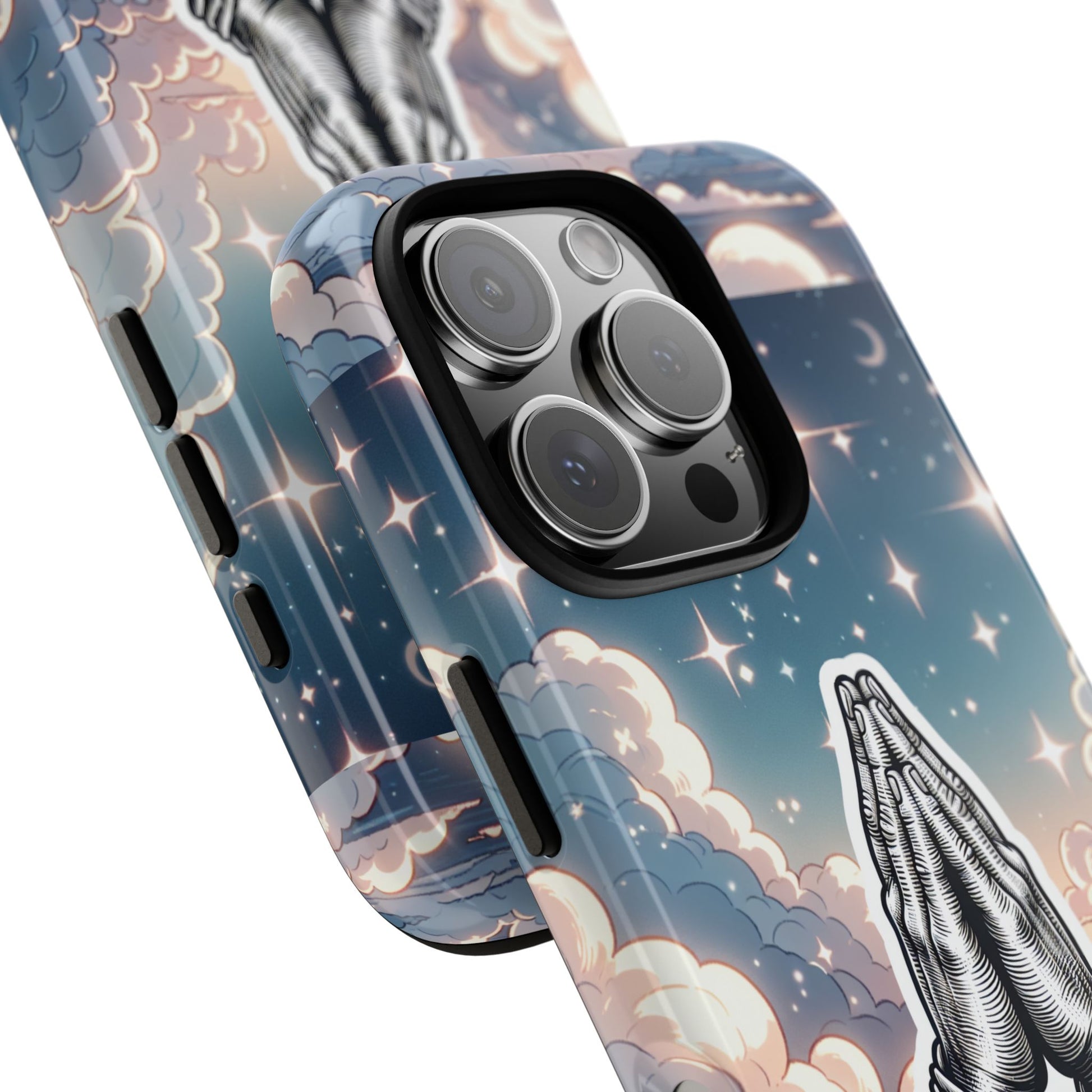Protect your phone with these tough cases featuring praying hands above in the heavens design. Made of durable materials with impact resistance, shock absorption, and excellent outdoor weathering resistance. Suitable for adults, these cases offer dual-layer protection and support wireless charging. Perfect for those looking for stylish and protective phone accessories.