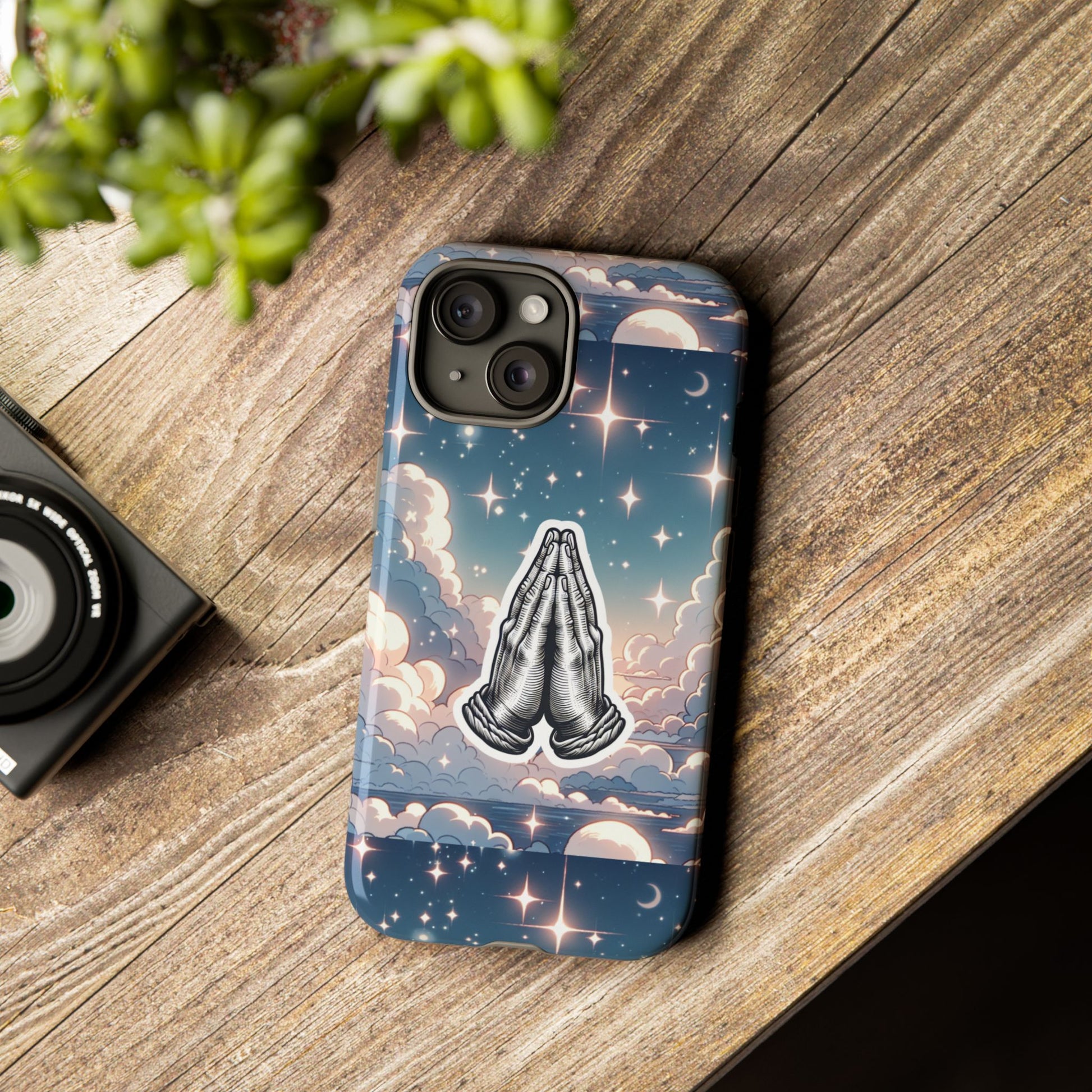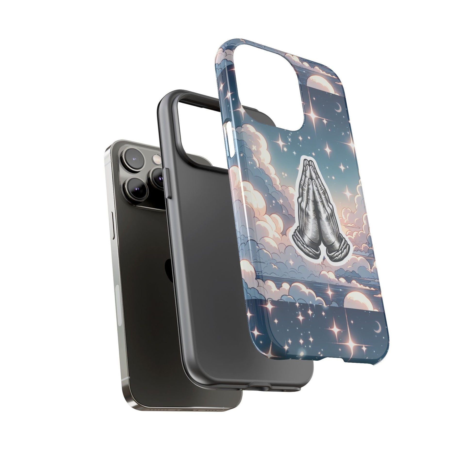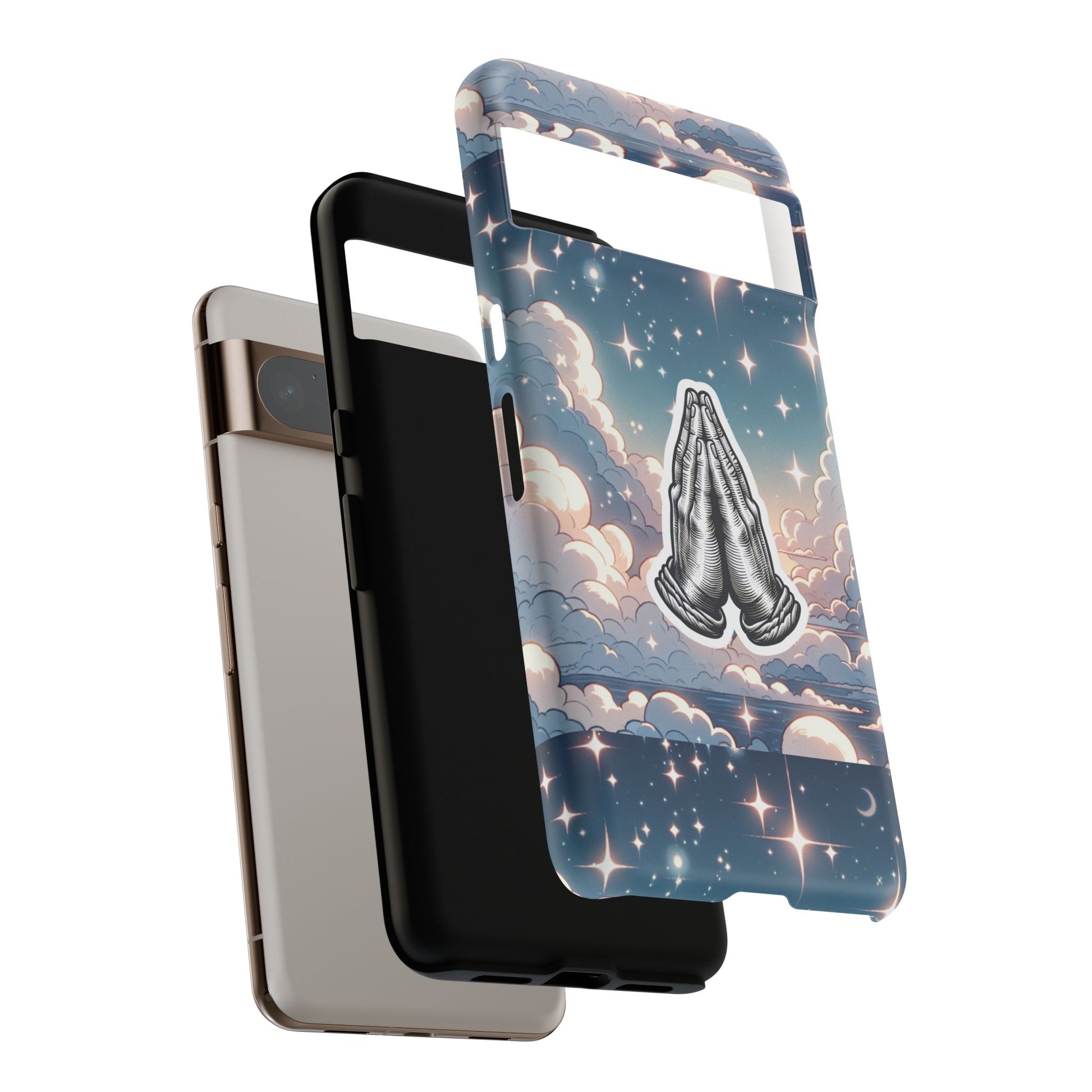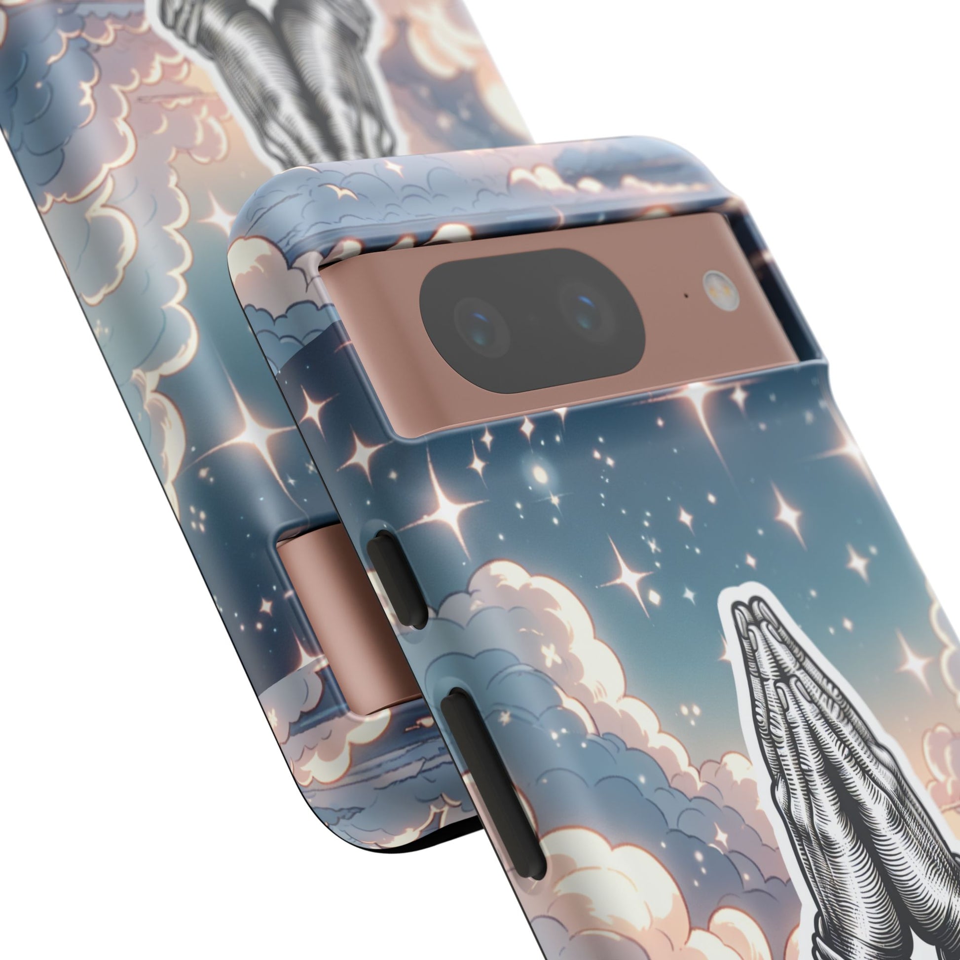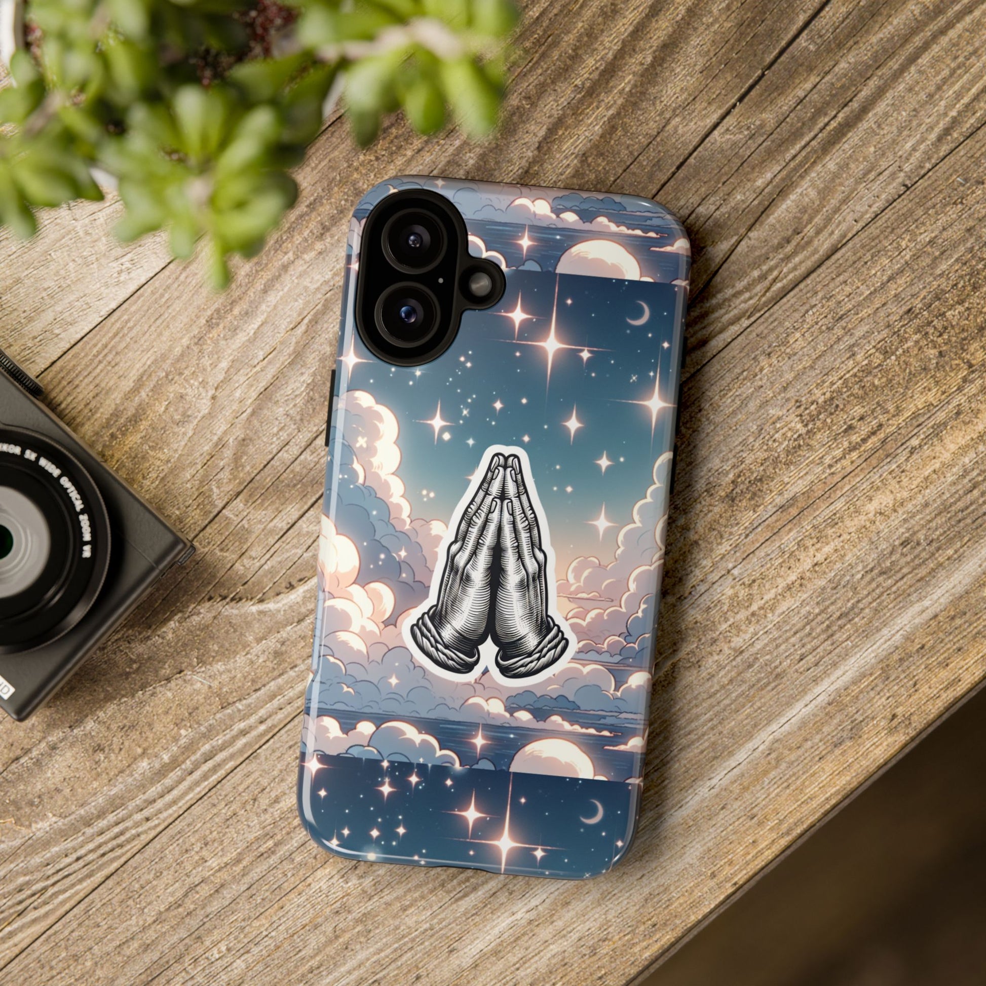 Protect your phone with these tough cases featuring praying hands above in the heavens design. Made of durable materials with impact resistance, shock absorption, and excellent outdoor weathering resistance. Suitable for adults, these cases offer dual-layer protection and support wireless charging. Perfect for those looking for stylish and protective phone accessories.