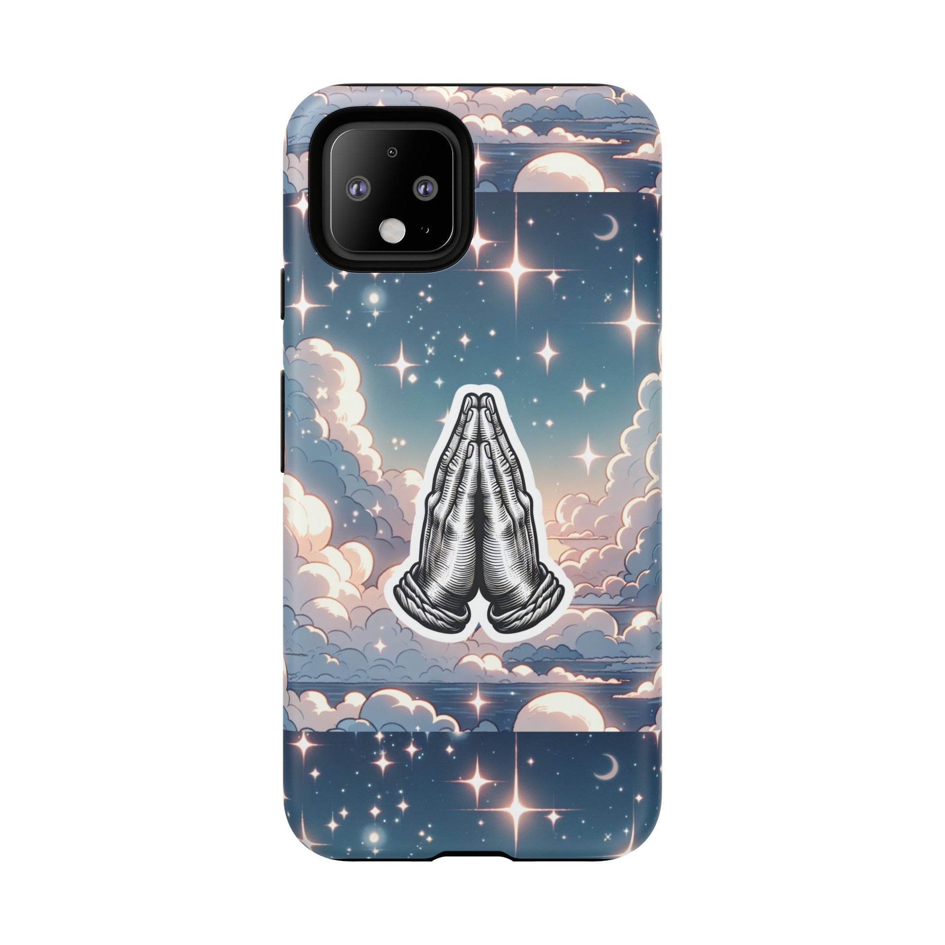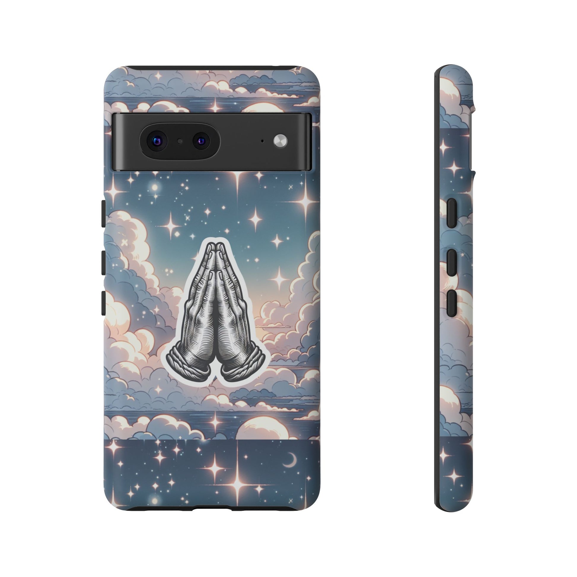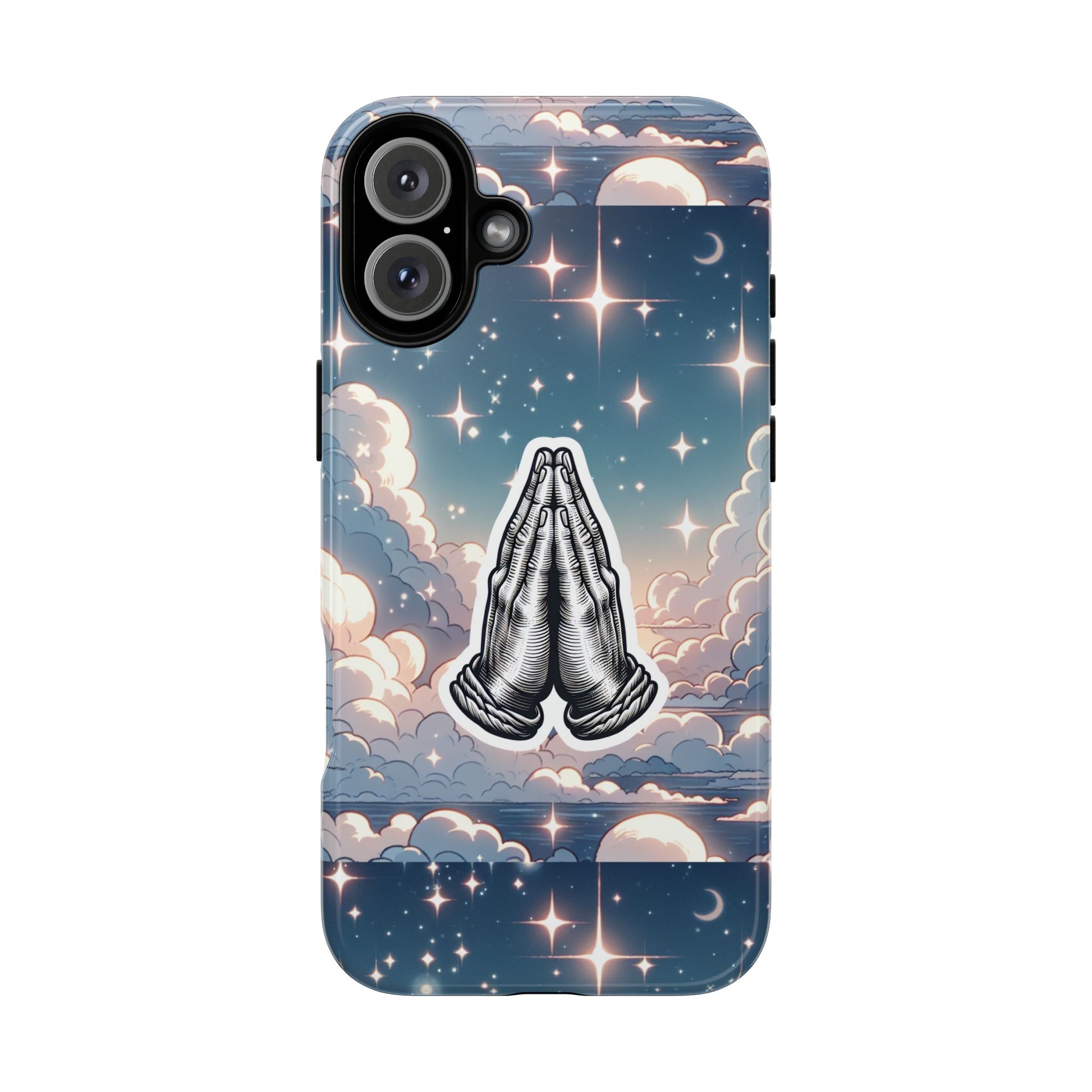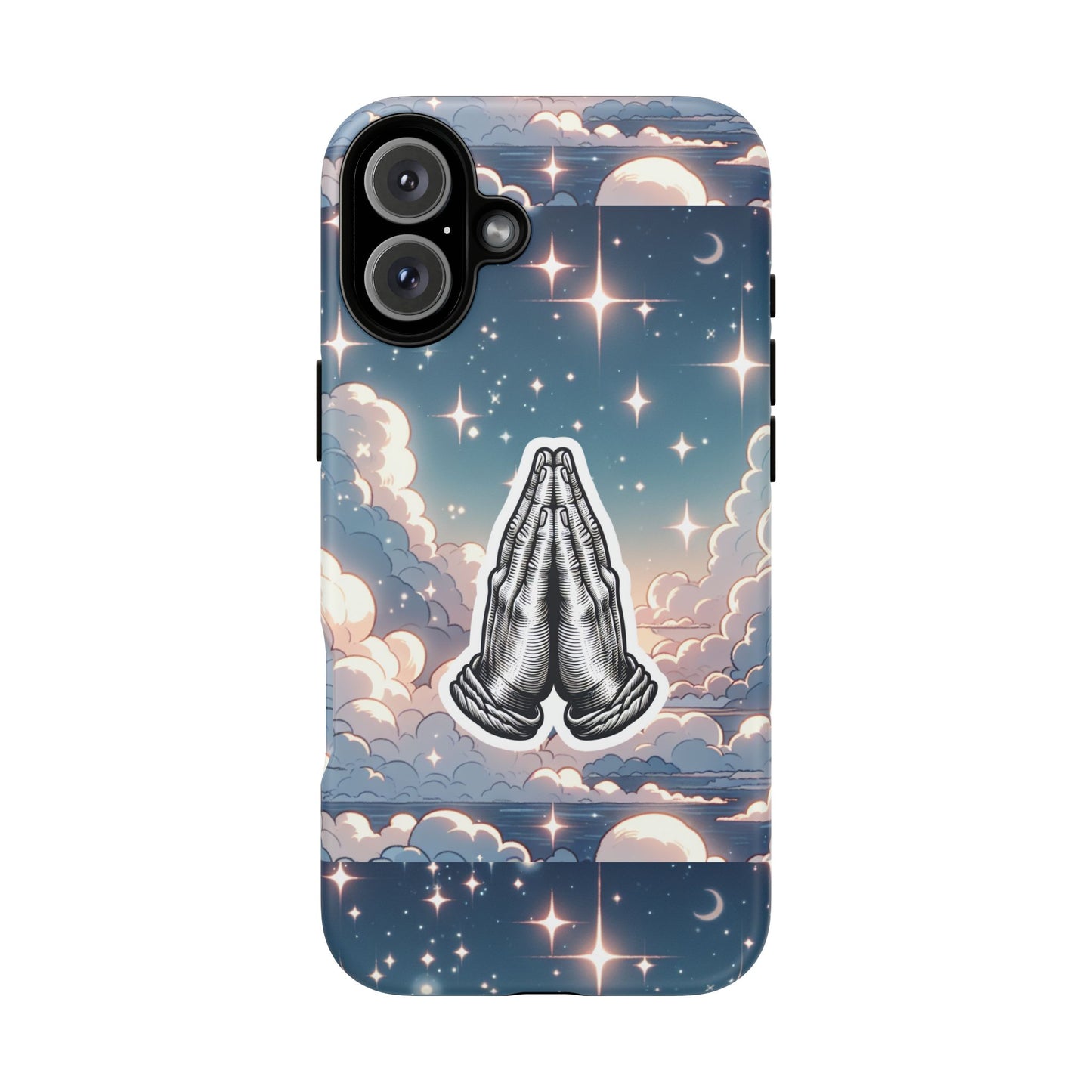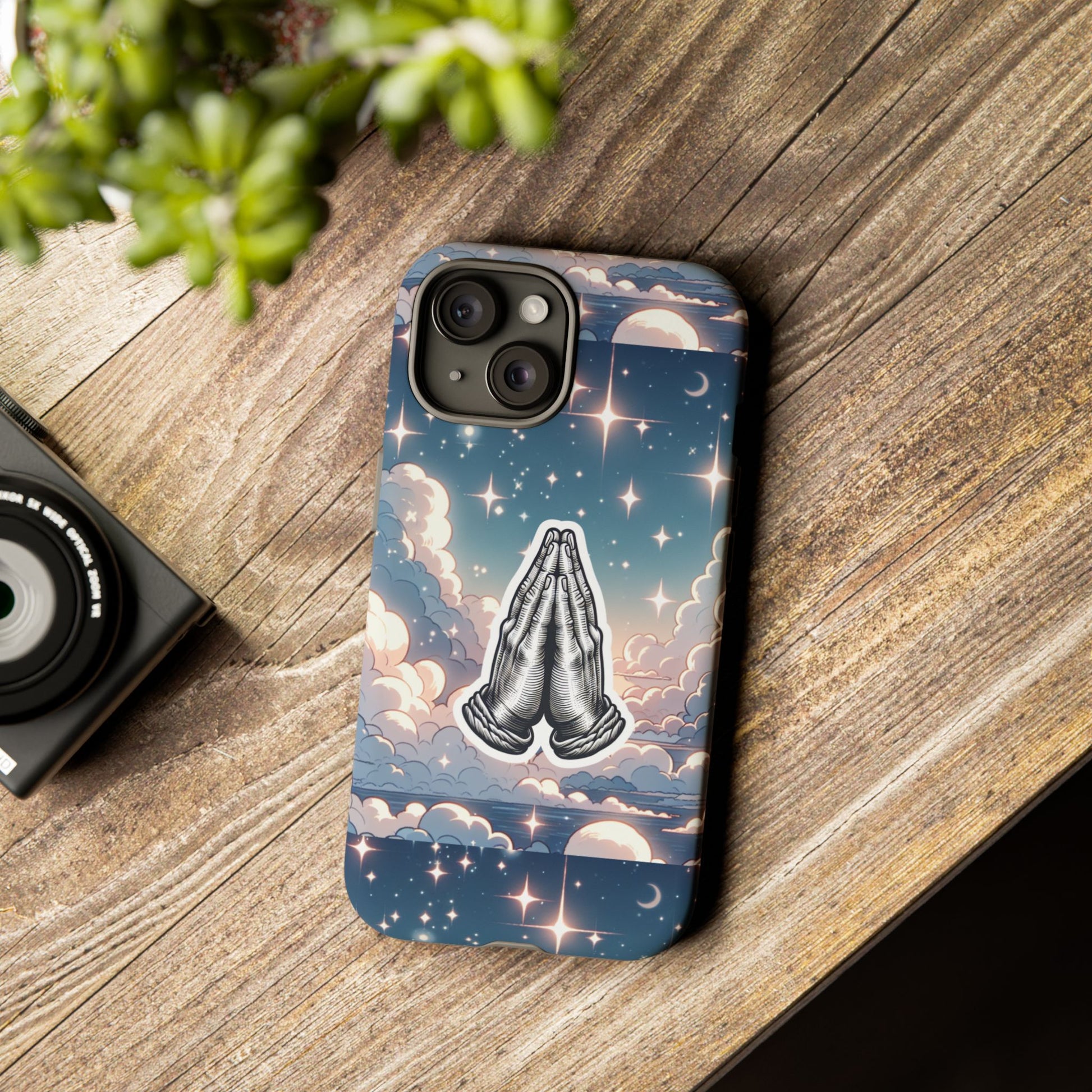 Protect your phone with these tough cases featuring praying hands above in the heavens design. Made of durable materials with impact resistance, shock absorption, and excellent outdoor weathering resistance. Suitable for adults, these cases offer dual-layer protection and support wireless charging. Perfect for those looking for stylish and protective phone accessories.
