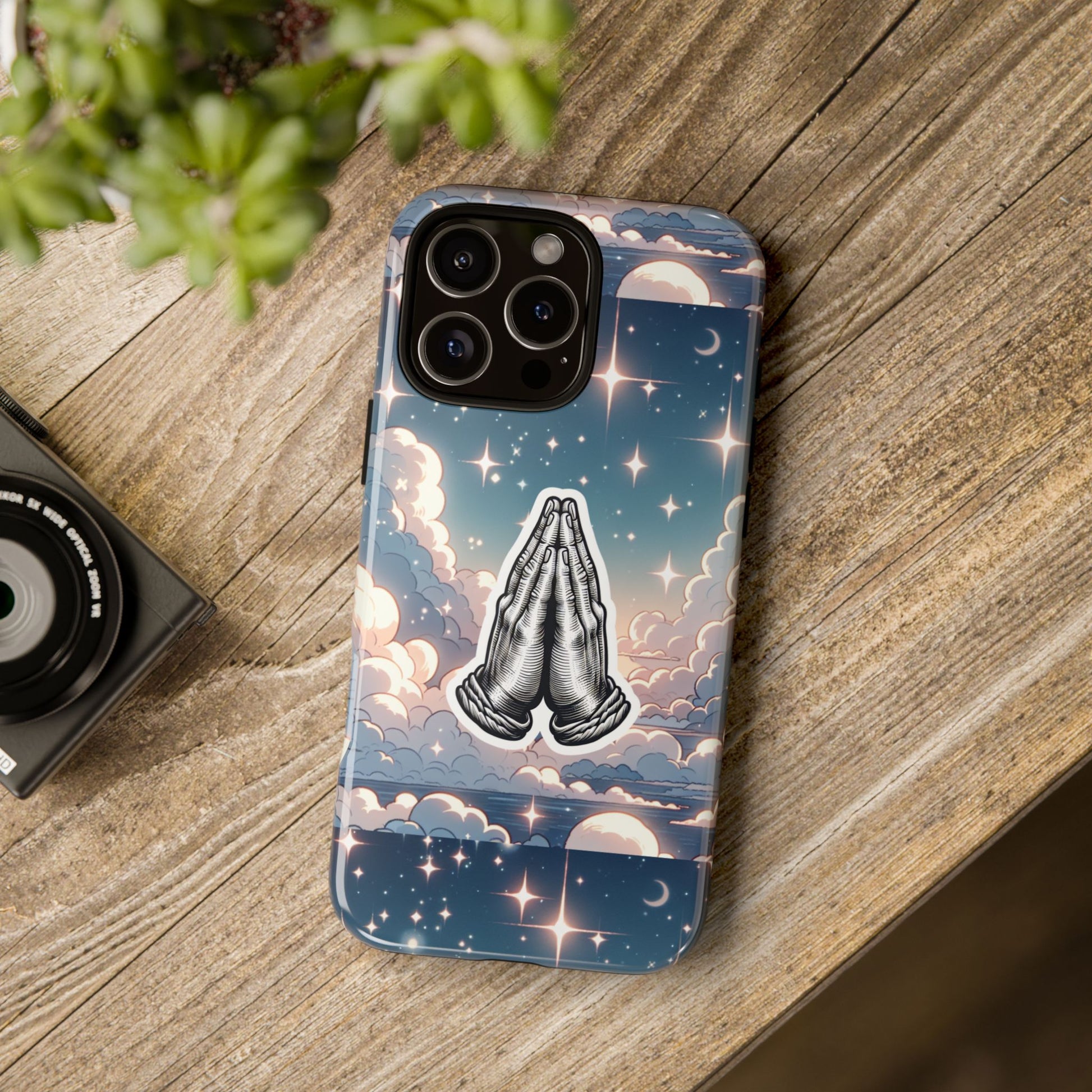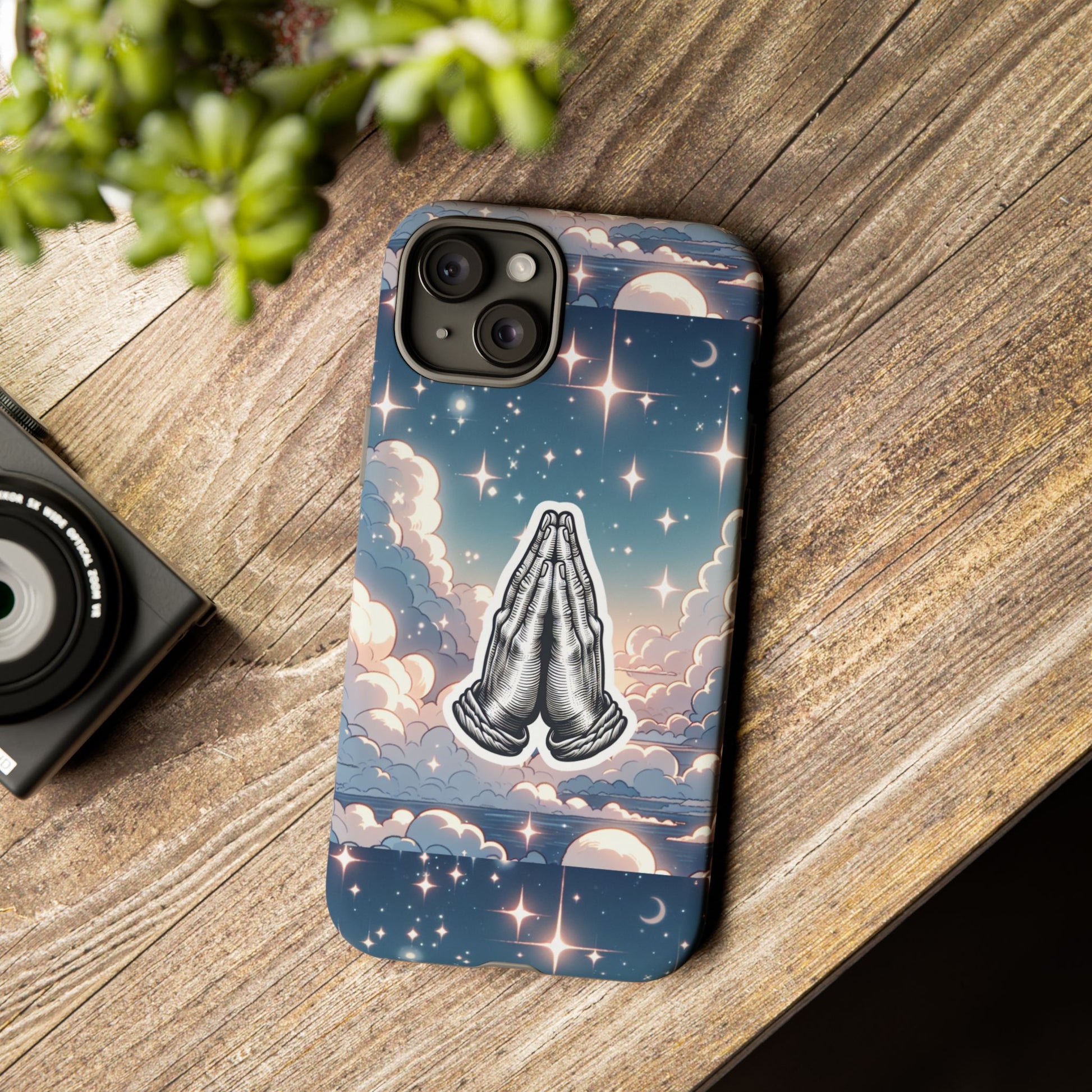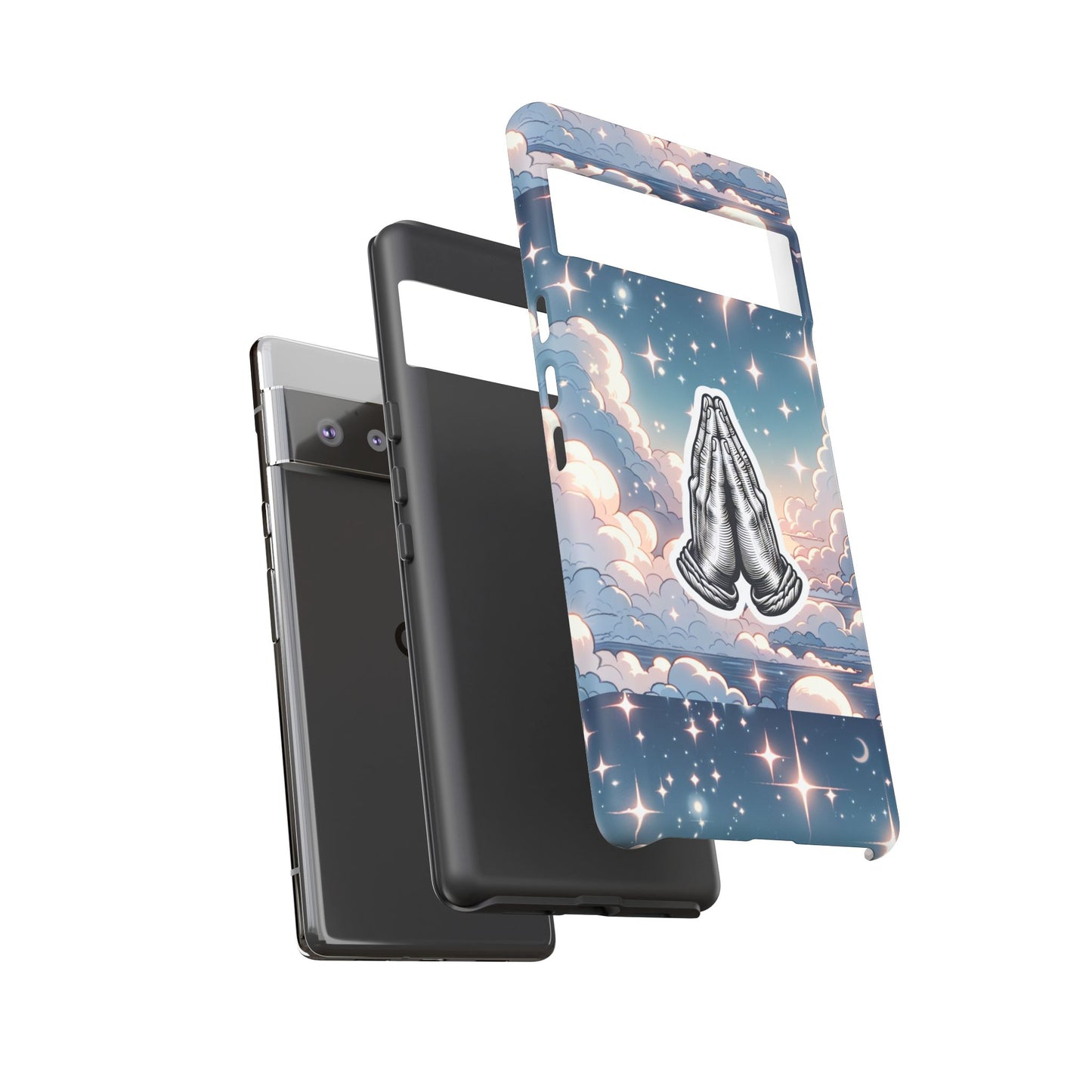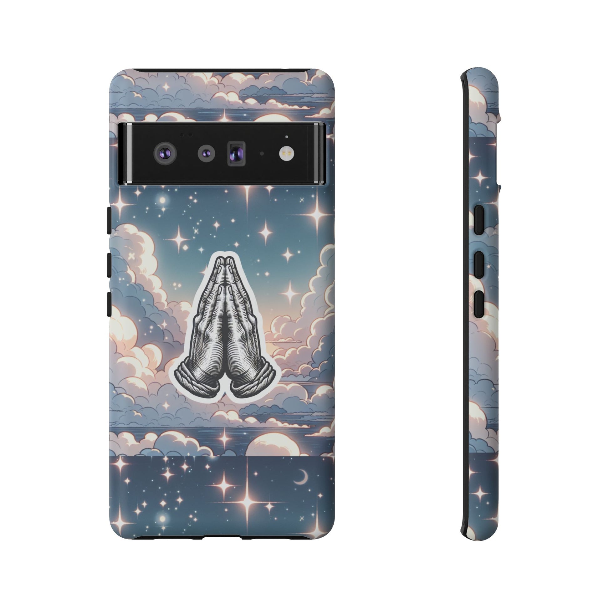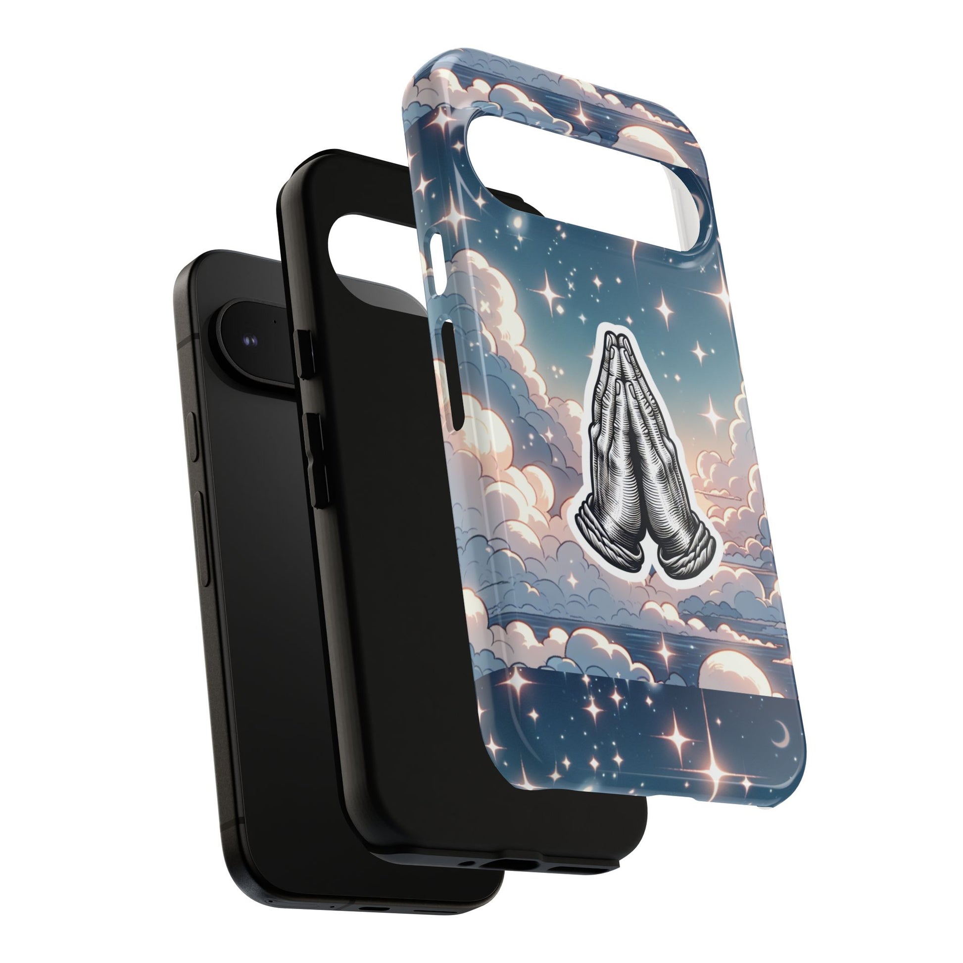 Protect your phone with these tough cases featuring praying hands above in the heavens design. Made of durable materials with impact resistance, shock absorption, and excellent outdoor weathering resistance. Suitable for adults, these cases offer dual-layer protection and support wireless charging. Perfect for those looking for stylish and protective phone accessories.