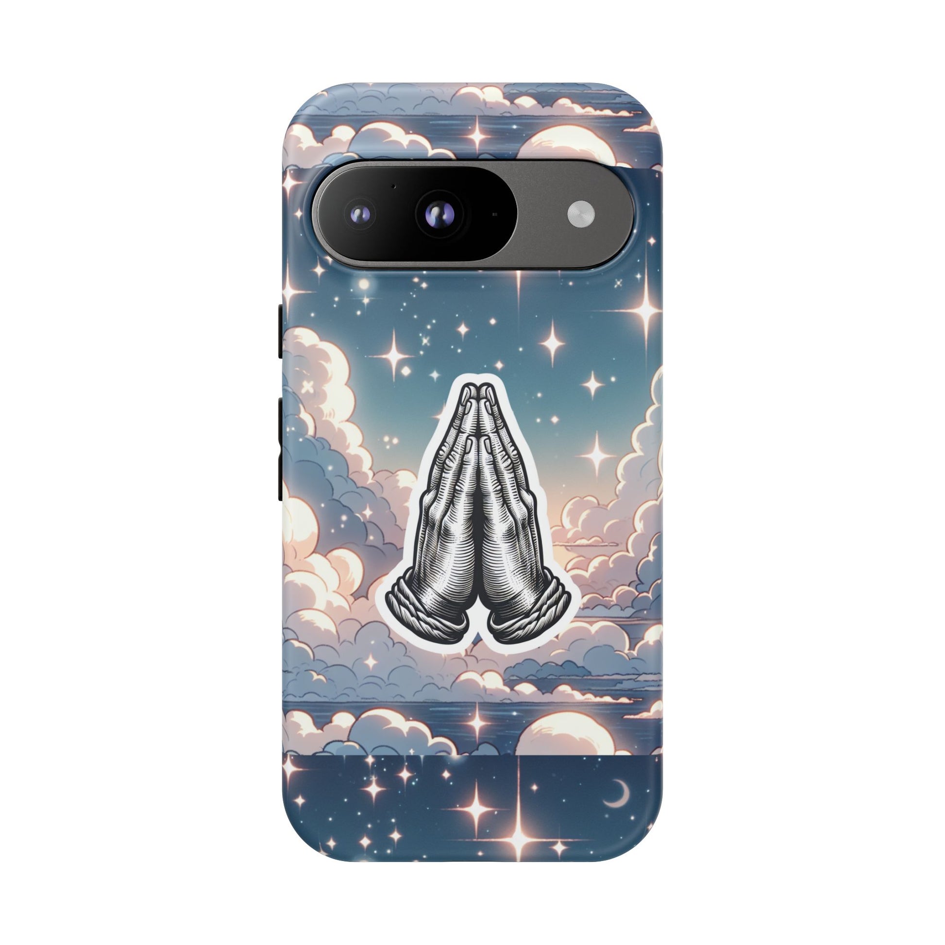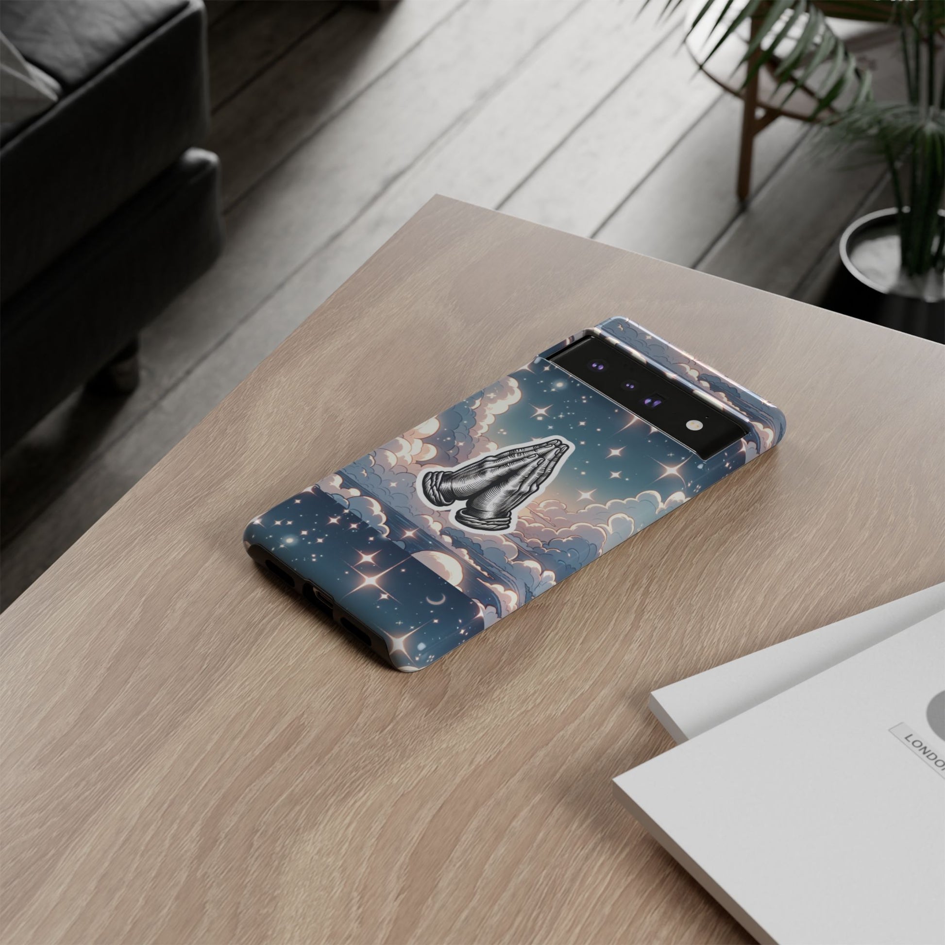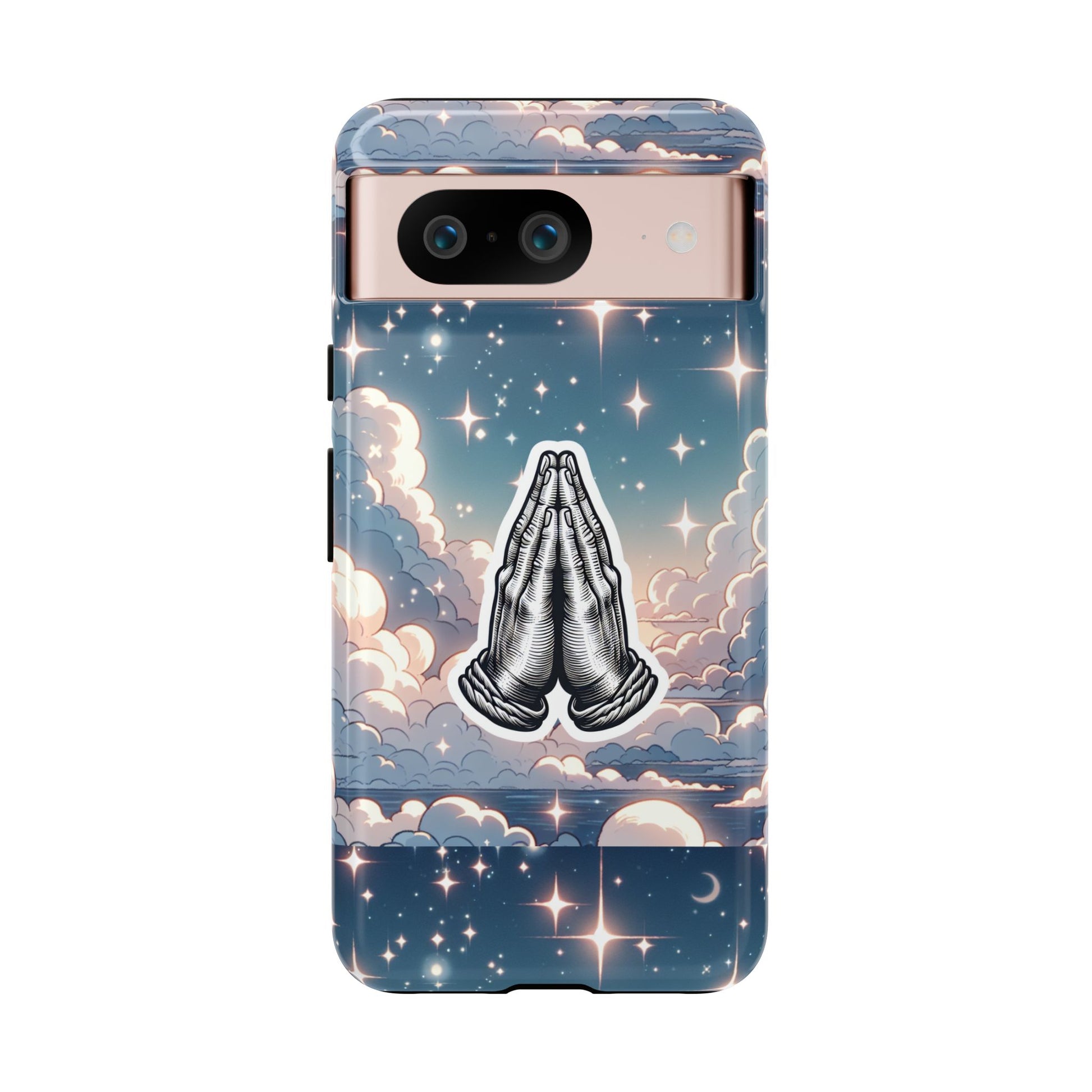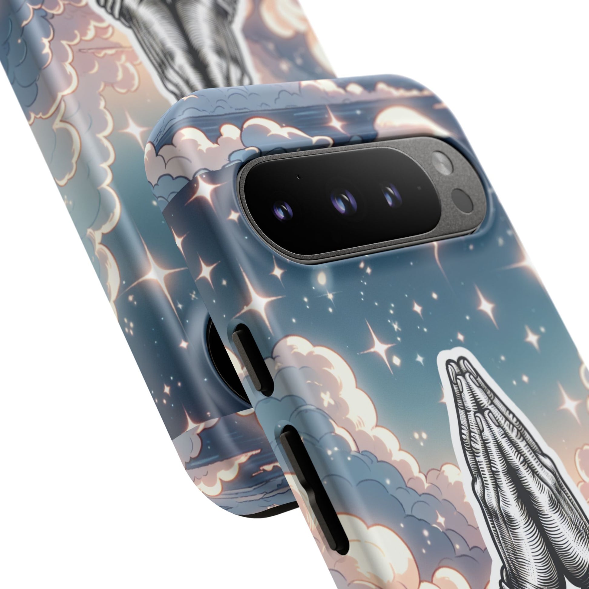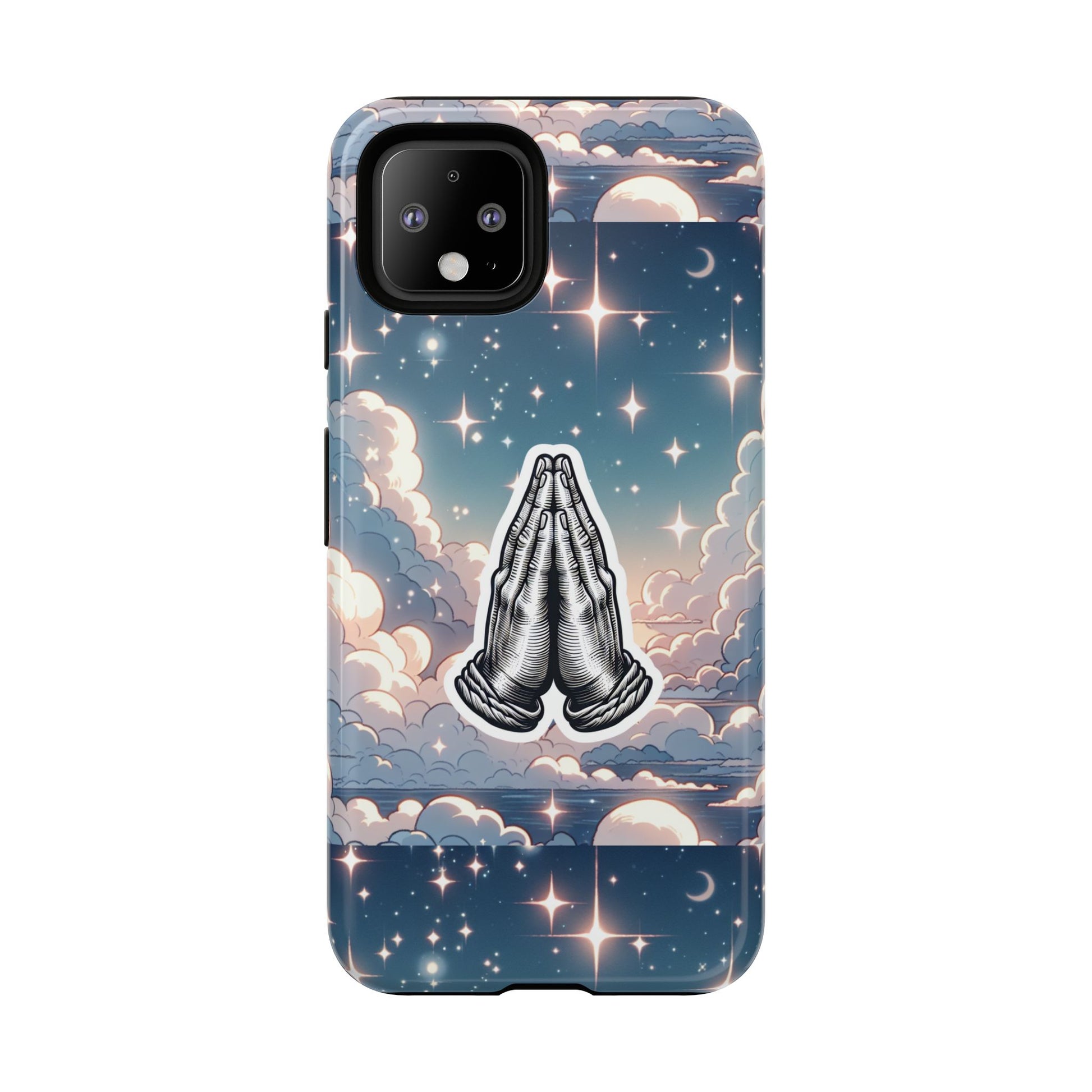 Protect your phone with these tough cases featuring praying hands above in the heavens design. Made of durable materials with impact resistance, shock absorption, and excellent outdoor weathering resistance. Suitable for adults, these cases offer dual-layer protection and support wireless charging. Perfect for those looking for stylish and protective phone accessories.