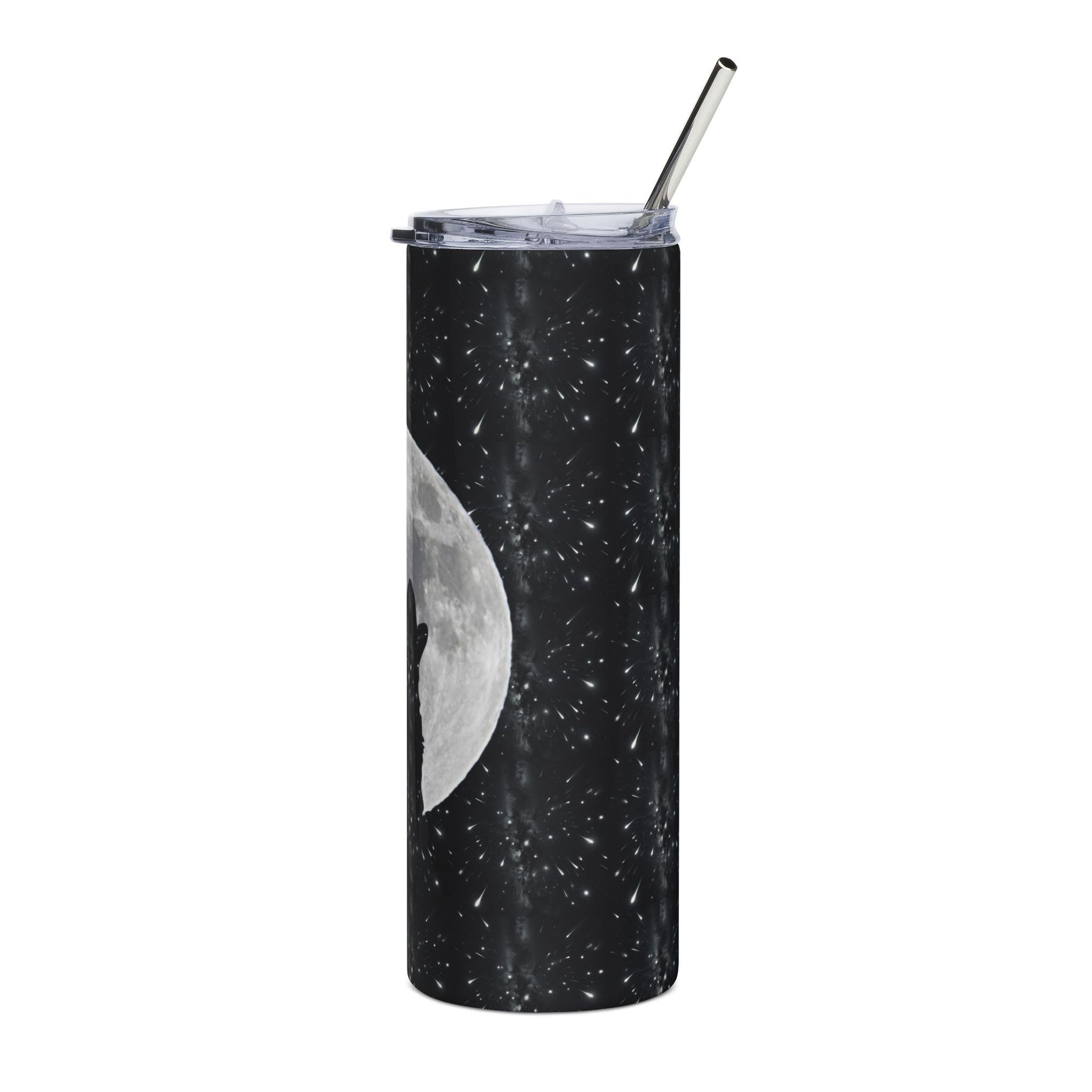 A slim, 20 oz stainless steel tumbler wrapped in a moody, winter-night design. A lone wolf silhouette lifts its head against a luminous full moon, while soft snowflakes drift across a deep black background. The glossy protective finish gives the artwork depth and keeps colors vivid through daily use. With included lid and straw, this tumbler slips easily into cup holders and backpacks, keeping you warm with coffee or chilled with iced drinks on the go. It’s for nights spent by the campfire, early morning drives, or quiet moments of reflection when the world feels still and star-silvered.